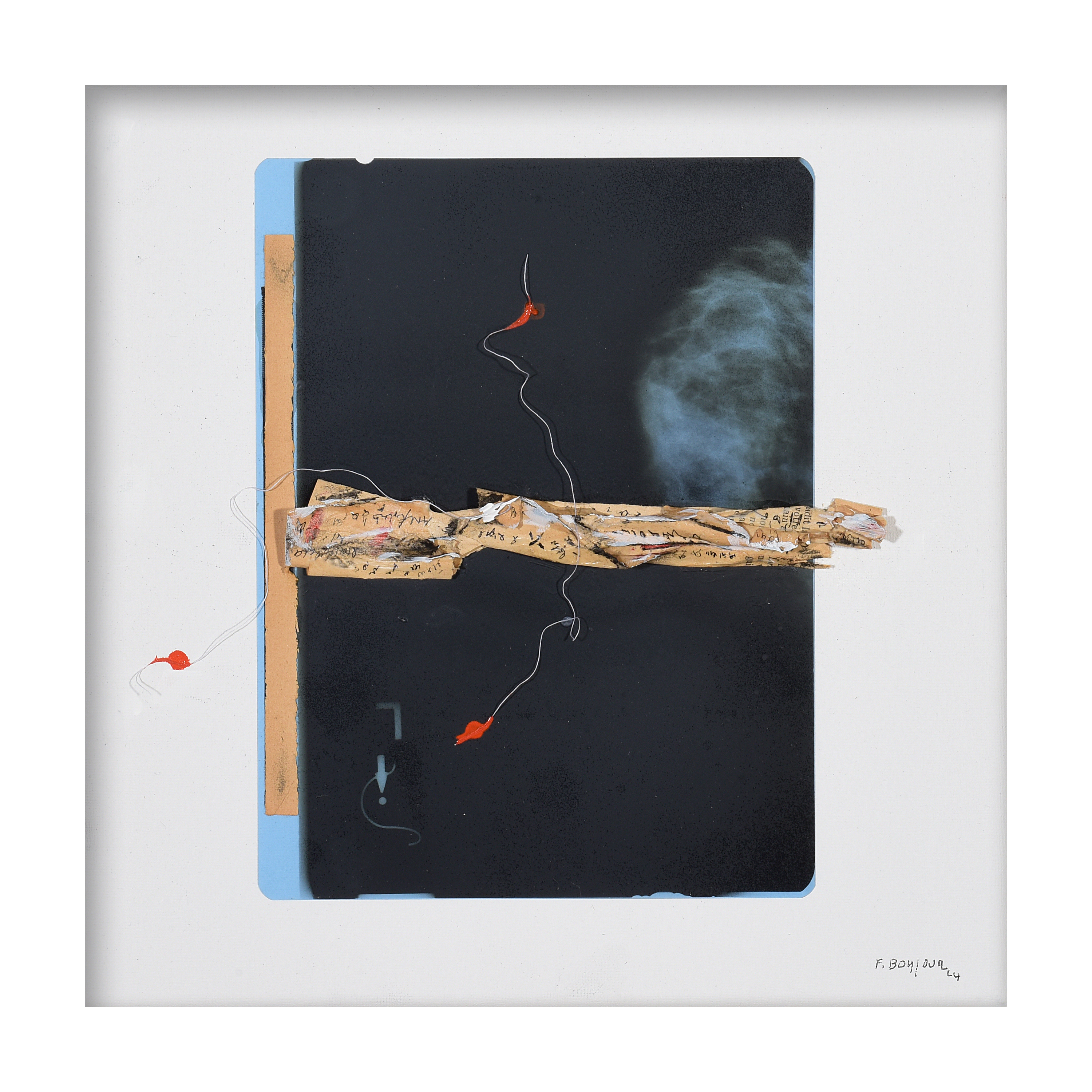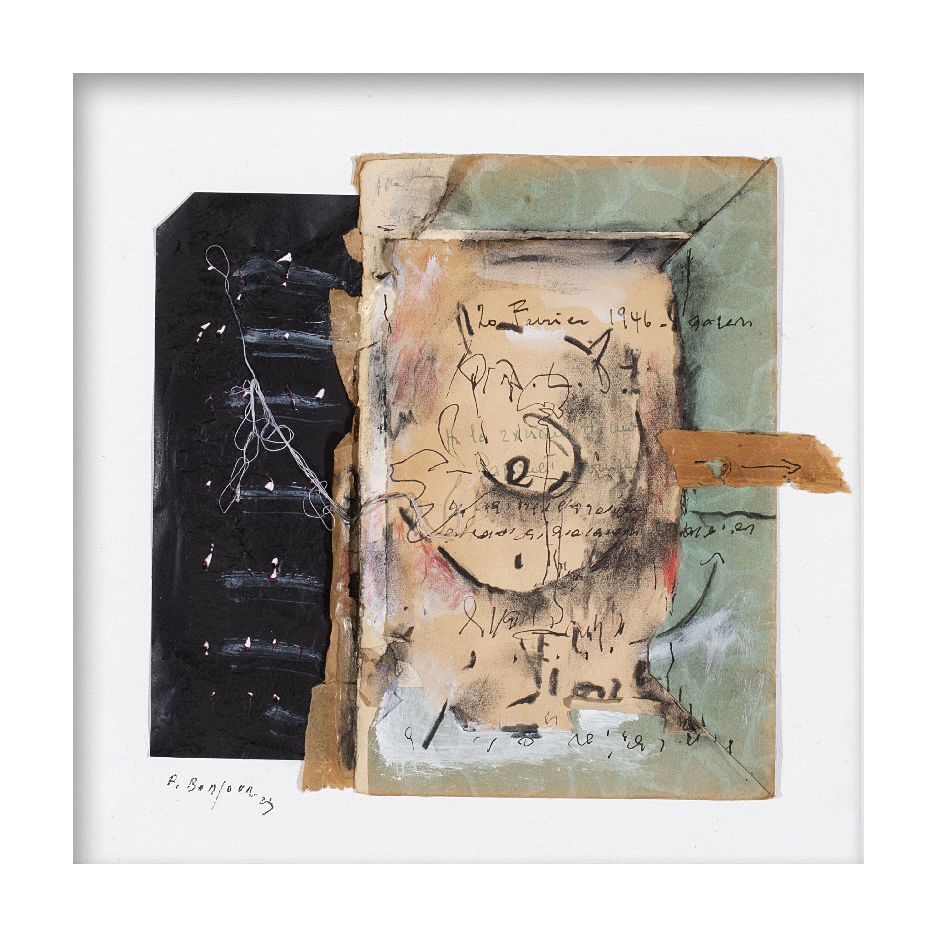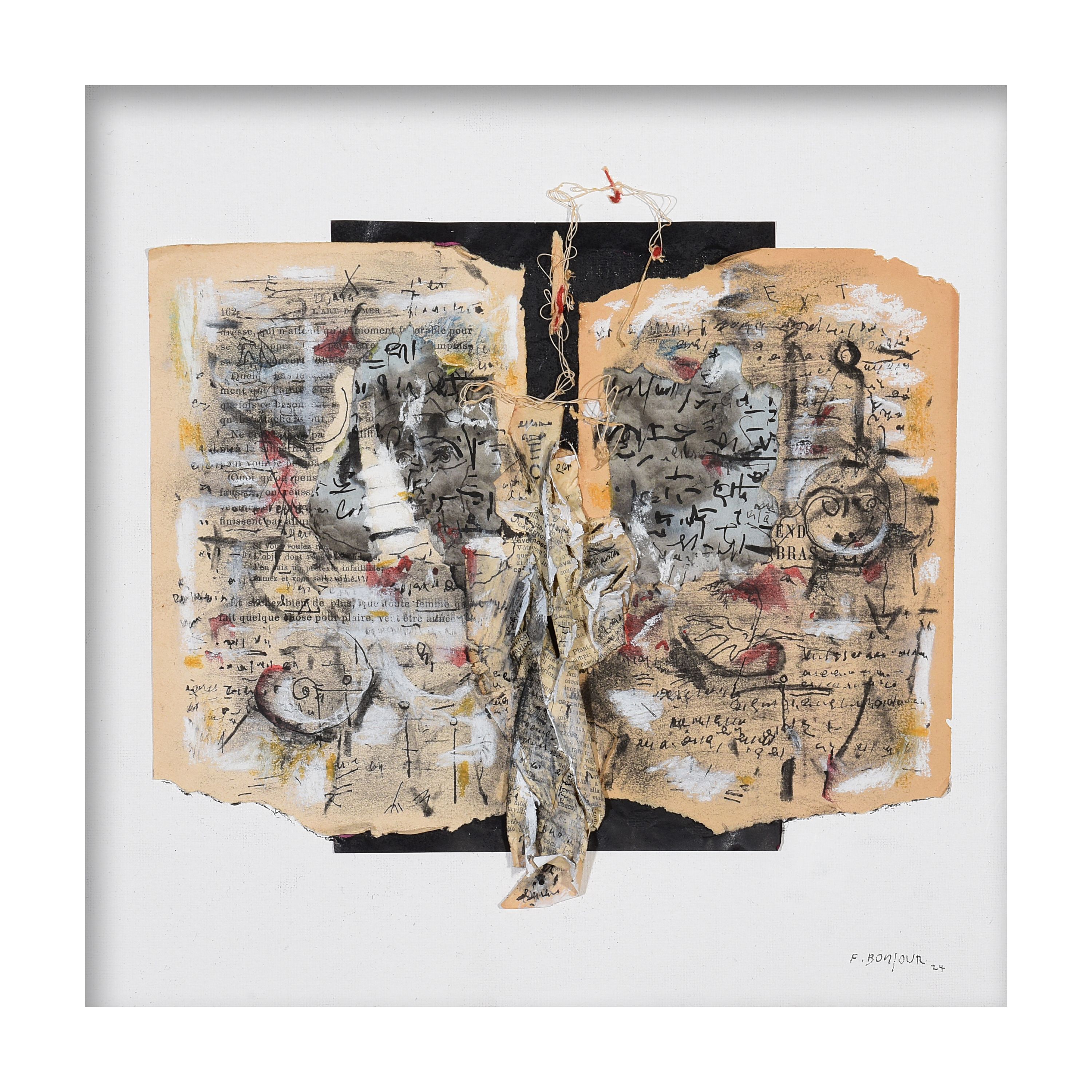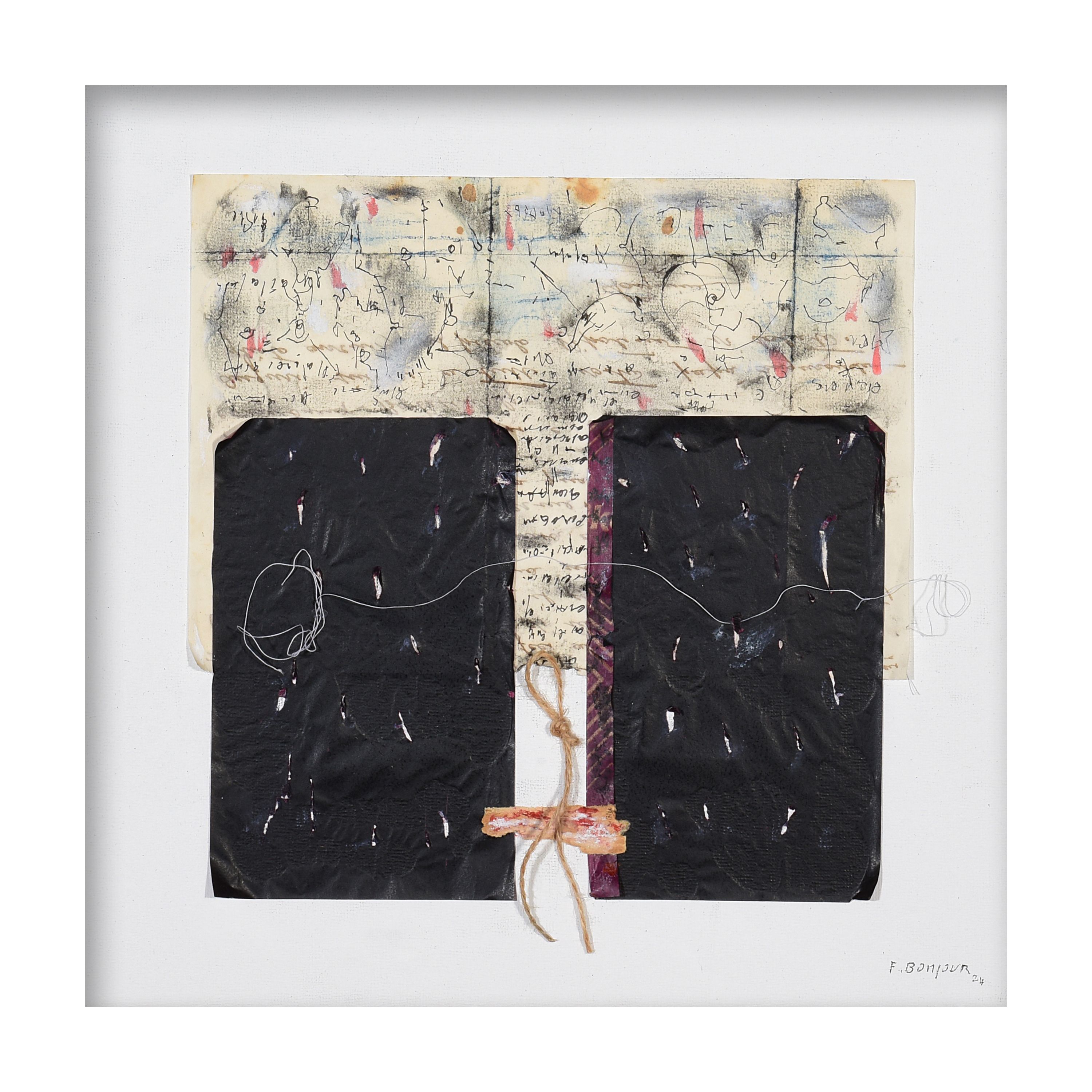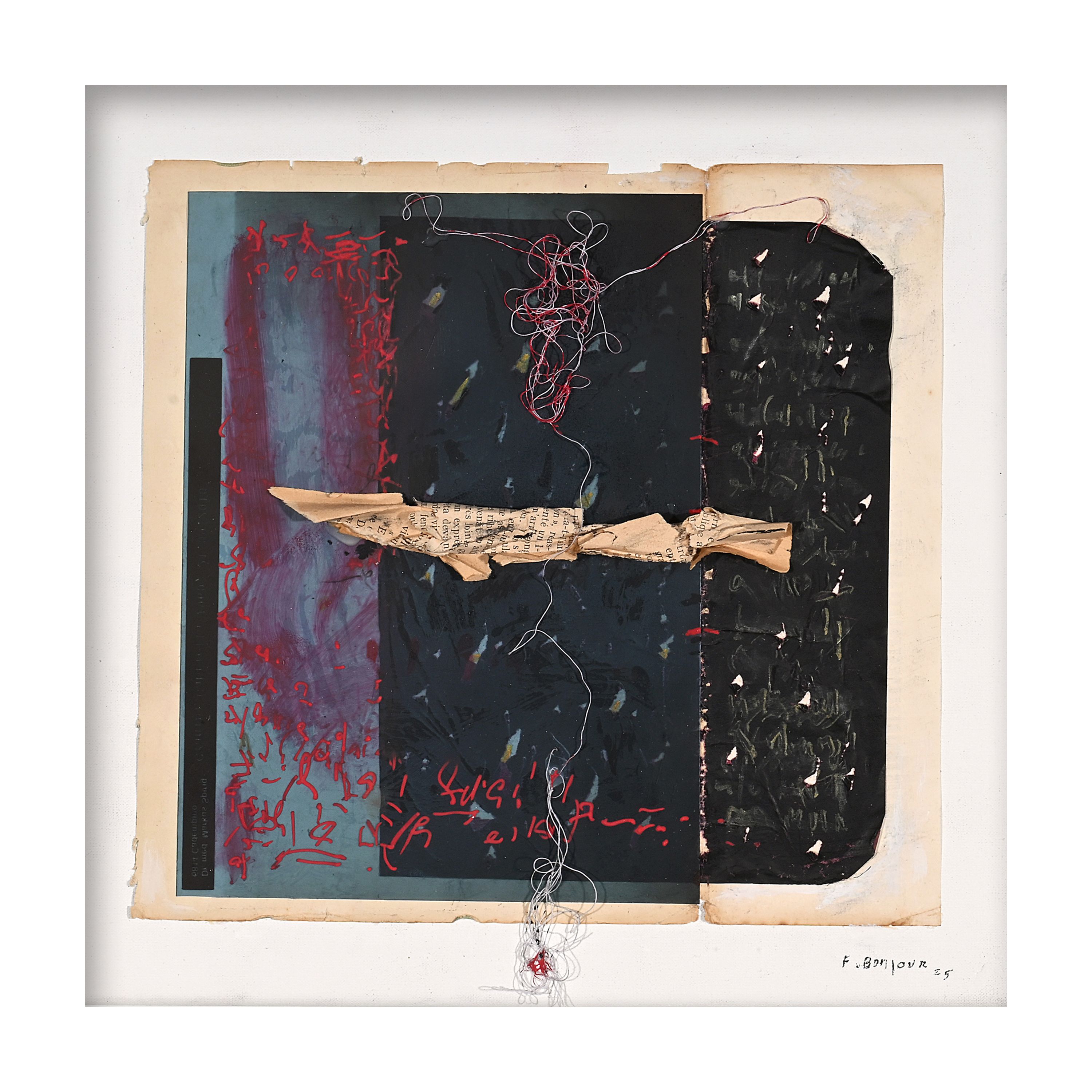 Bonjour adopts an expressive language of great material richness, juxtaposing heterogeneous elements with surprising harmony. His paintings often transcend the boundaries of the canvas, taking on an almost three-dimensional dimension thanks to the inclusion of unconventional objects and materials. On backgrounds prepared with mixed techniques, the artist applies sheets of paper, scraps of fabric, pages of books worn out by time, newspaper clippings, interweaving them with threads of string, ropes, wood fragments, red wax, broken glass and pigments. These poor materials - the 'skin of the city' as he ideally defines it - carry with them the echo of human presences, evoking lives and stories both past and future. Writing plays a central role in his compositions: elegant words and calligraphies appear, sometimes clearly legible, more often reduced to mysterious and indecipherable signs. This fusion of text and image recalls the legacy of Visual Poetry, but Bonjour reworks it in an entirely personal way. The written page is transformed into a visual element: it can be burnt at the edges, torn or covered with invented graphisms, becoming itself a surface to be contemplated. The combination of these verbal and iconic signs builds a dense and meaningful texture. Nothing is left to chance: the artist composes the different fragments with meticulous care, balancing solids and voids, light and dark, rigidity and fluidity. The result is works of refined elegance, in which the layering of materials creates physical and conceptual depth. Every detail - from the small piece of wax to a thin thread running through the paper - contributes to the overall meaning, inviting the observer into a silent conversation with the work. The result is a unique visual language, sober but incisive, capable of speaking on different levels: cultured and at the same time immediate, intimate and universal.