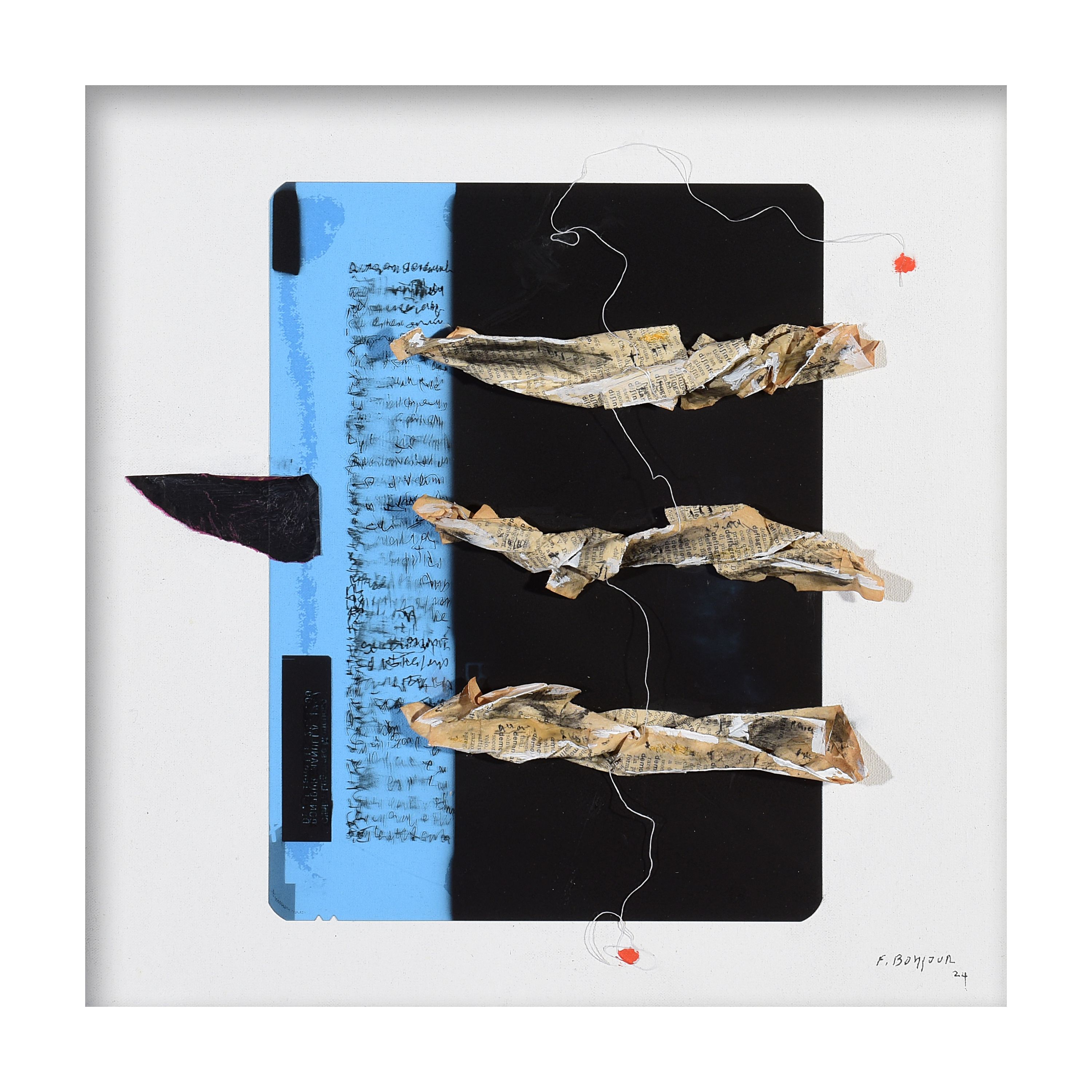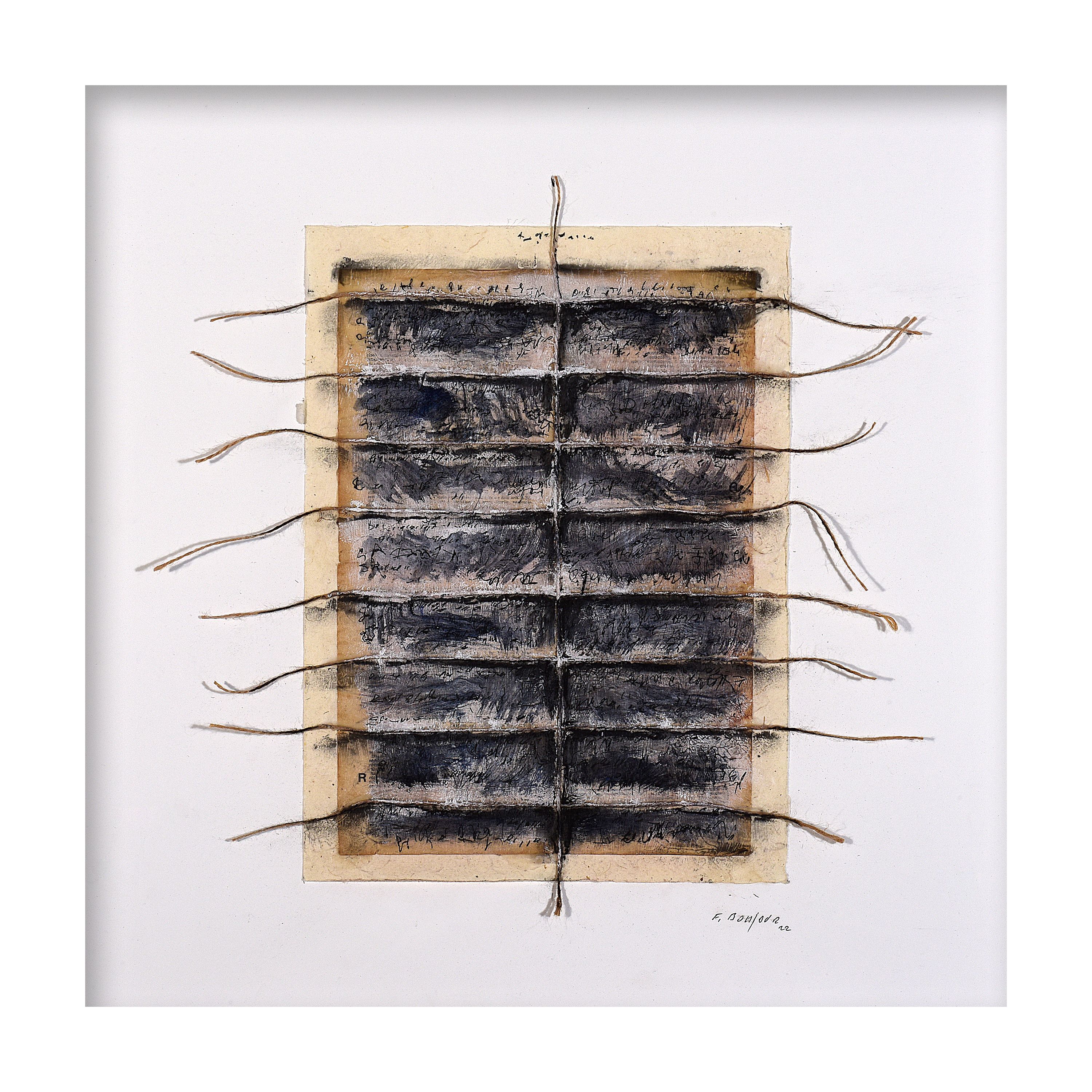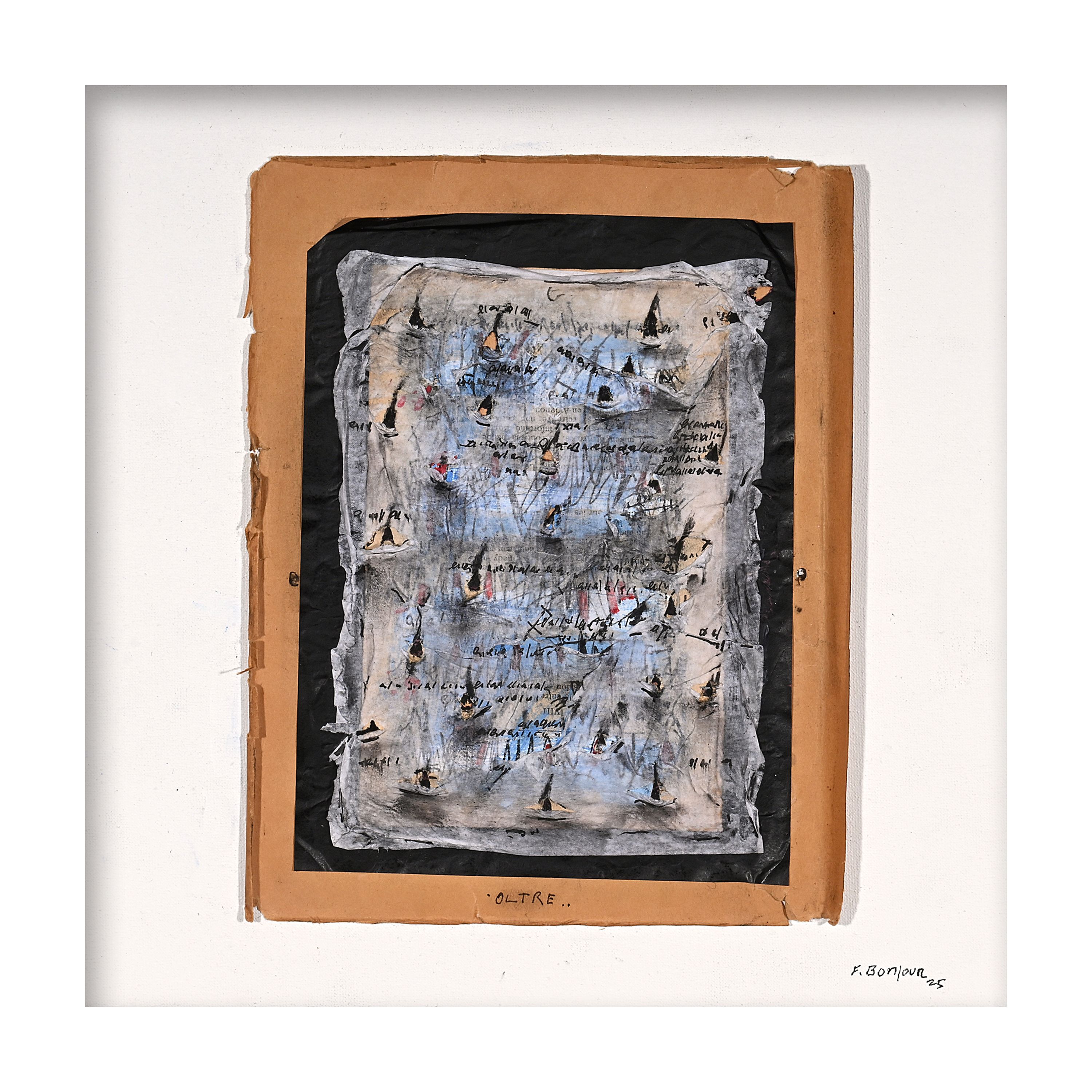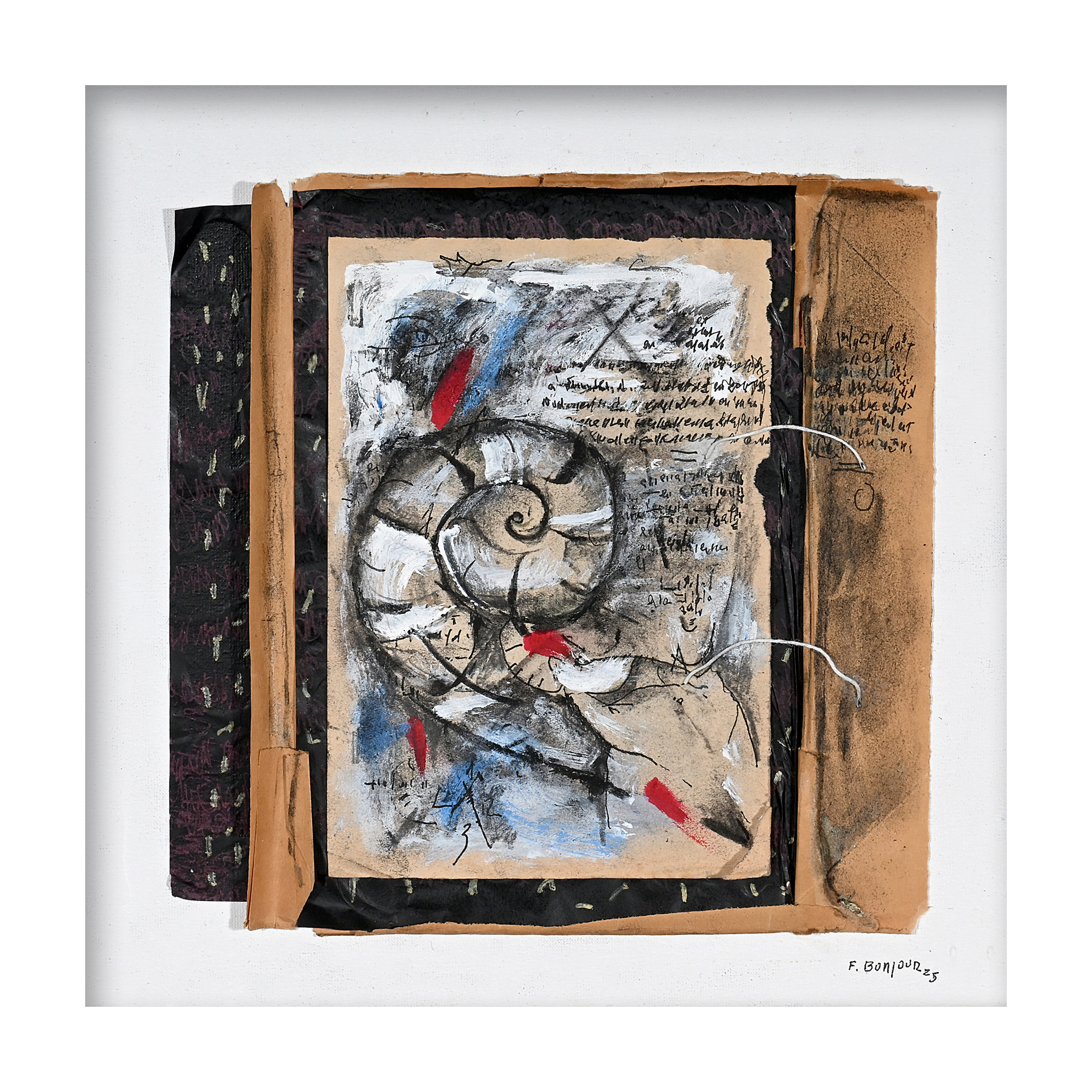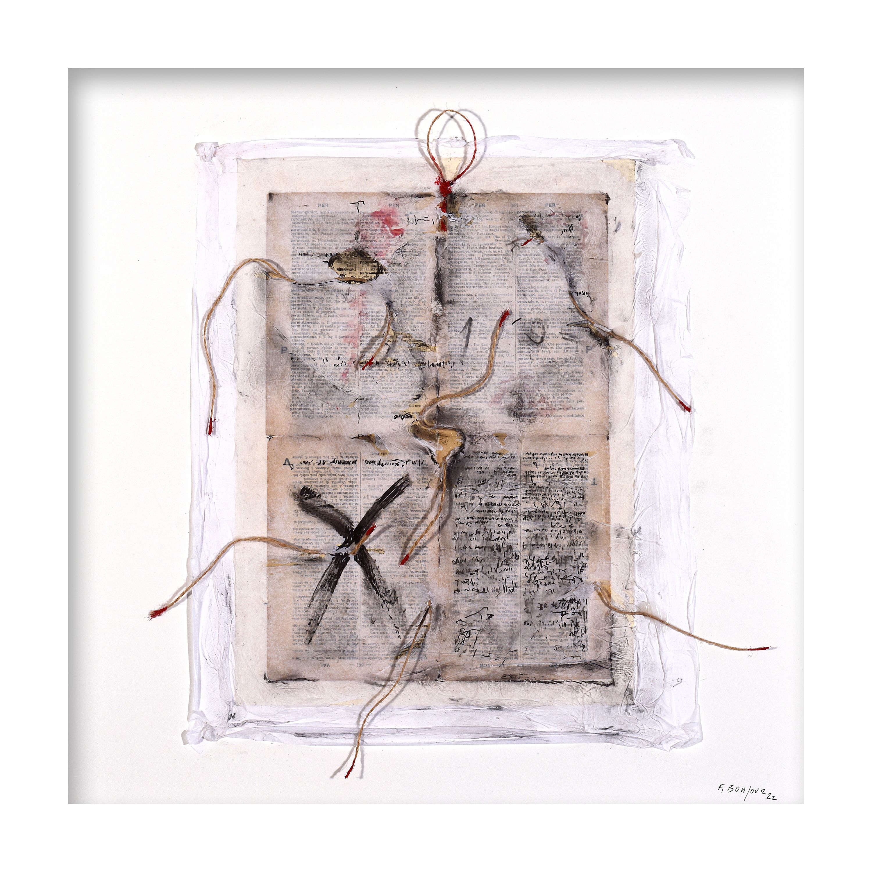Bonjour adopts an expressive language of great material richness, juxtaposing heterogeneous elements with surprising harmony. His paintings often transcend the boundaries of the canvas, taking on an almost three-dimensional dimension thanks to the inclusion of unconventional objects and materials. On backgrounds prepared with mixed techniques, the artist applies sheets of paper, scraps of fabric, pages of books worn out by time, newspaper clippings, interweaving them with threads of string, ropes, wood fragments, red wax, broken glass and pigments. These poor materials - the 'skin of the city' as he ideally defines it - carry with them the echo of human presences, evoking lives and stories both past and future. Writing plays a central role in his compositions: elegant words and calligraphies appear, sometimes clearly legible, more often reduced to mysterious and indecipherable signs. This fusion of text and image recalls the legacy of Visual Poetry, but Bonjour reworks it in an entirely personal way. The written page is transformed into a visual element: it can be burnt at the edges, torn or covered with invented graphisms, becoming itself a surface to be contemplated. The combination of these verbal and iconic signs builds a dense and meaningful texture. Nothing is left to chance: the artist composes the different fragments with meticulous care, balancing solids and voids, light and dark, rigidity and fluidity. The result is works of refined elegance, in which the layering of materials creates physical and conceptual depth. Every detail - from the small piece of wax to a thin thread running through the paper - contributes to the overall meaning, inviting the observer into a silent conversation with the work. The result is a unique visual language, sober but incisive, capable of speaking on different levels: cultured and at the same time immediate, intimate and universal.
