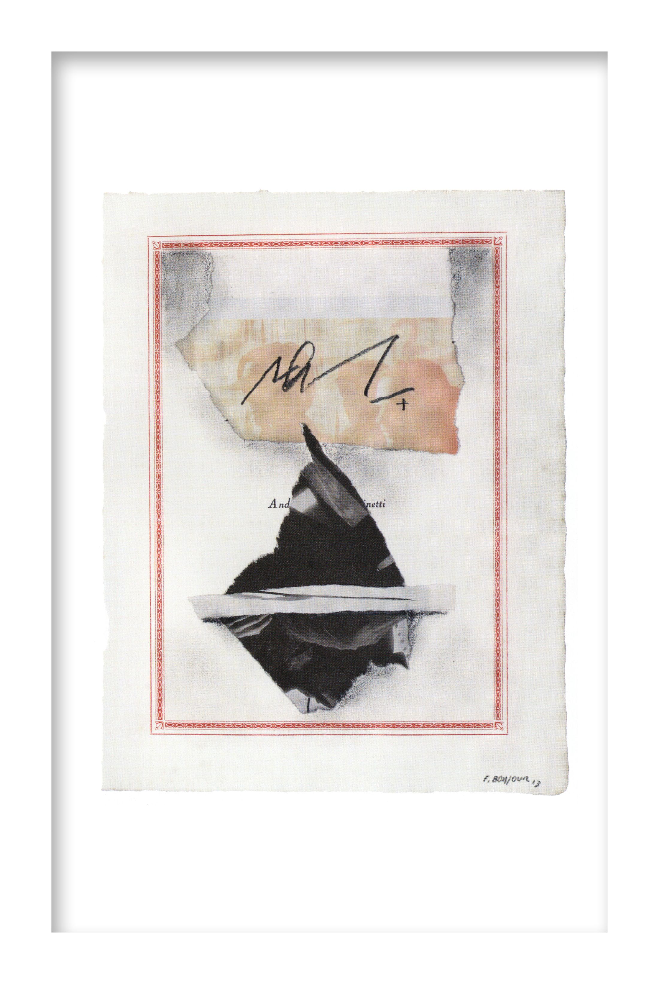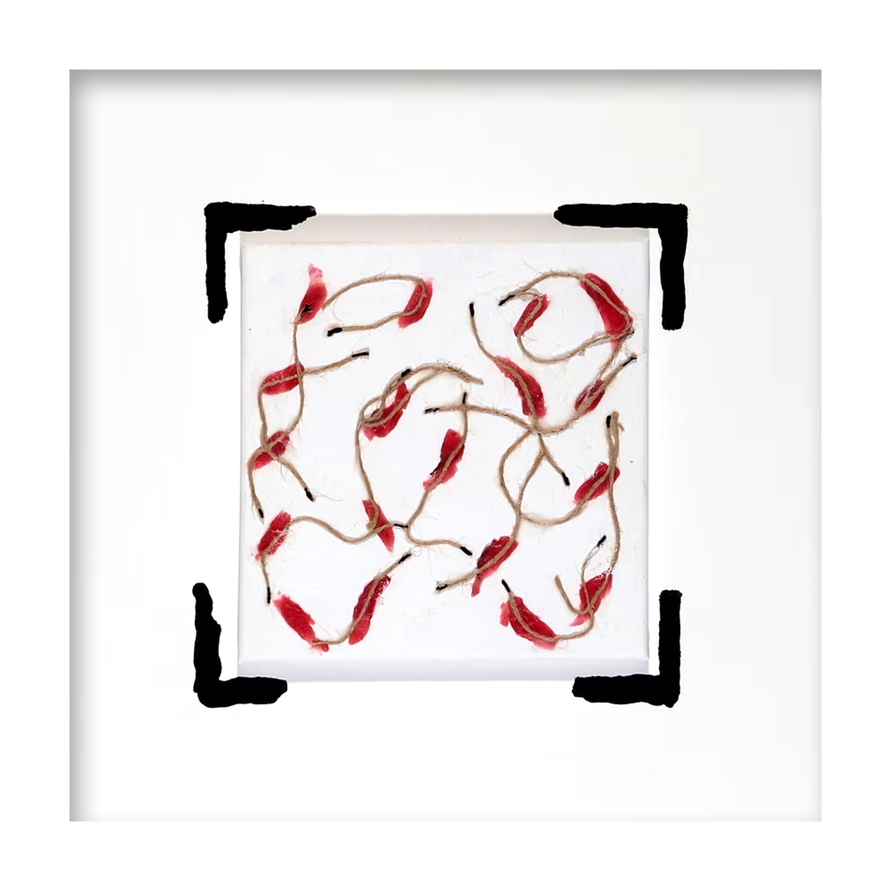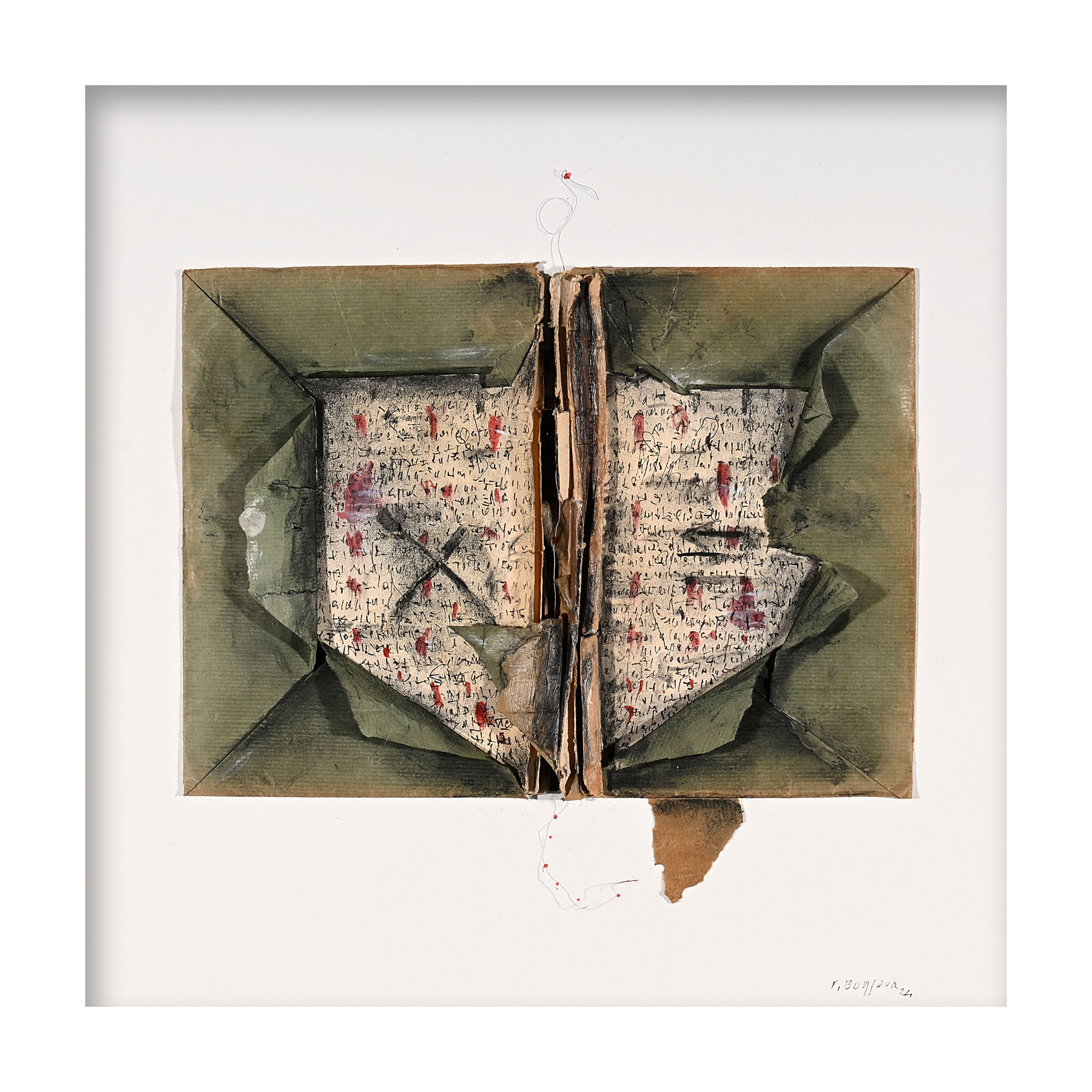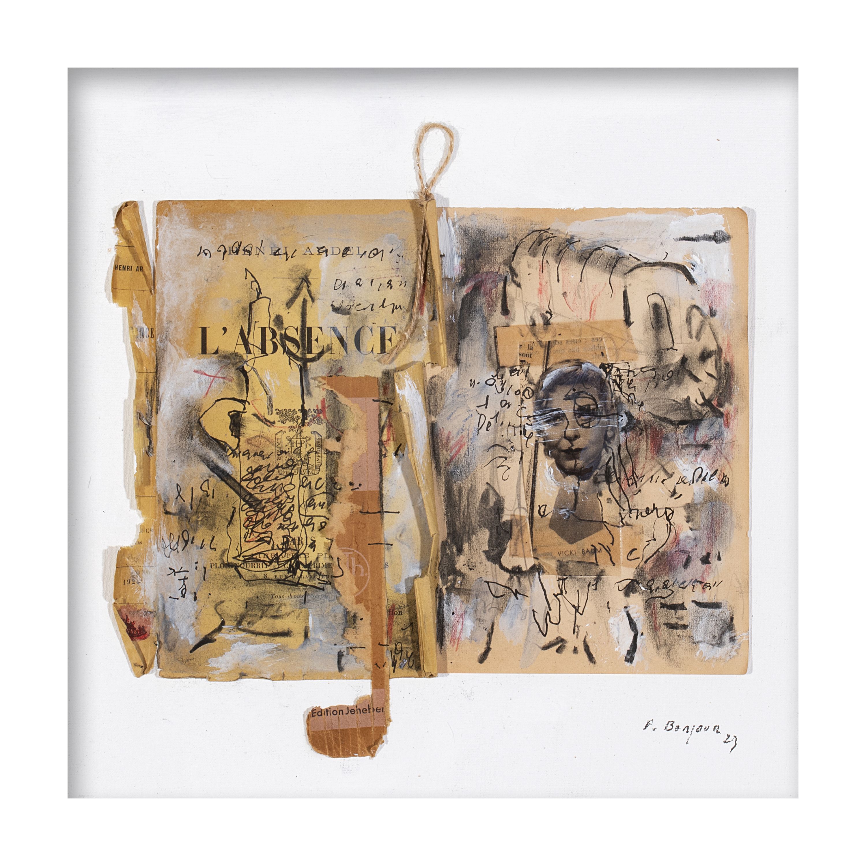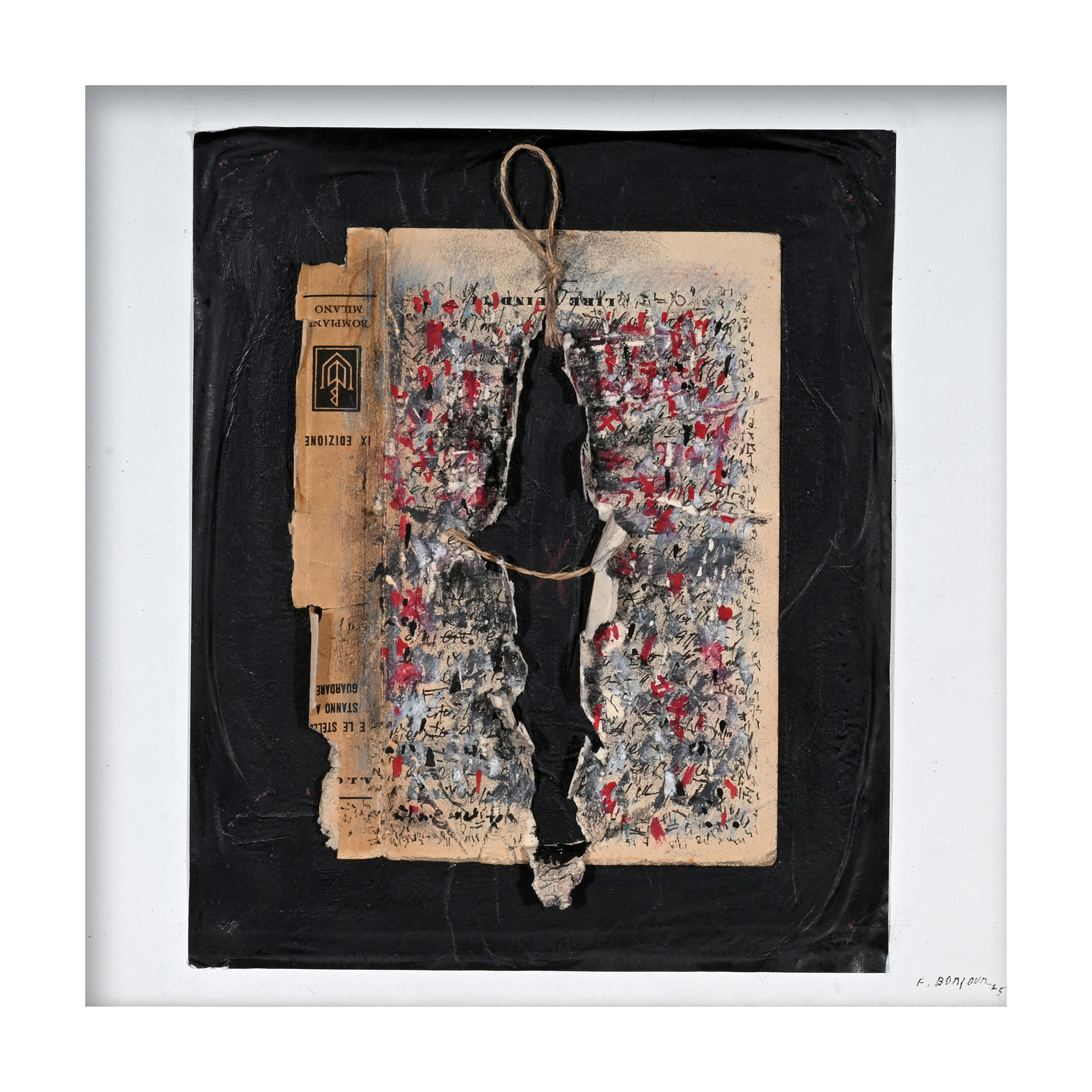 Bonjour adopts an expressive language of great material richness, juxtaposing heterogeneous elements with surprising harmony. His paintings often transcend the boundaries of the canvas, taking on an almost three-dimensional dimension thanks to the inclusion of unconventional objects and materials. On backgrounds prepared with mixed techniques, the artist applies sheets of paper, scraps of fabric, pages of books worn out by time, newspaper clippings, interweaving them with threads of string, ropes, wood fragments, red wax, broken glass and pigments. These poor materials - the 'skin of the city' as he ideally defines it - carry with them the echo of human presences, evoking lives and stories both past and future. Writing plays a central role in his compositions: elegant words and calligraphies appear, sometimes clearly legible, more often reduced to mysterious and indecipherable signs. This fusion of text and image recalls the legacy of Visual Poetry, but Bonjour reworks it in an entirely personal way. The written page is transformed into a visual element: it can be burnt at the edges, torn or covered with invented graphisms, becoming itself a surface to be contemplated. The combination of these verbal and iconic signs builds a dense and meaningful texture. Nothing is left to chance: the artist composes the different fragments with meticulous care, balancing solids and voids, light and dark, rigidity and fluidity. The result is works of refined elegance, in which the layering of materials creates physical and conceptual depth. Every detail - from the small piece of wax to a thin thread running through the paper - contributes to the overall meaning, inviting the observer into a silent conversation with the work. The result is a unique visual language, sober but incisive, capable of speaking on different levels: cultured and at the same time immediate, intimate and universal.