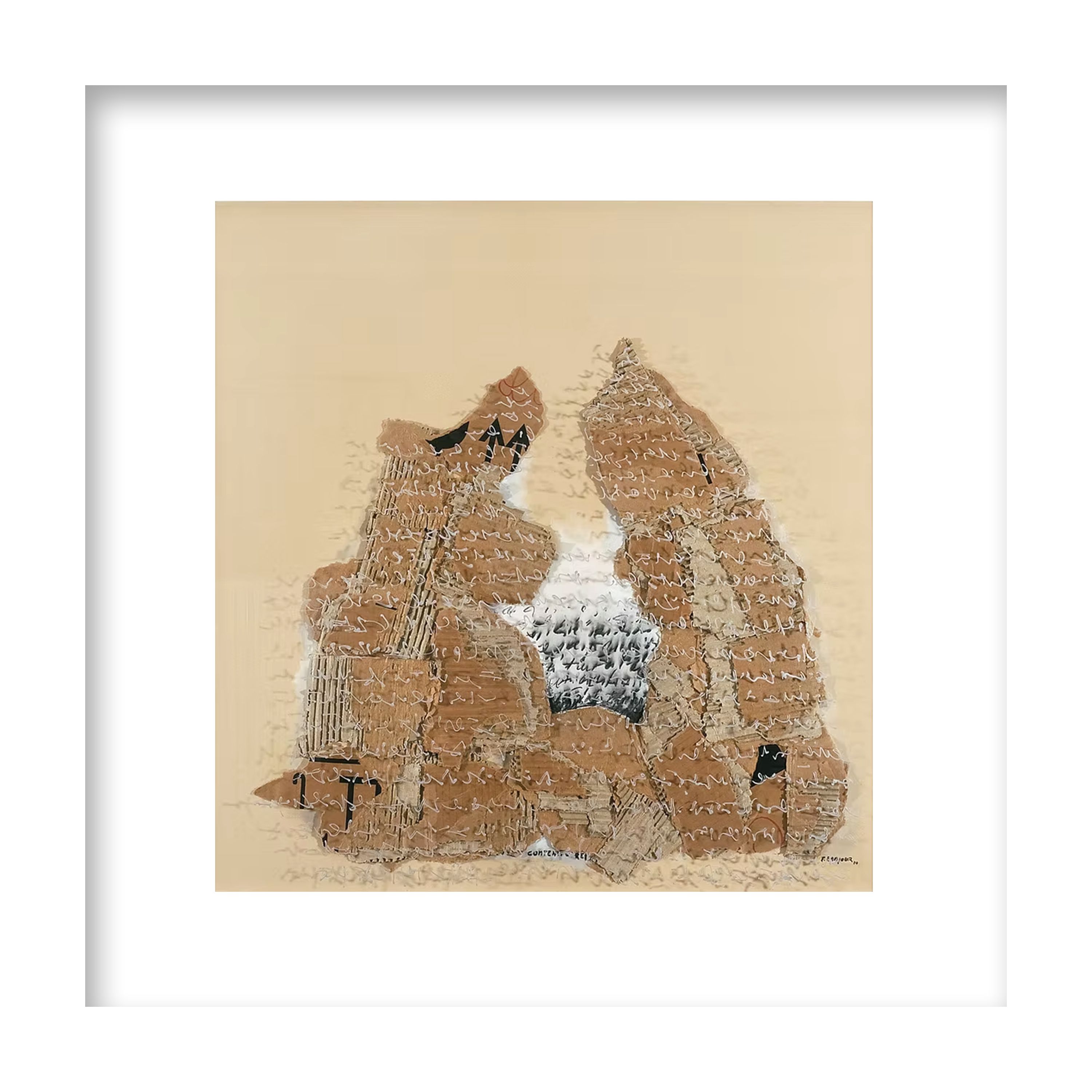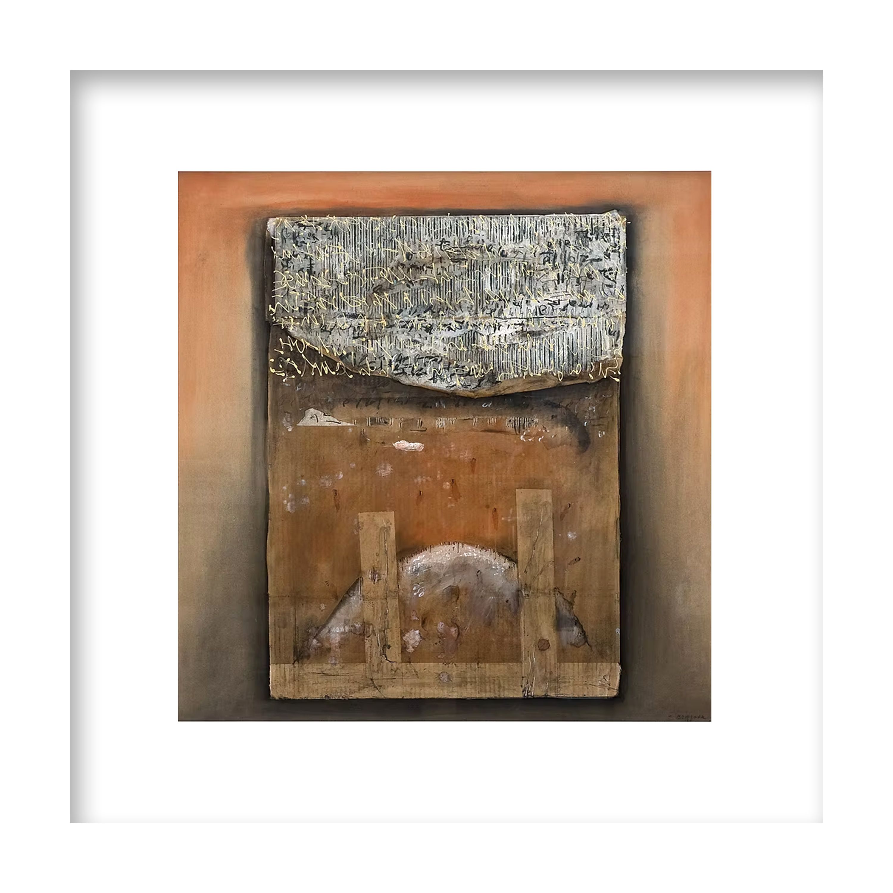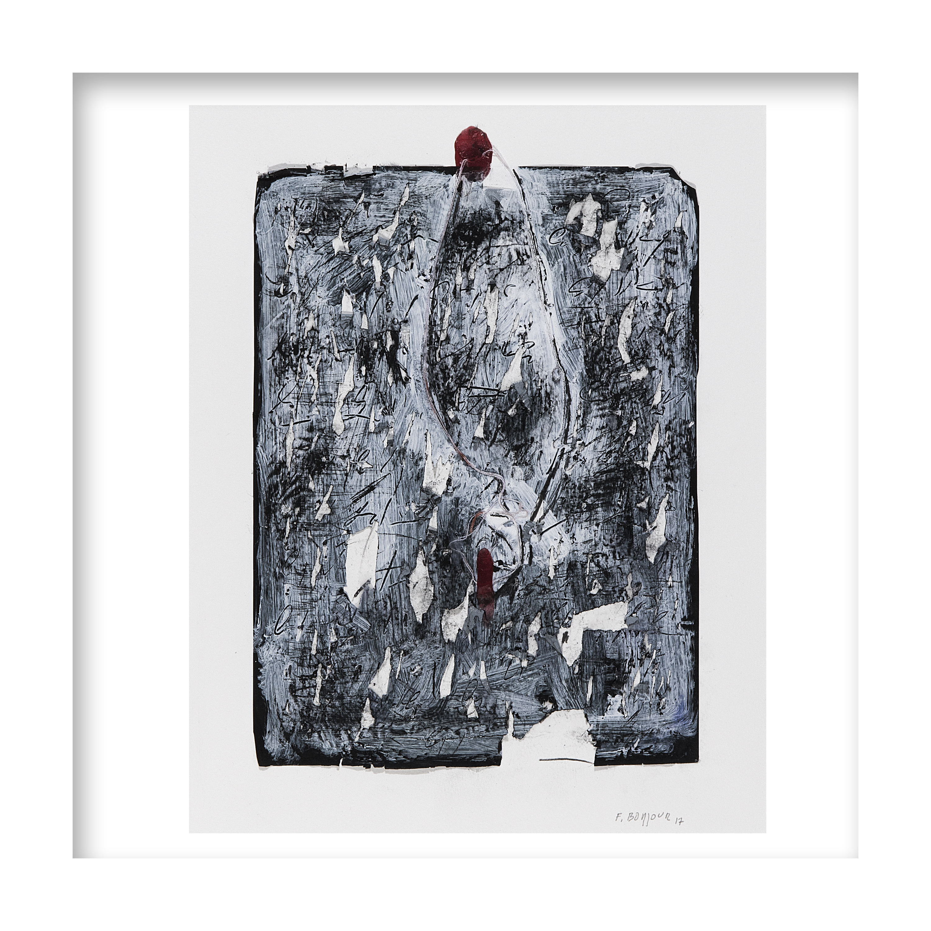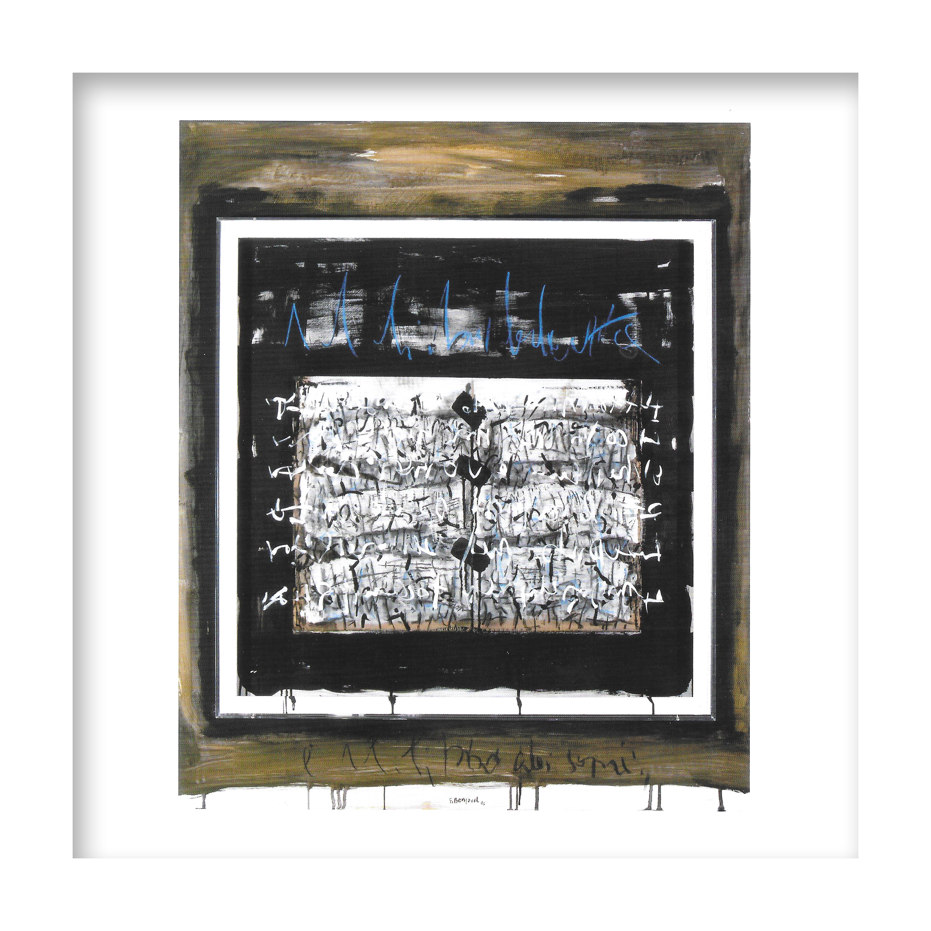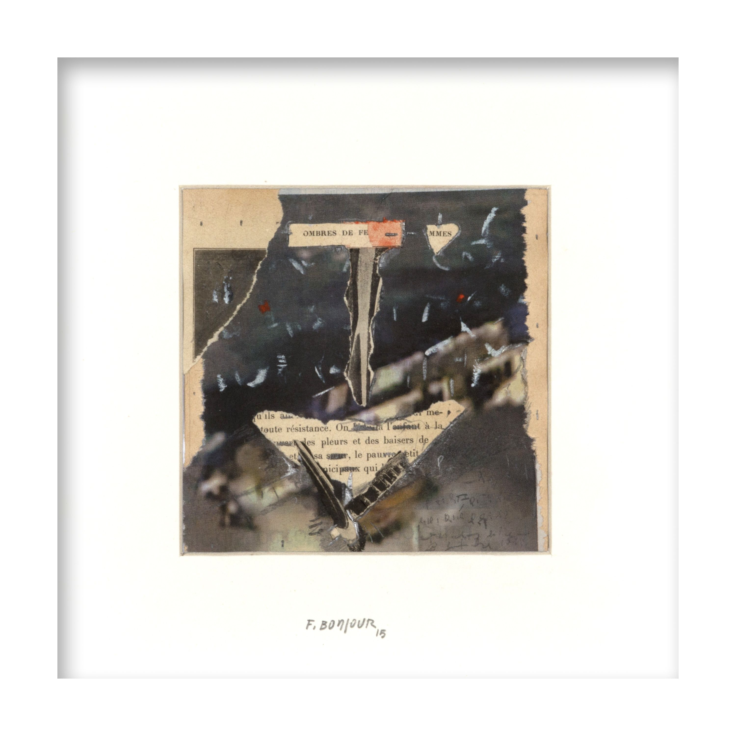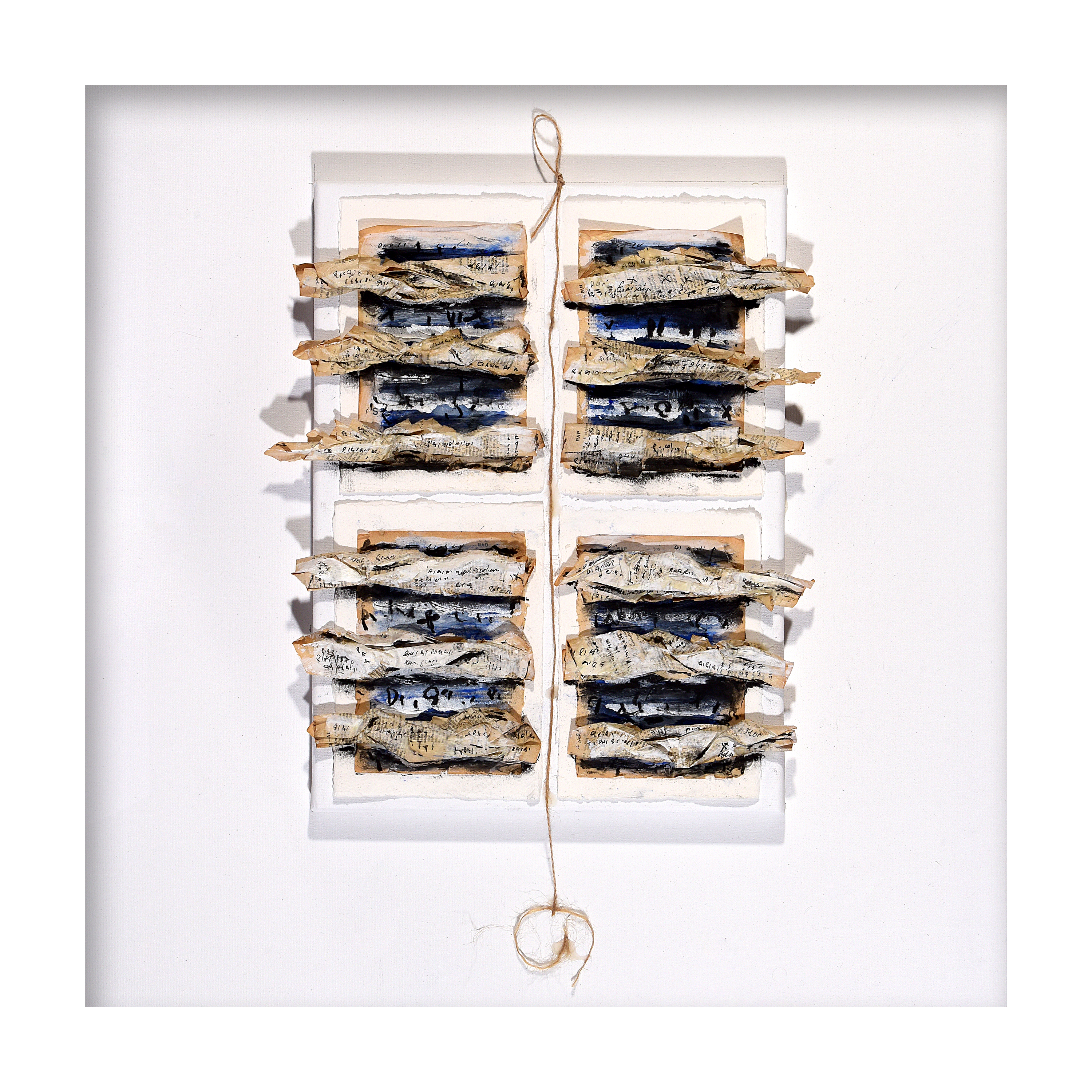 Bonjour adopts an expressive language of great material richness, juxtaposing heterogeneous elements with surprising harmony. His paintings often transcend the boundaries of the canvas, taking on an almost three-dimensional dimension thanks to the inclusion of unconventional objects and materials. On backgrounds prepared with mixed techniques, the artist applies sheets of paper, scraps of fabric, pages of books worn out by time, newspaper clippings, interweaving them with threads of string, ropes, wood fragments, red wax, broken glass and pigments. These poor materials - the 'skin of the city' as he ideally defines it - carry with them the echo of human presences, evoking lives and stories both past and future. Writing plays a central role in his compositions: elegant words and calligraphies appear, sometimes clearly legible, more often reduced to mysterious and indecipherable signs. This fusion of text and image recalls the legacy of Visual Poetry, but Bonjour reworks it in an entirely personal way. The written page is transformed into a visual element: it can be burnt at the edges, torn or covered with invented graphisms, becoming itself a surface to be contemplated. The combination of these verbal and iconic signs builds a dense and meaningful texture. Nothing is left to chance: the artist composes the different fragments with meticulous care, balancing solids and voids, light and dark, rigidity and fluidity. The result is works of refined elegance, in which the layering of materials creates physical and conceptual depth. Every detail - from the small piece of wax to a thin thread running through the paper - contributes to the overall meaning, inviting the observer into a silent conversation with the work. The result is a unique visual language, sober but incisive, capable of speaking on different levels: cultured and at the same time immediate, intimate and universal.