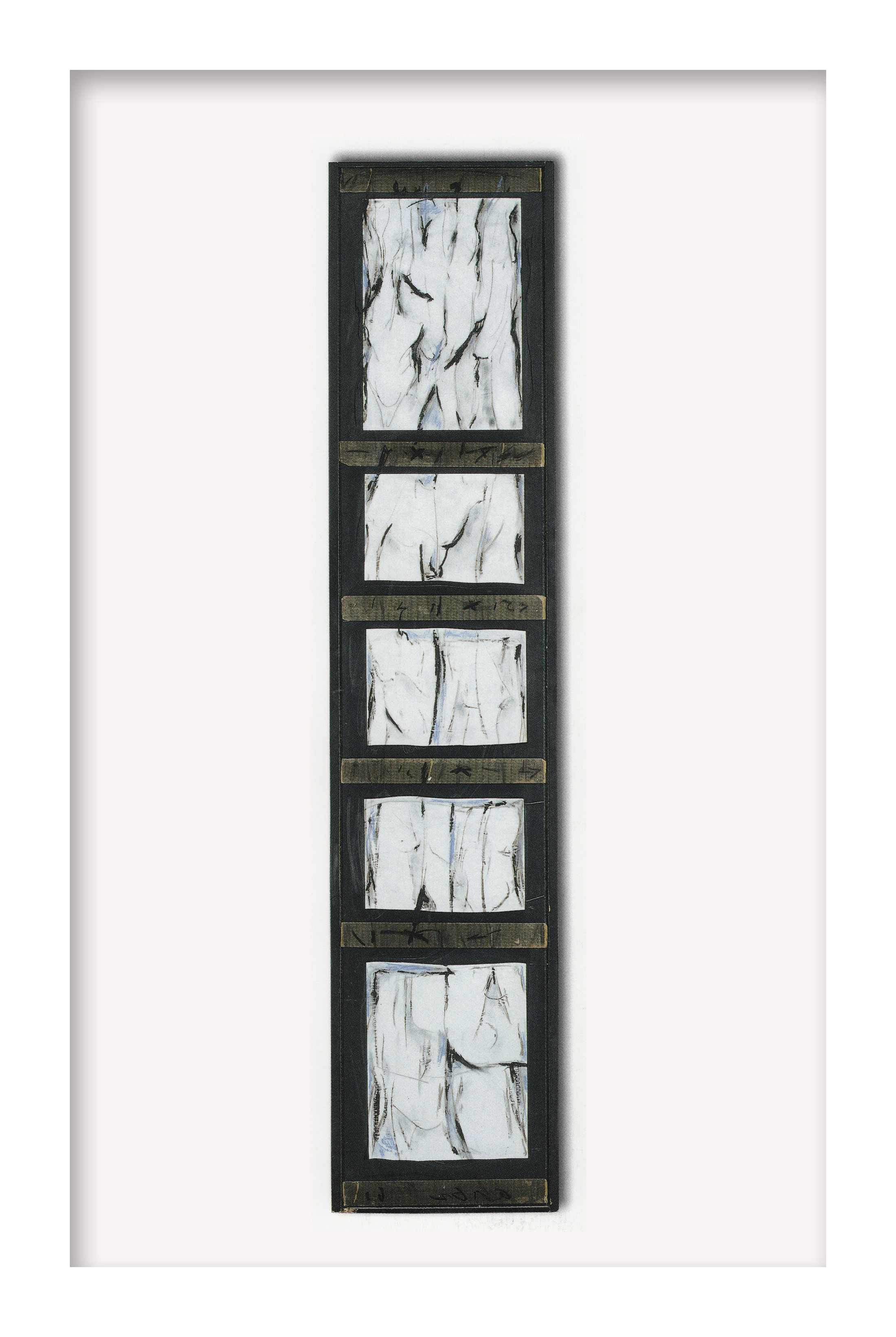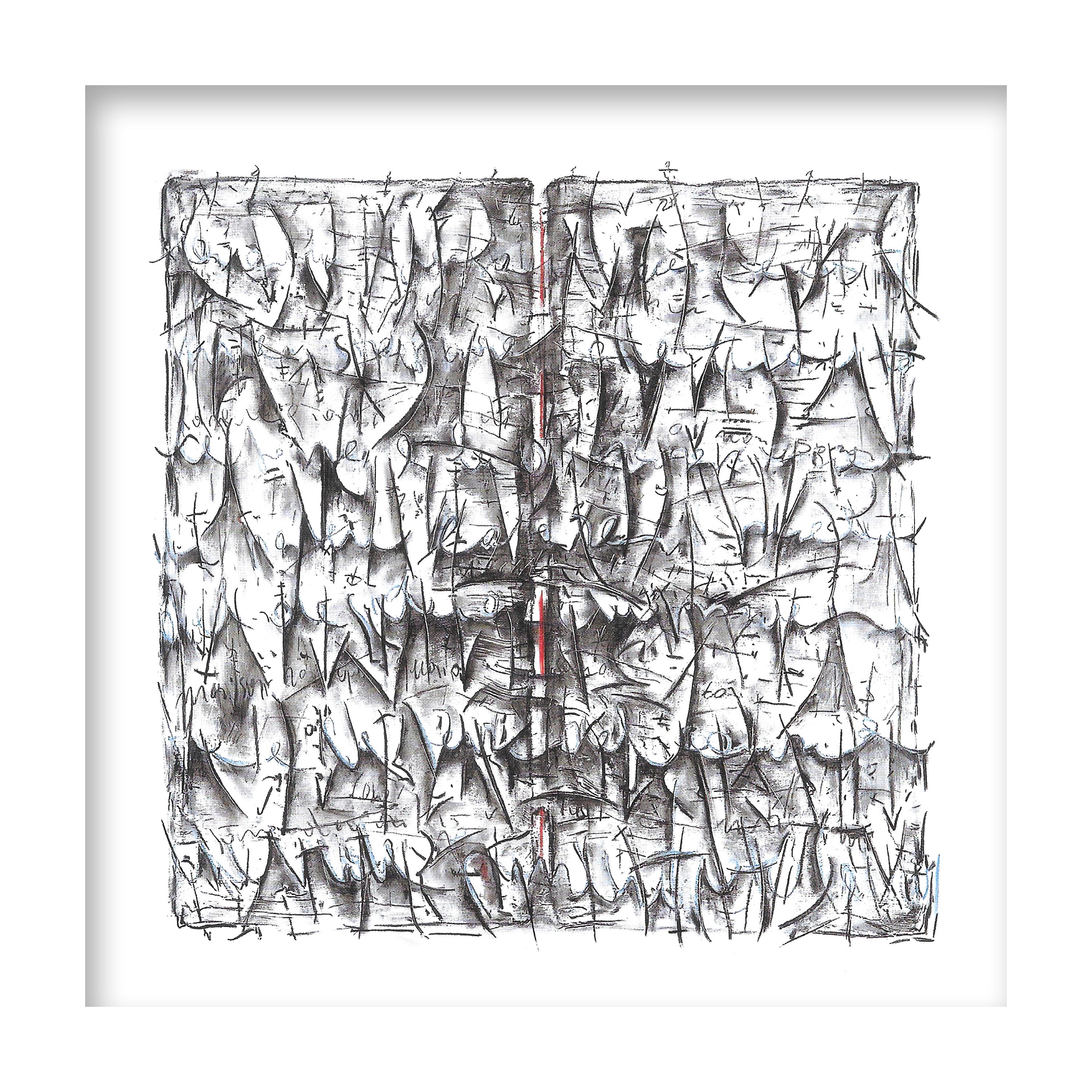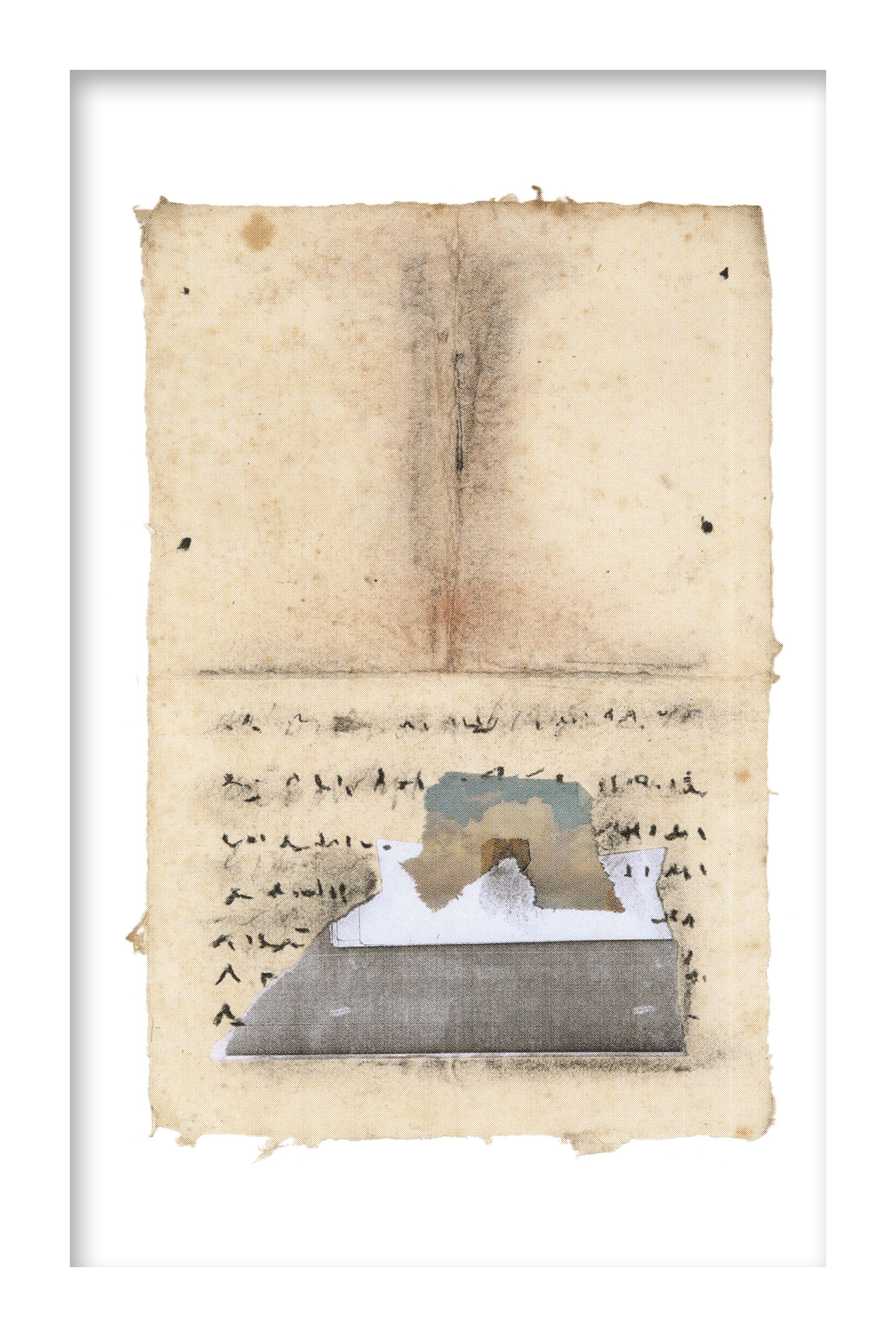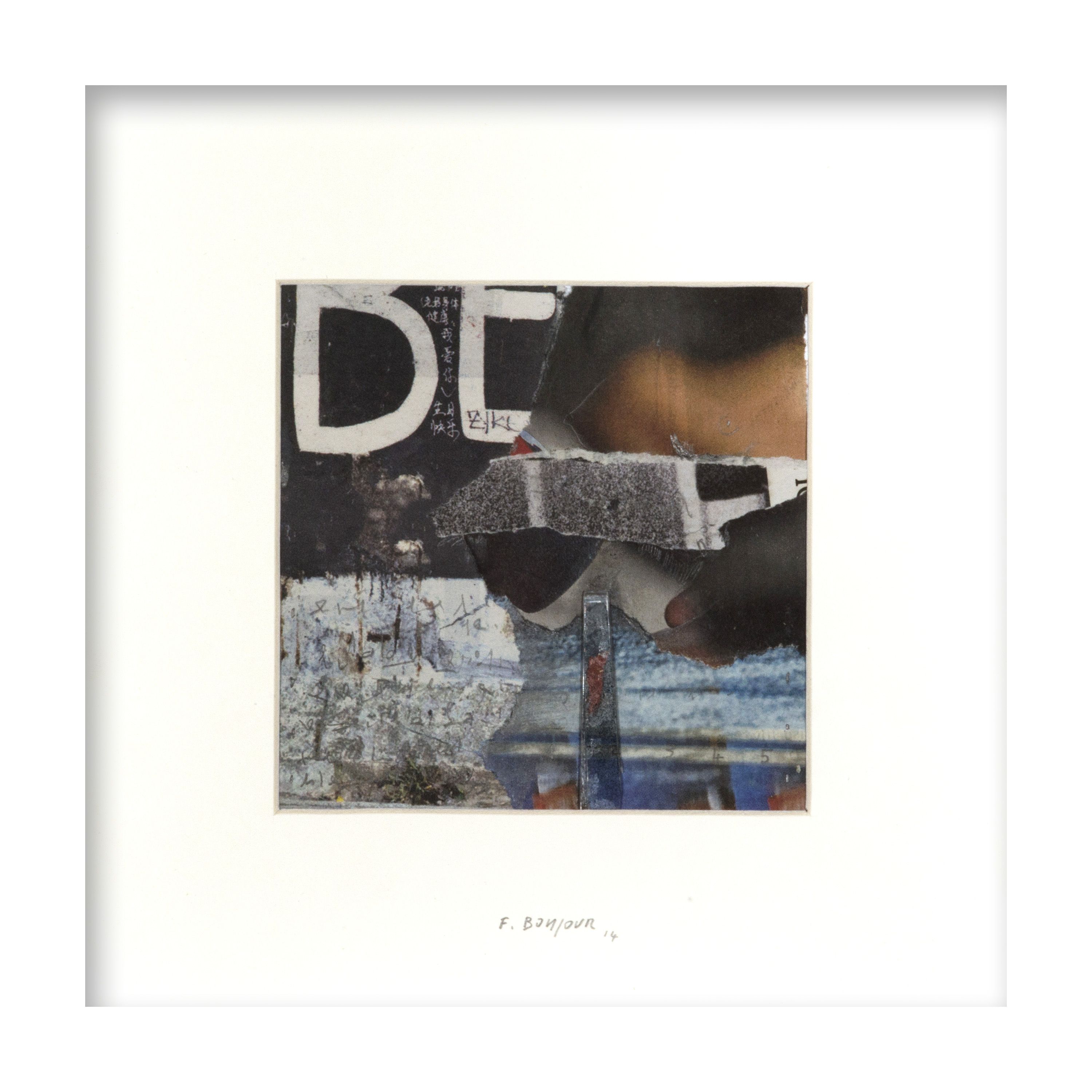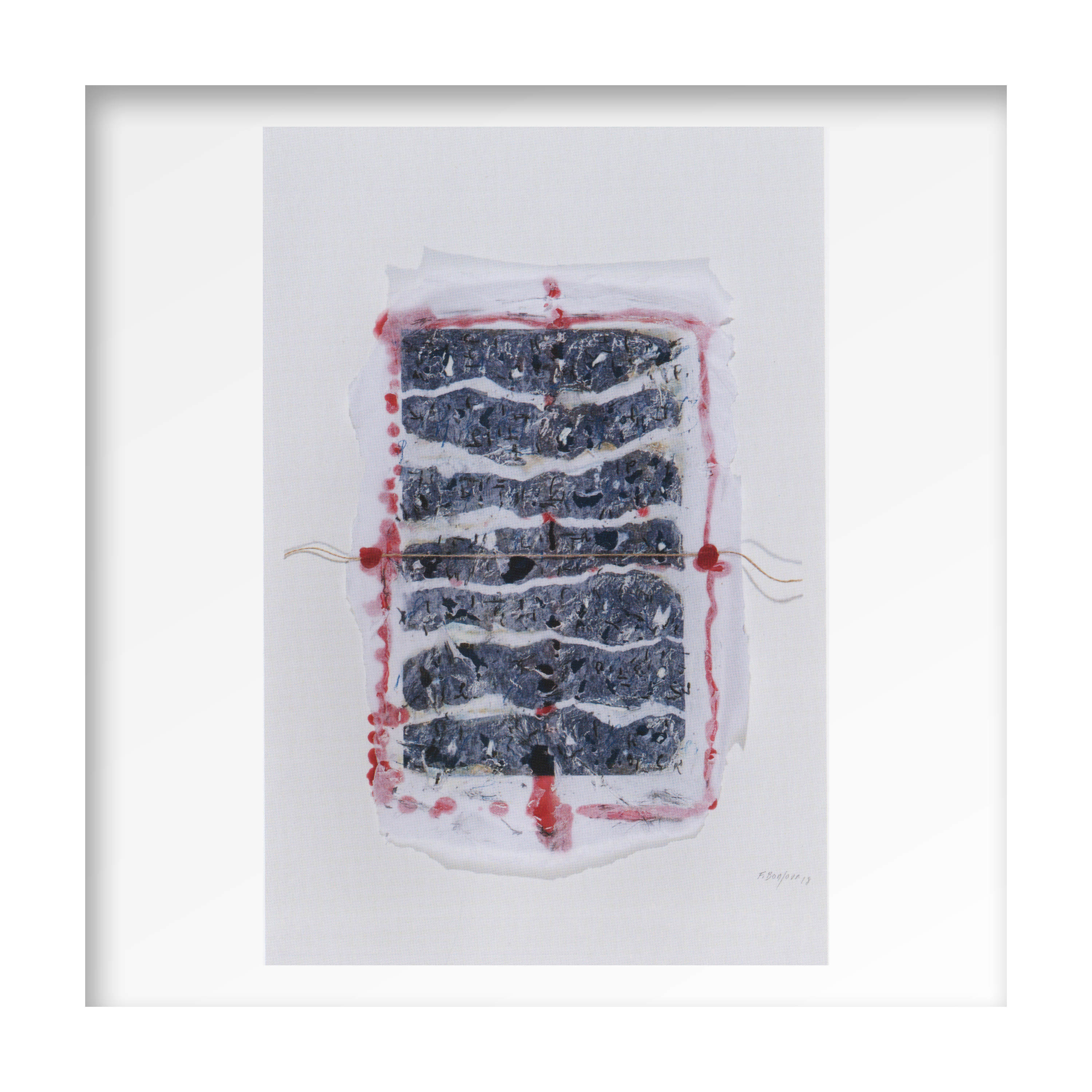 Bonjour adopts an expressive language of great material richness, juxtaposing heterogeneous elements with surprising harmony. His paintings often transcend the boundaries of the canvas, taking on an almost three-dimensional dimension thanks to the inclusion of unconventional objects and materials. On backgrounds prepared with mixed techniques, the artist applies sheets of paper, scraps of fabric, pages of books worn out by time, newspaper clippings, interweaving them with threads of string, ropes, wood fragments, red wax, broken glass and pigments. These poor materials - the 'skin of the city' as he ideally defines it - carry with them the echo of human presences, evoking lives and stories both past and future. Writing plays a central role in his compositions: elegant words and calligraphies appear, sometimes clearly legible, more often reduced to mysterious and indecipherable signs. This fusion of text and image recalls the legacy of Visual Poetry, but Bonjour reworks it in an entirely personal way. The written page is transformed into a visual element: it can be burnt at the edges, torn or covered with invented graphisms, becoming itself a surface to be contemplated. The combination of these verbal and iconic signs builds a dense and meaningful texture. Nothing is left to chance: the artist composes the different fragments with meticulous care, balancing solids and voids, light and dark, rigidity and fluidity. The result is works of refined elegance, in which the layering of materials creates physical and conceptual depth. Every detail - from the small piece of wax to a thin thread running through the paper - contributes to the overall meaning, inviting the observer into a silent conversation with the work. The result is a unique visual language, sober but incisive, capable of speaking on different levels: cultured and at the same time immediate, intimate and universal.