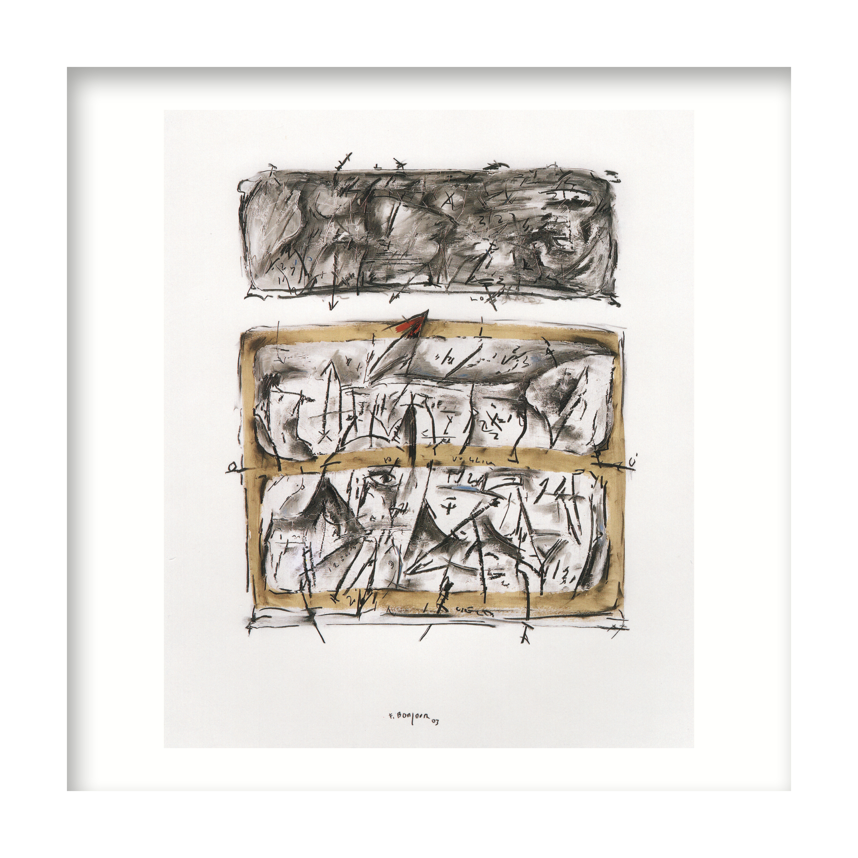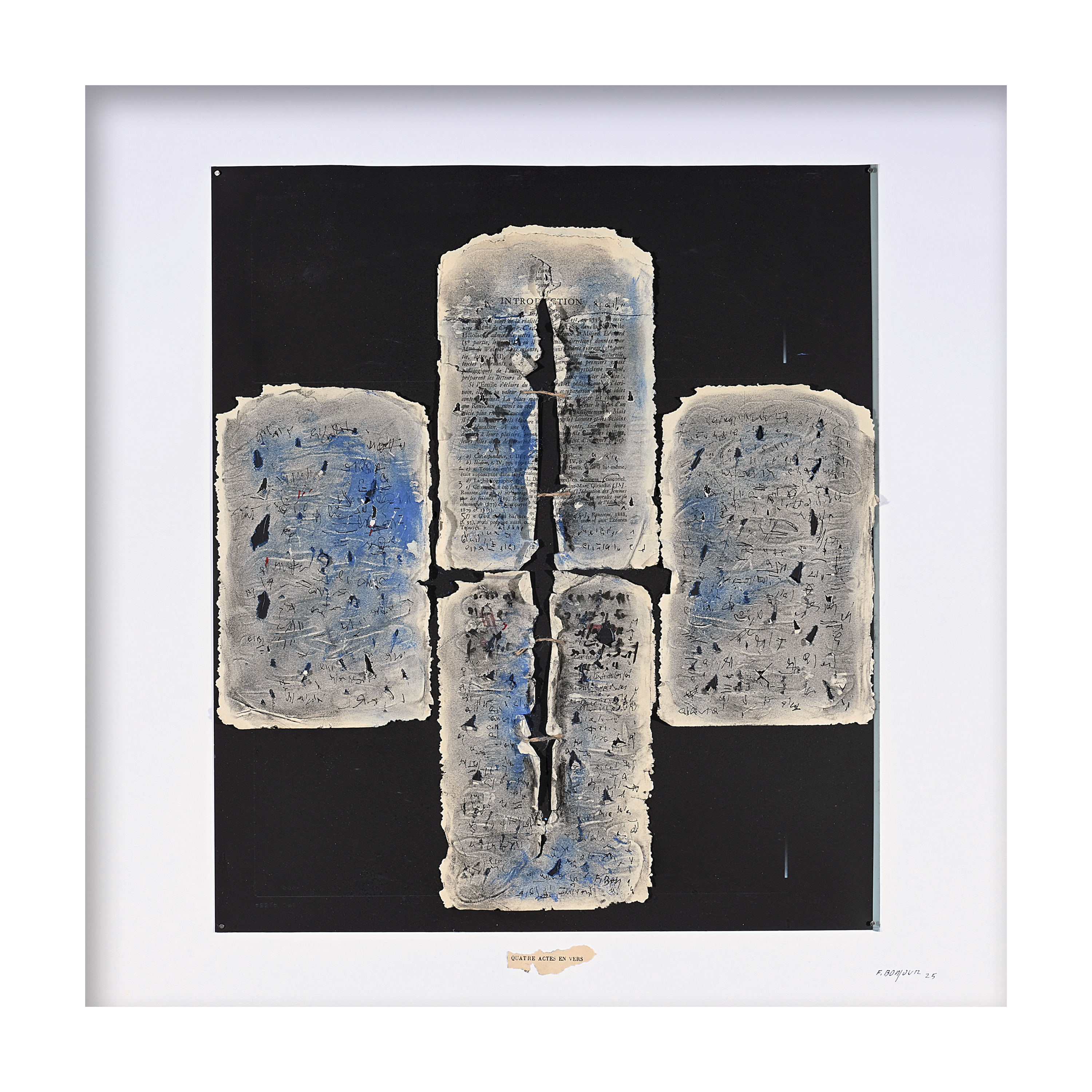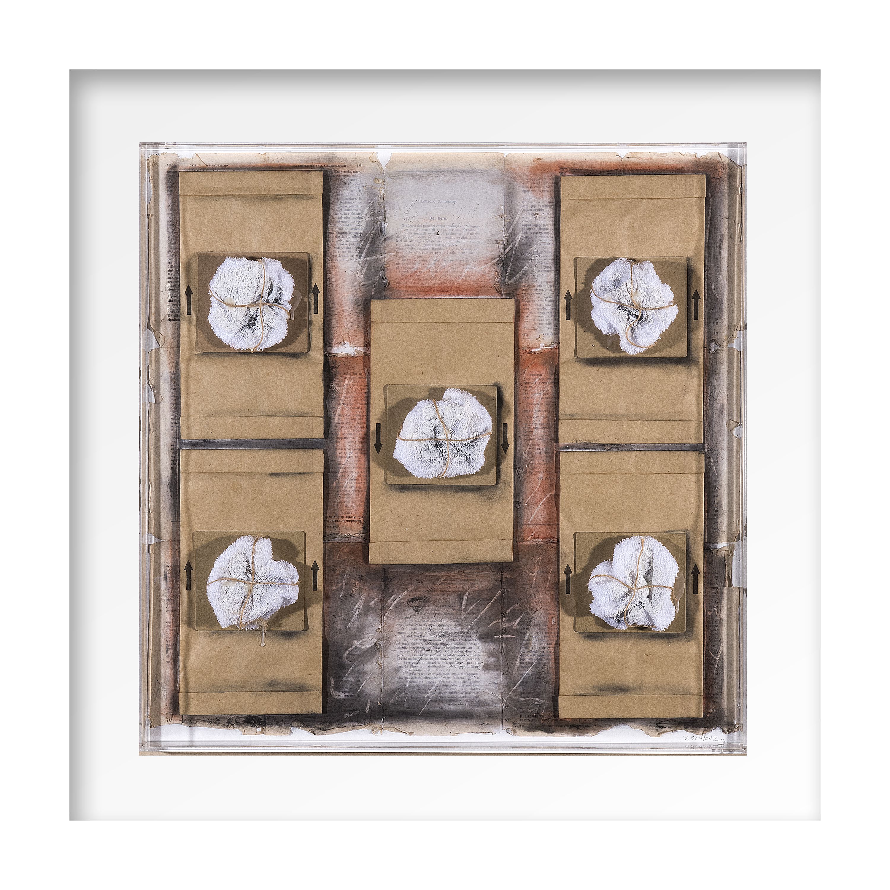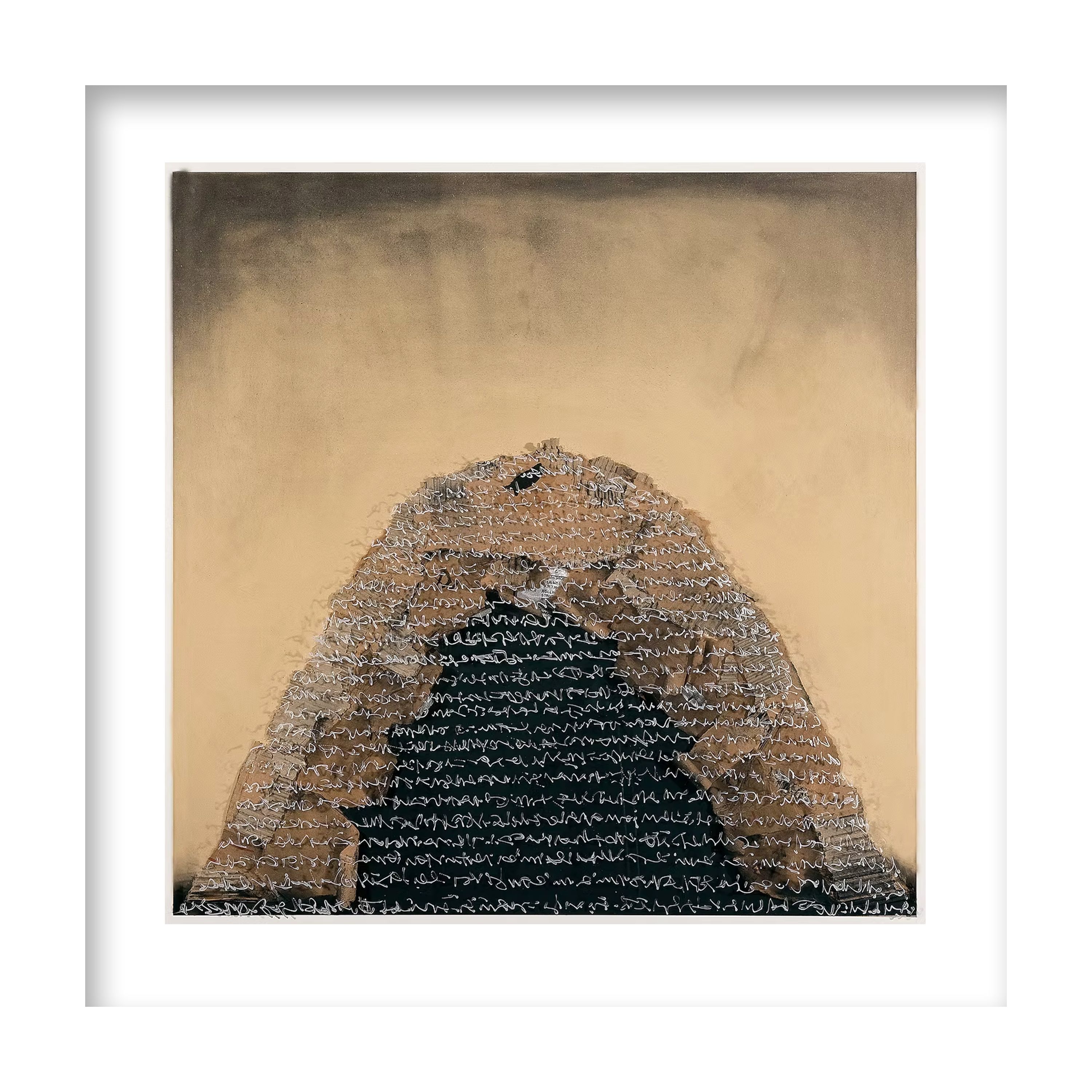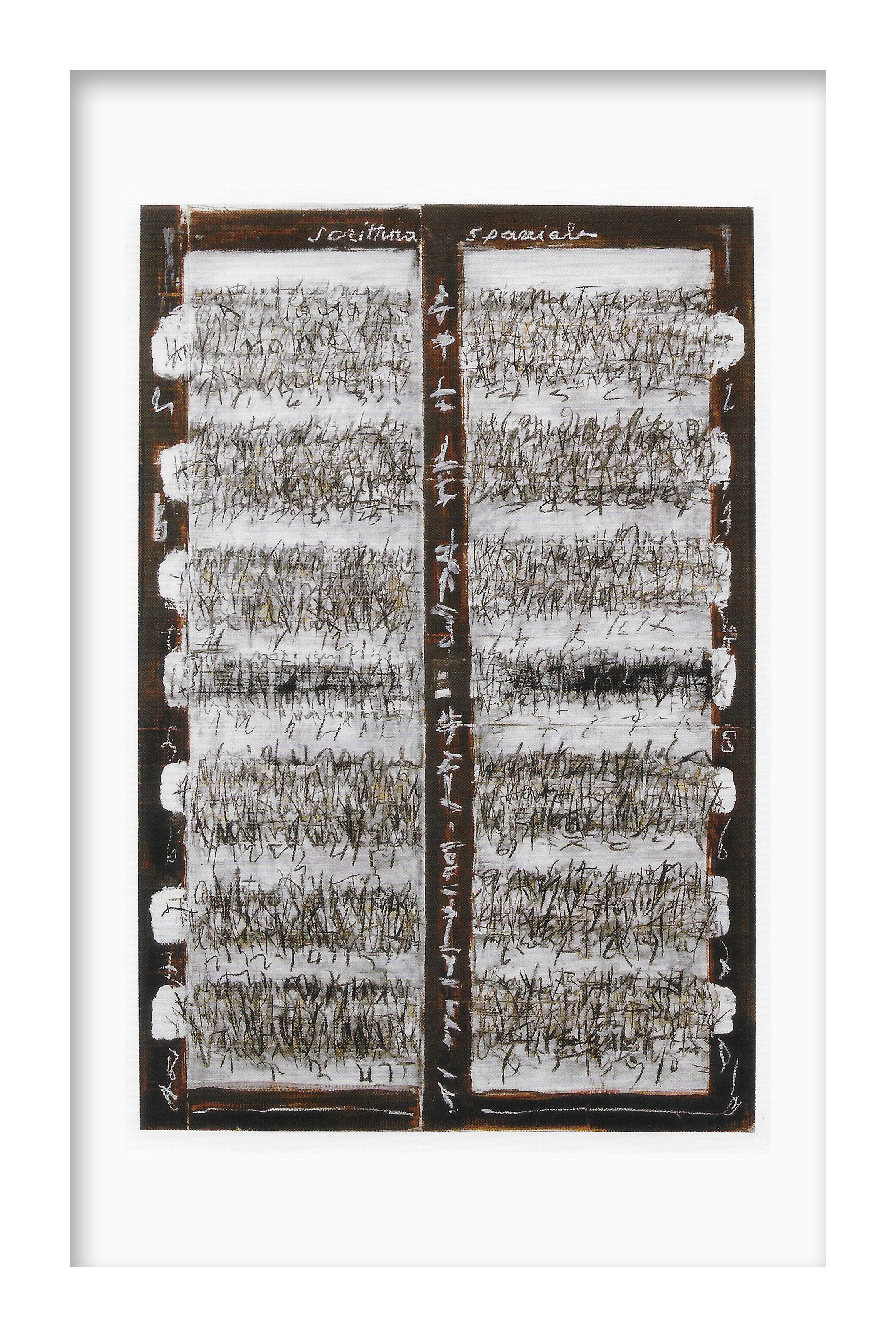Bonjour adopts an expressive language of great material richness, juxtaposing heterogeneous elements with surprising harmony. His paintings often transcend the boundaries of the canvas, taking on an almost three-dimensional dimension thanks to the inclusion of unconventional objects and materials. On backgrounds prepared with mixed techniques, the artist applies sheets of paper, scraps of fabric, pages of books worn out by time, newspaper clippings, interweaving them with threads of string, ropes, wood fragments, red wax, broken glass and pigments. These poor materials - the 'skin of the city' as he ideally defines it - carry with them the echo of human presences, evoking lives and stories both past and future. Writing plays a central role in his compositions: elegant words and calligraphies appear, sometimes clearly legible, more often reduced to mysterious and indecipherable signs. This fusion of text and image recalls the legacy of Visual Poetry, but Bonjour reworks it in an entirely personal way. The written page is transformed into a visual element: it can be burnt at the edges, torn or covered with invented graphisms, becoming itself a surface to be contemplated. The combination of these verbal and iconic signs builds a dense and meaningful texture. Nothing is left to chance: the artist composes the different fragments with meticulous care, balancing solids and voids, light and dark, rigidity and fluidity. The result is works of refined elegance, in which the layering of materials creates physical and conceptual depth. Every detail - from the small piece of wax to a thin thread running through the paper - contributes to the overall meaning, inviting the observer into a silent conversation with the work. The result is a unique visual language, sober but incisive, capable of speaking on different levels: cultured and at the same time immediate, intimate and universal.