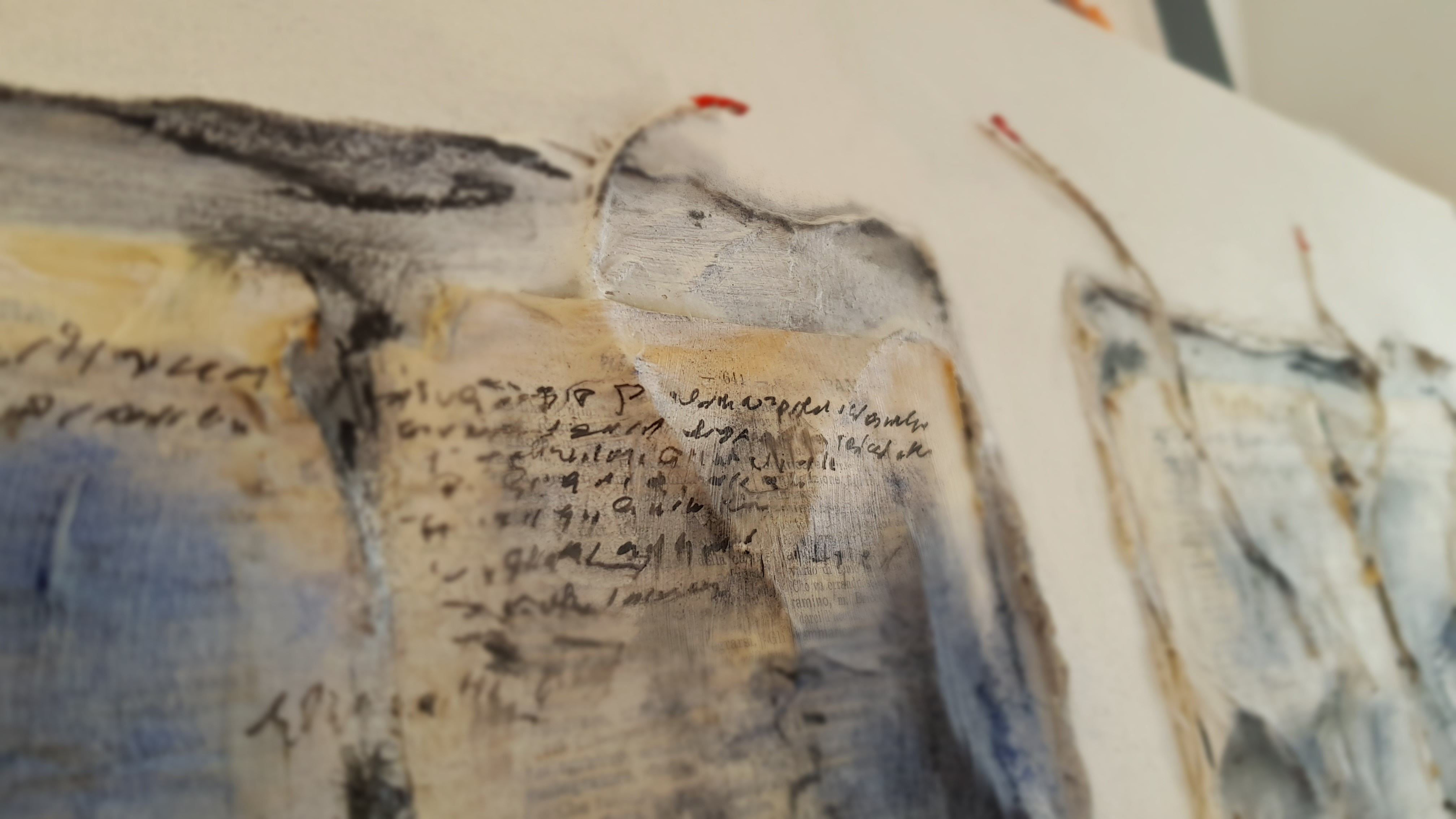 François Bonjour's work stands out for its poetic use of humble and recycled materials, in line with the aesthetics of Arte Povera, which influenced his training. He himself defines these material elements as the “skin of the city”: ropes, wood, wax and, above all, paper torn from old books and notebooks, which the artist reassembles in his canvases and installations, exploiting the rhythmic marks of the written pages.