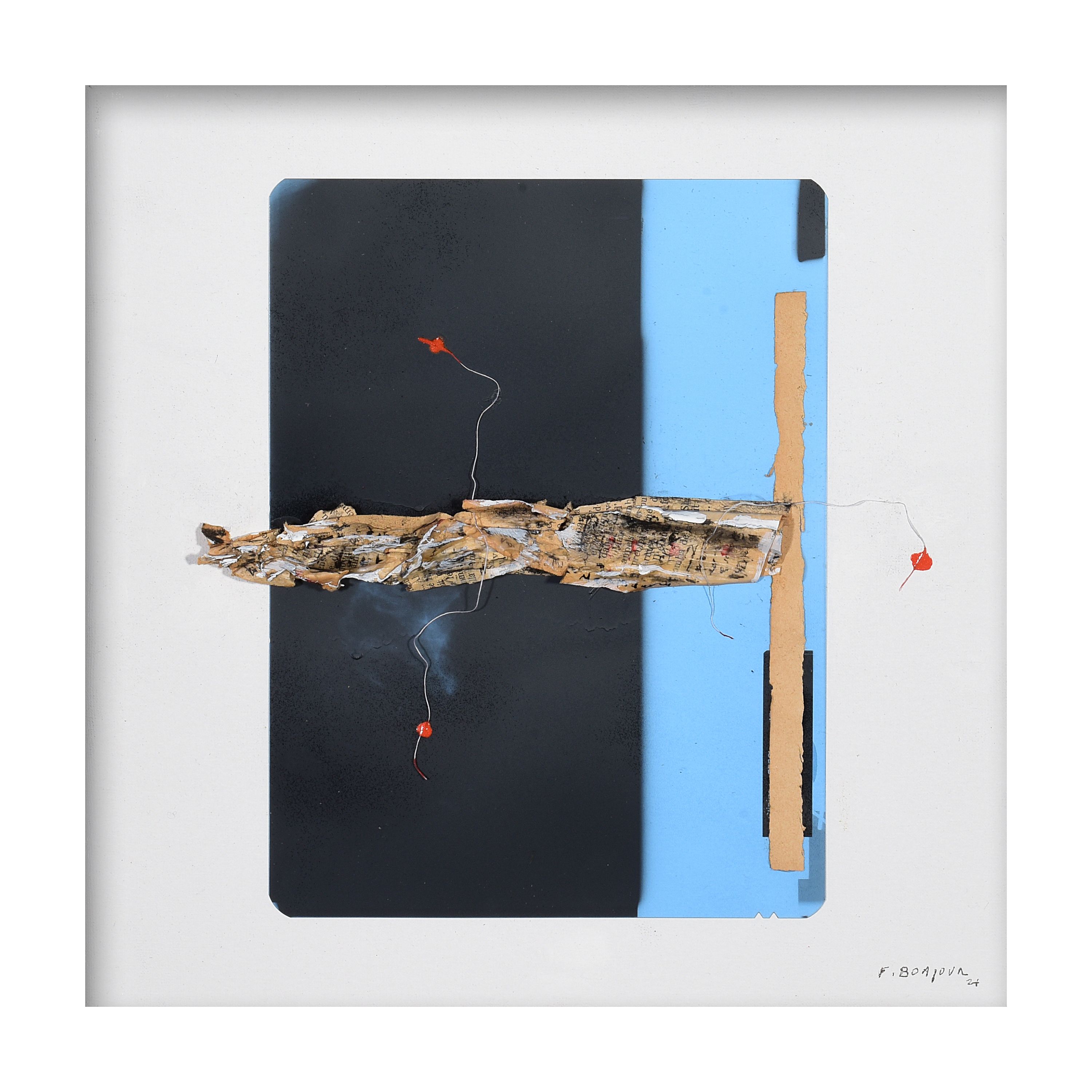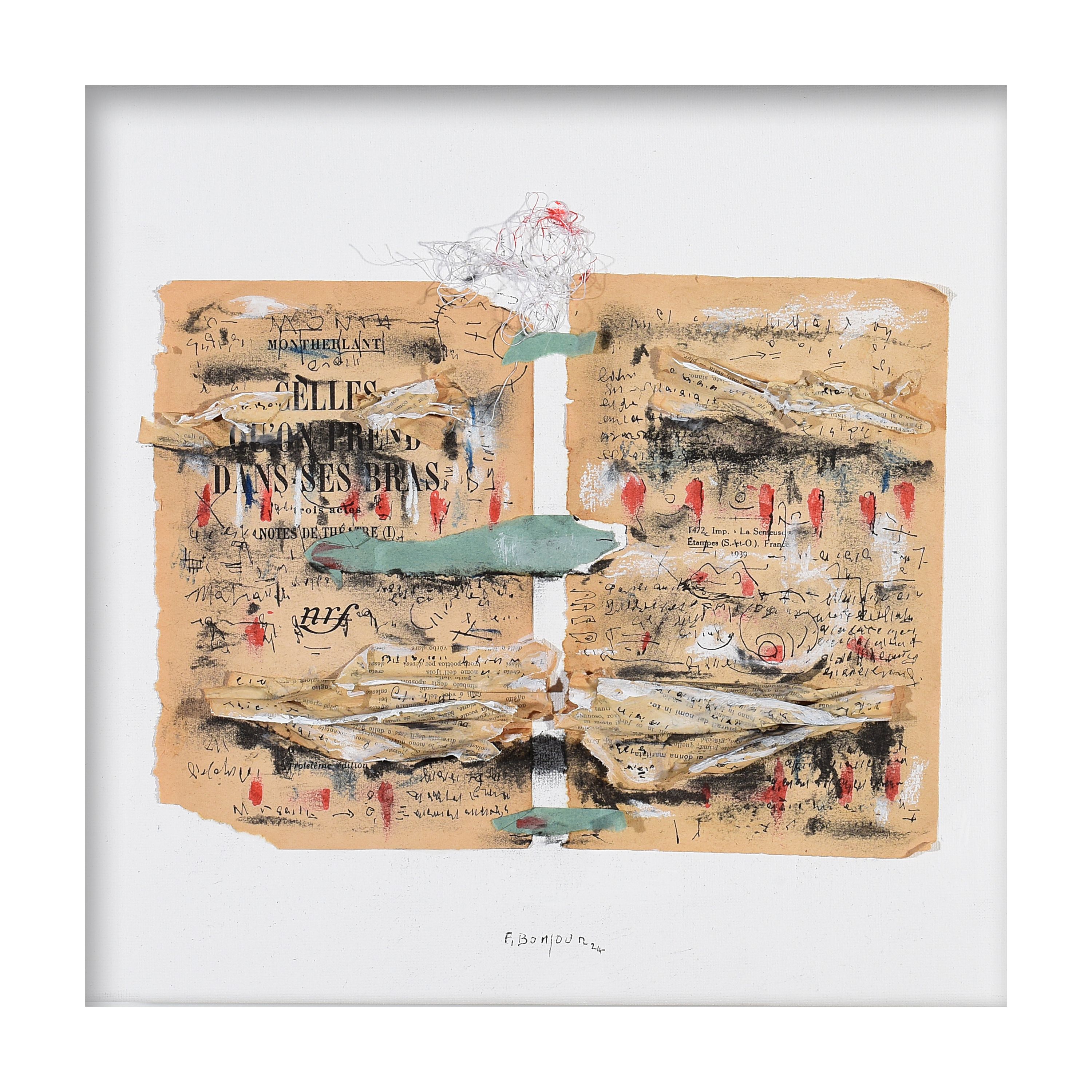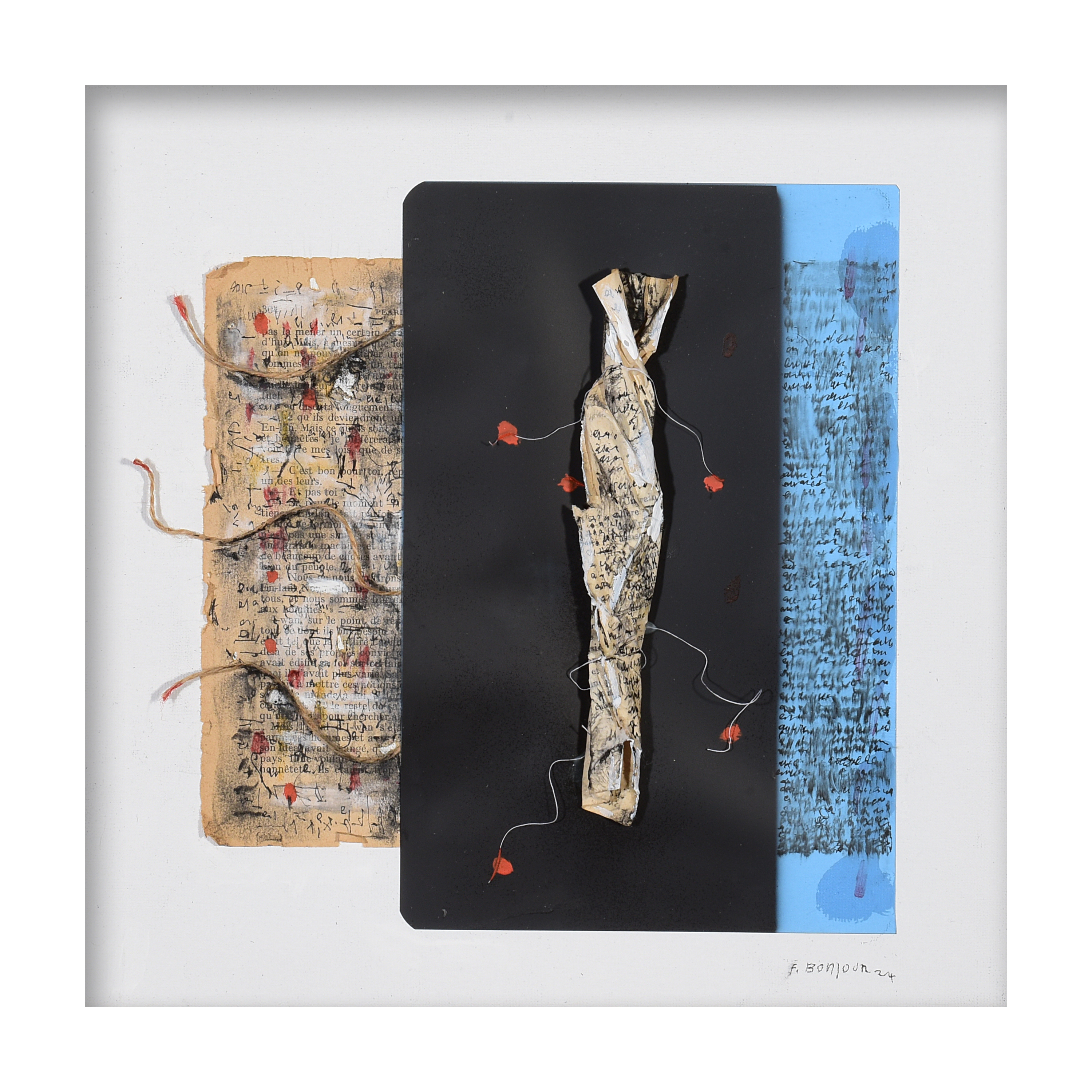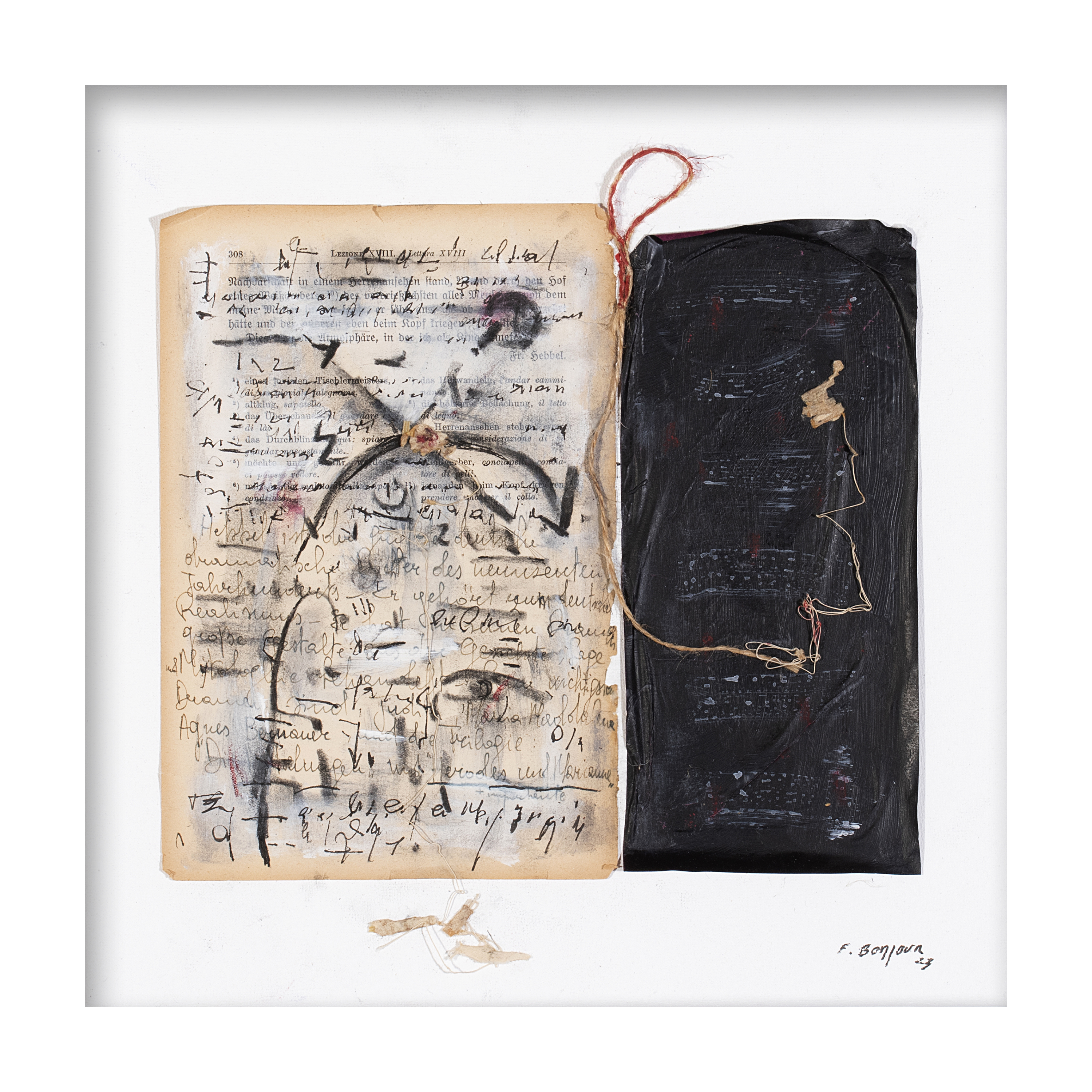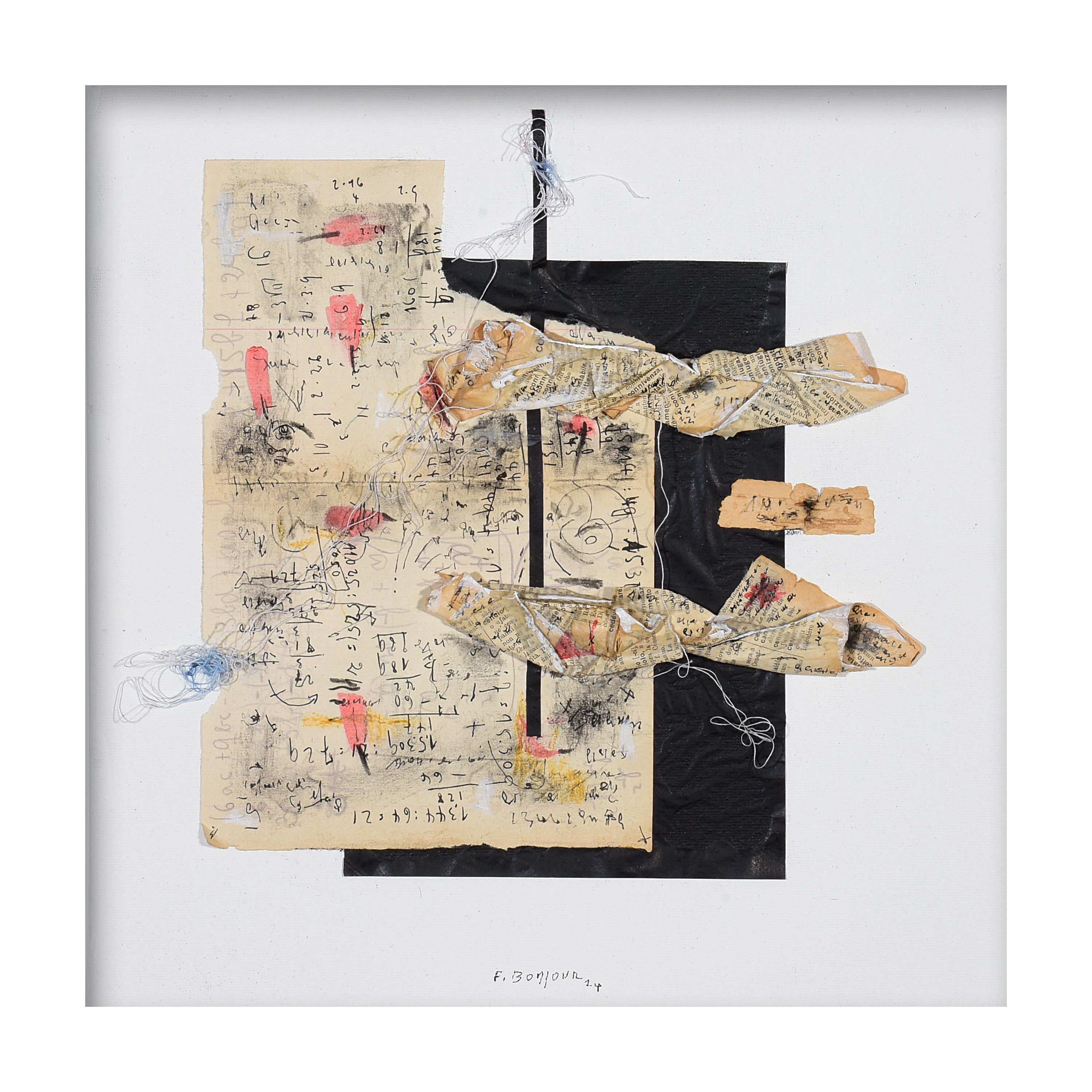 Bonjour adopts an expressive language of great material richness, juxtaposing heterogeneous elements with surprising harmony. His paintings often transcend the boundaries of the canvas, taking on an almost three-dimensional dimension thanks to the inclusion of unconventional objects and materials. On backgrounds prepared with mixed techniques, the artist applies sheets of paper, scraps of fabric, pages of books worn out by time, newspaper clippings, interweaving them with threads of string, ropes, wood fragments, red wax, broken glass and pigments. These poor materials - the 'skin of the city' as he ideally defines it - carry with them the echo of human presences, evoking lives and stories both past and future. Writing plays a central role in his compositions: elegant words and calligraphies appear, sometimes clearly legible, more often reduced to mysterious and indecipherable signs. This fusion of text and image recalls the legacy of Visual Poetry, but Bonjour reworks it in an entirely personal way. The written page is transformed into a visual element: it can be burnt at the edges, torn or covered with invented graphisms, becoming itself a surface to be contemplated. The combination of these verbal and iconic signs builds a dense and meaningful texture. Nothing is left to chance: the artist composes the different fragments with meticulous care, balancing solids and voids, light and dark, rigidity and fluidity. The result is works of refined elegance, in which the layering of materials creates physical and conceptual depth. Every detail - from the small piece of wax to a thin thread running through the paper - contributes to the overall meaning, inviting the observer into a silent conversation with the work. The result is a unique visual language, sober but incisive, capable of speaking on different levels: cultured and at the same time immediate, intimate and universal.