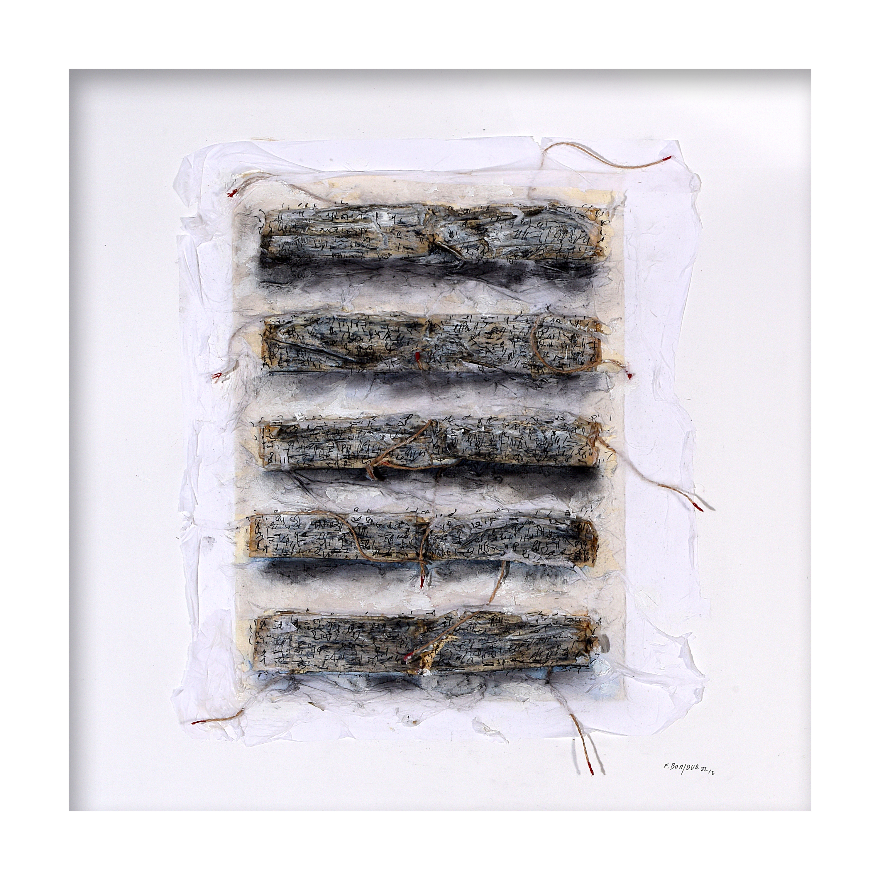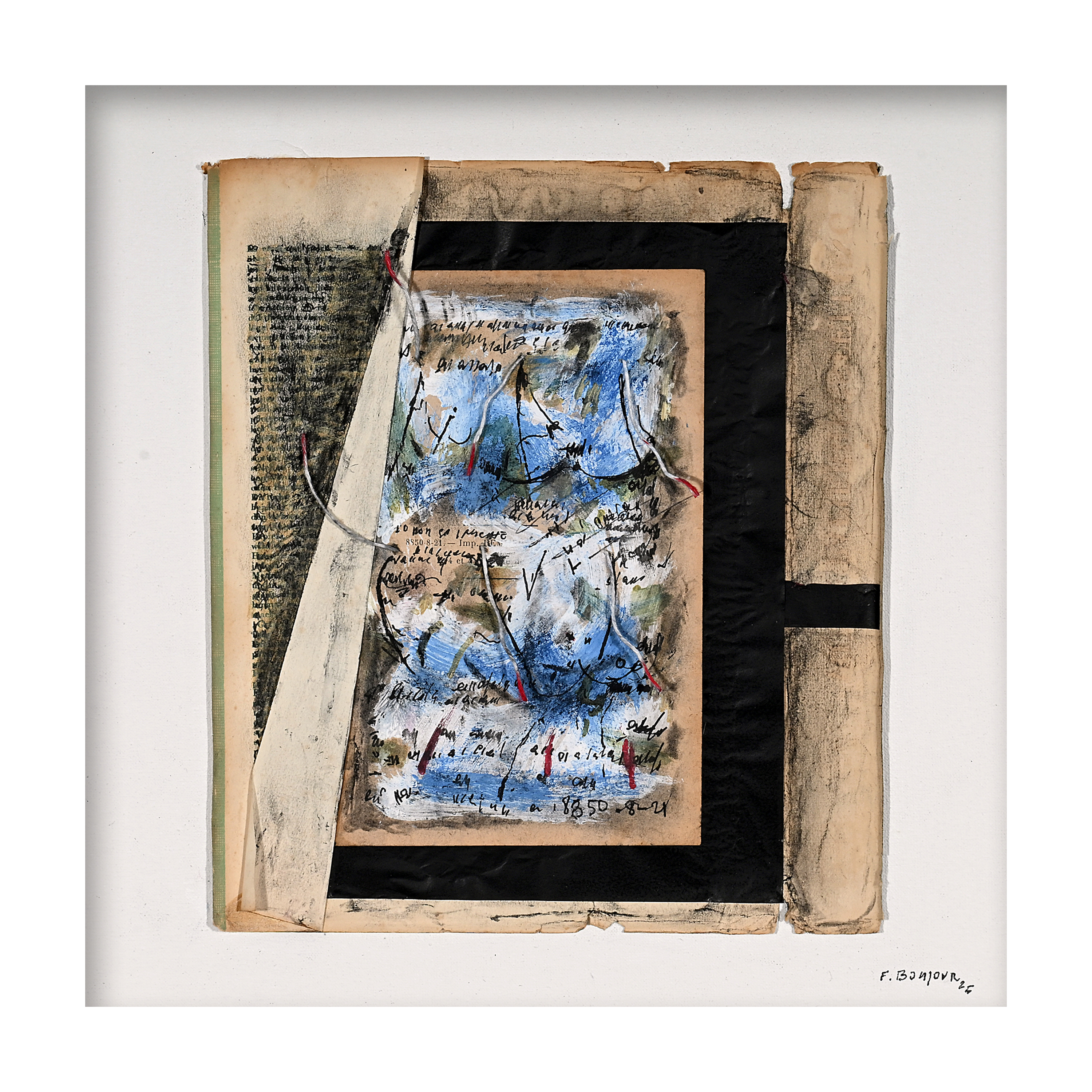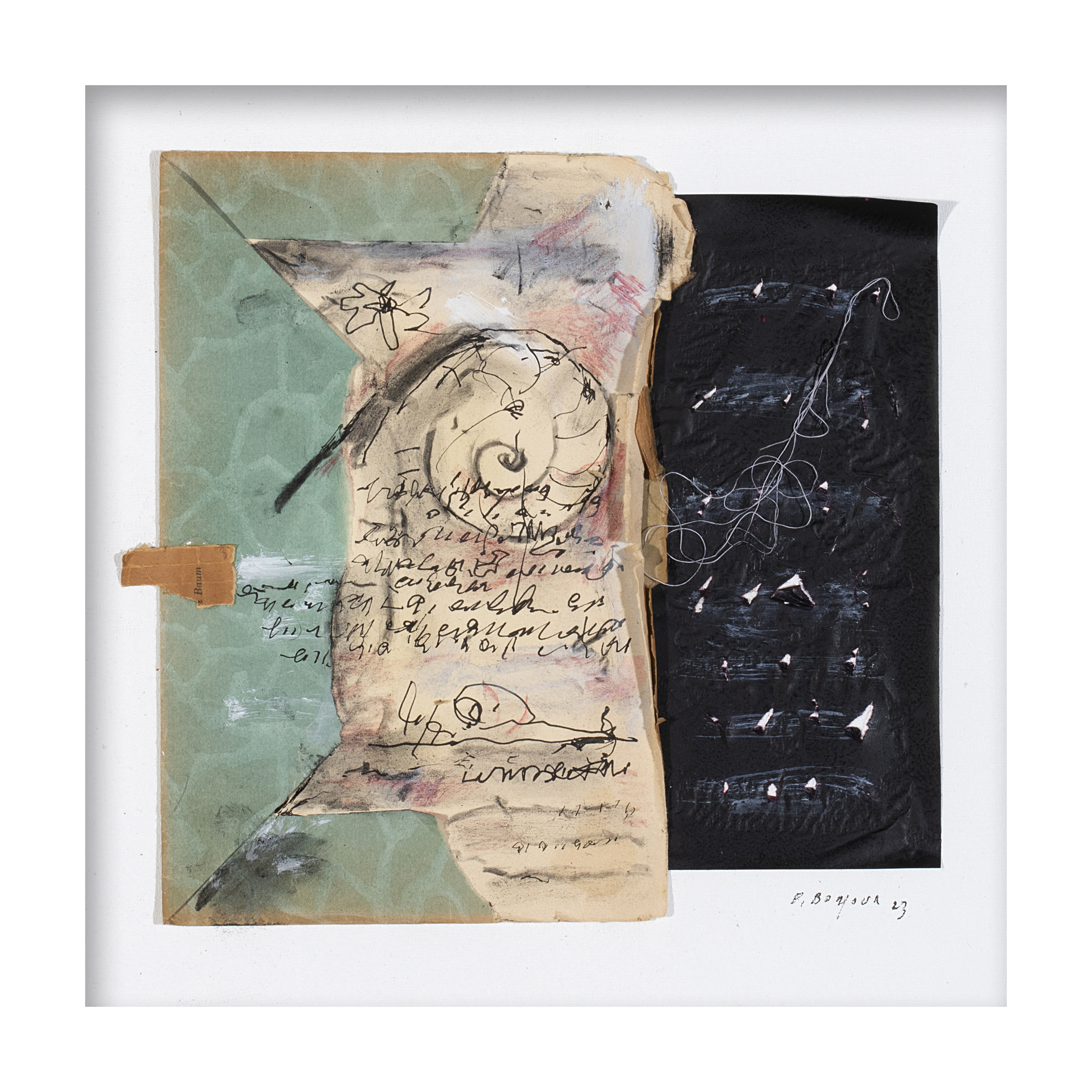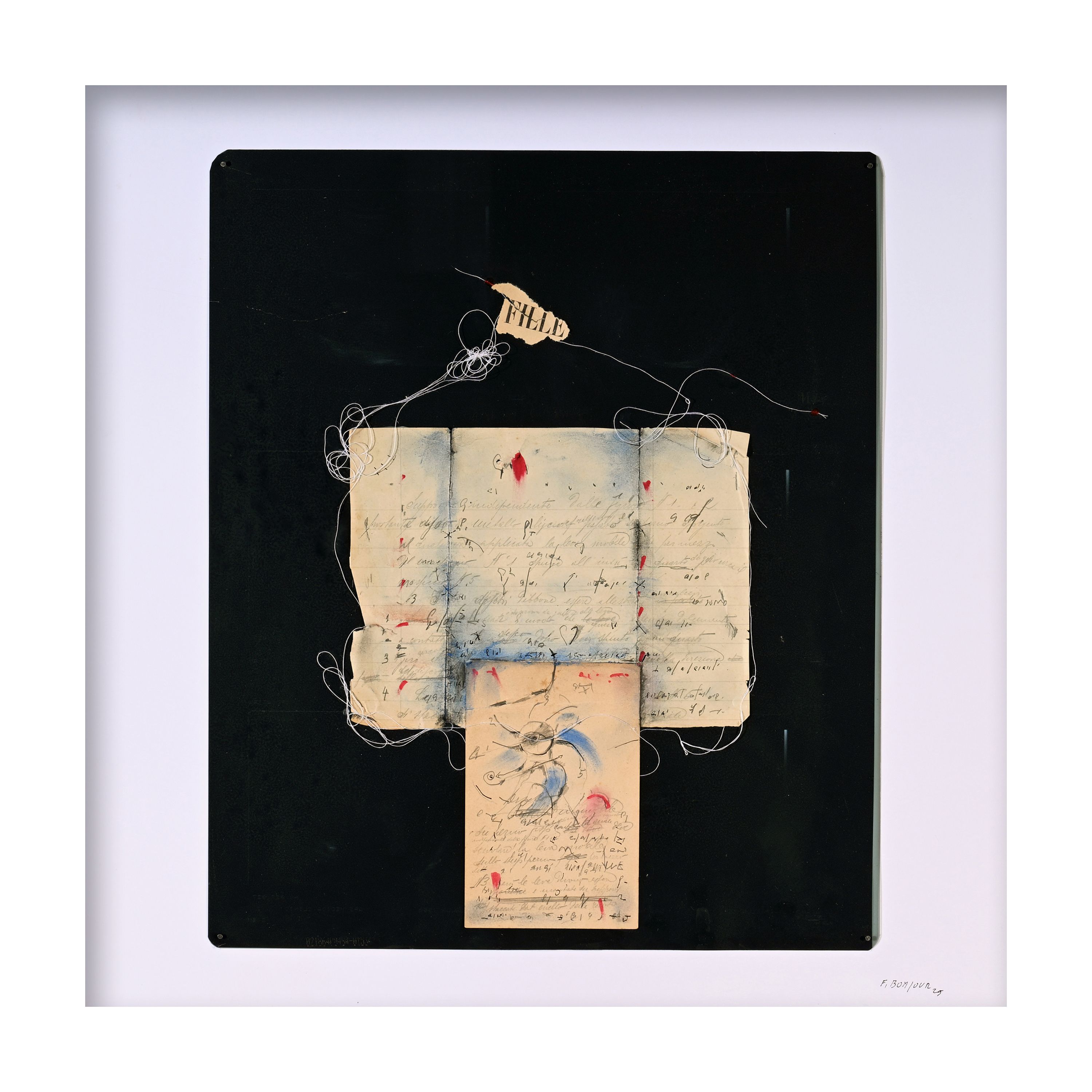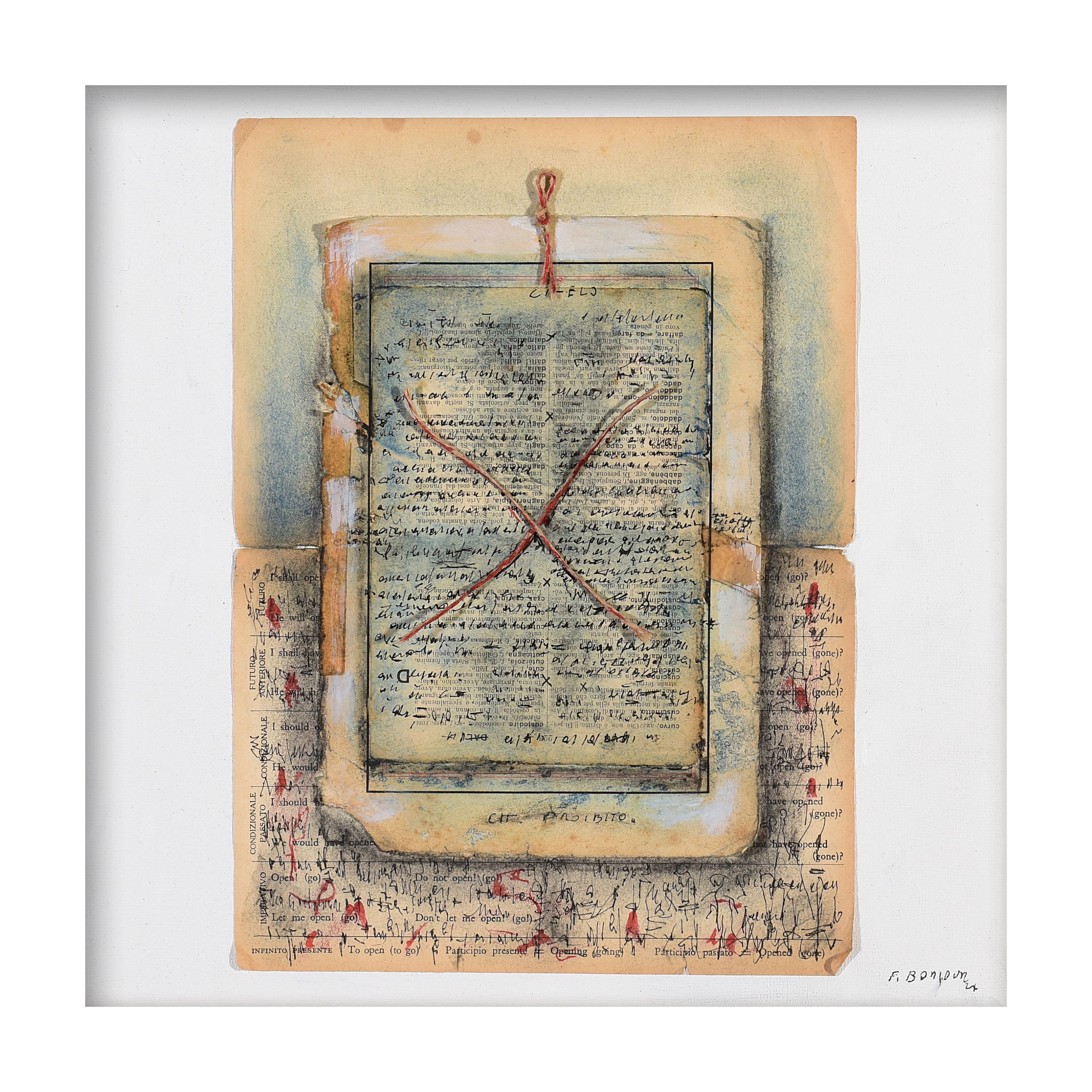 Bonjour adopts an expressive language of great material richness, juxtaposing heterogeneous elements with surprising harmony. His paintings often transcend the boundaries of the canvas, taking on an almost three-dimensional dimension thanks to the inclusion of unconventional objects and materials. On backgrounds prepared with mixed techniques, the artist applies sheets of paper, scraps of fabric, pages of books worn out by time, newspaper clippings, interweaving them with threads of string, ropes, wood fragments, red wax, broken glass and pigments. These poor materials - the 'skin of the city' as he ideally defines it - carry with them the echo of human presences, evoking lives and stories both past and future. Writing plays a central role in his compositions: elegant words and calligraphies appear, sometimes clearly legible, more often reduced to mysterious and indecipherable signs. This fusion of text and image recalls the legacy of Visual Poetry, but Bonjour reworks it in an entirely personal way. The written page is transformed into a visual element: it can be burnt at the edges, torn or covered with invented graphisms, becoming itself a surface to be contemplated. The combination of these verbal and iconic signs builds a dense and meaningful texture. Nothing is left to chance: the artist composes the different fragments with meticulous care, balancing solids and voids, light and dark, rigidity and fluidity. The result is works of refined elegance, in which the layering of materials creates physical and conceptual depth. Every detail - from the small piece of wax to a thin thread running through the paper - contributes to the overall meaning, inviting the observer into a silent conversation with the work. The result is a unique visual language, sober but incisive, capable of speaking on different levels: cultured and at the same time immediate, intimate and universal.