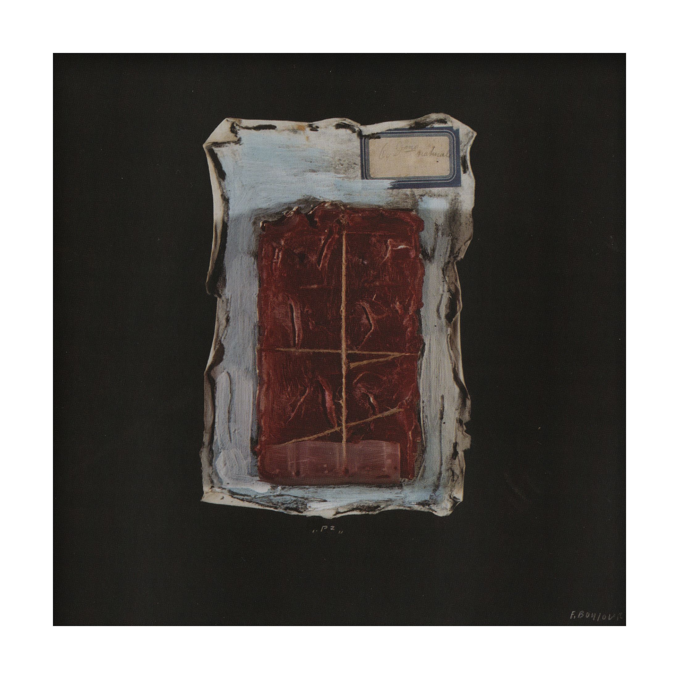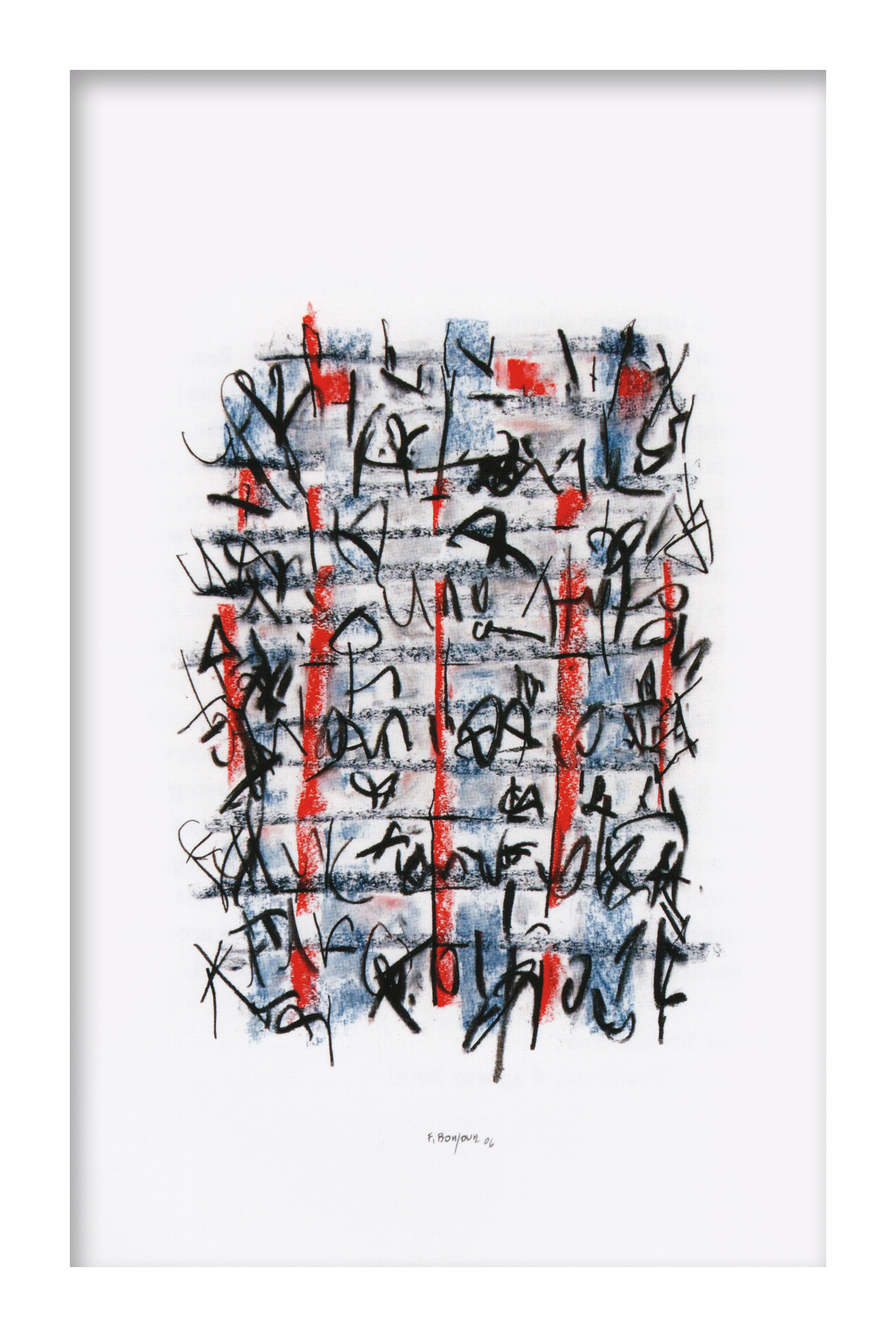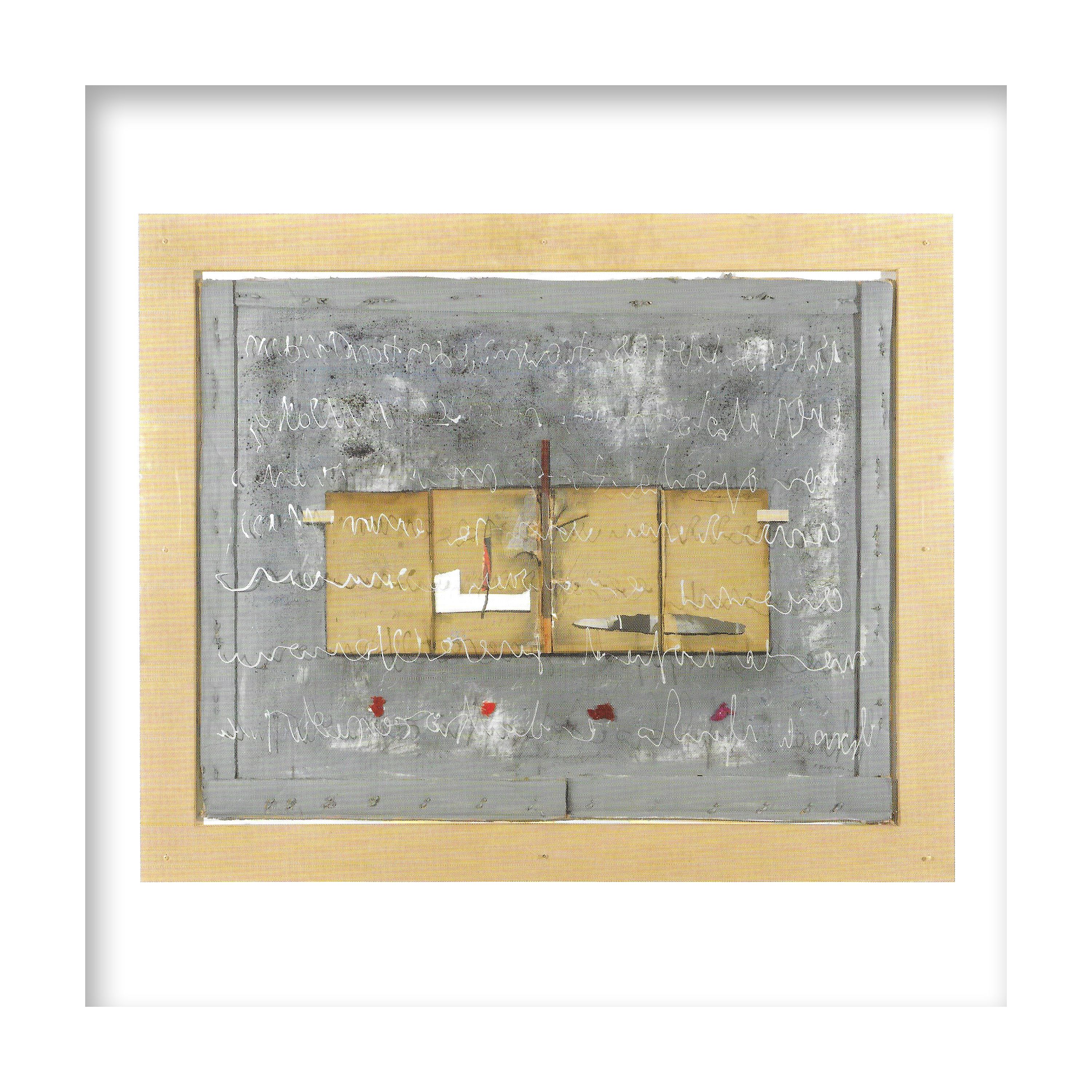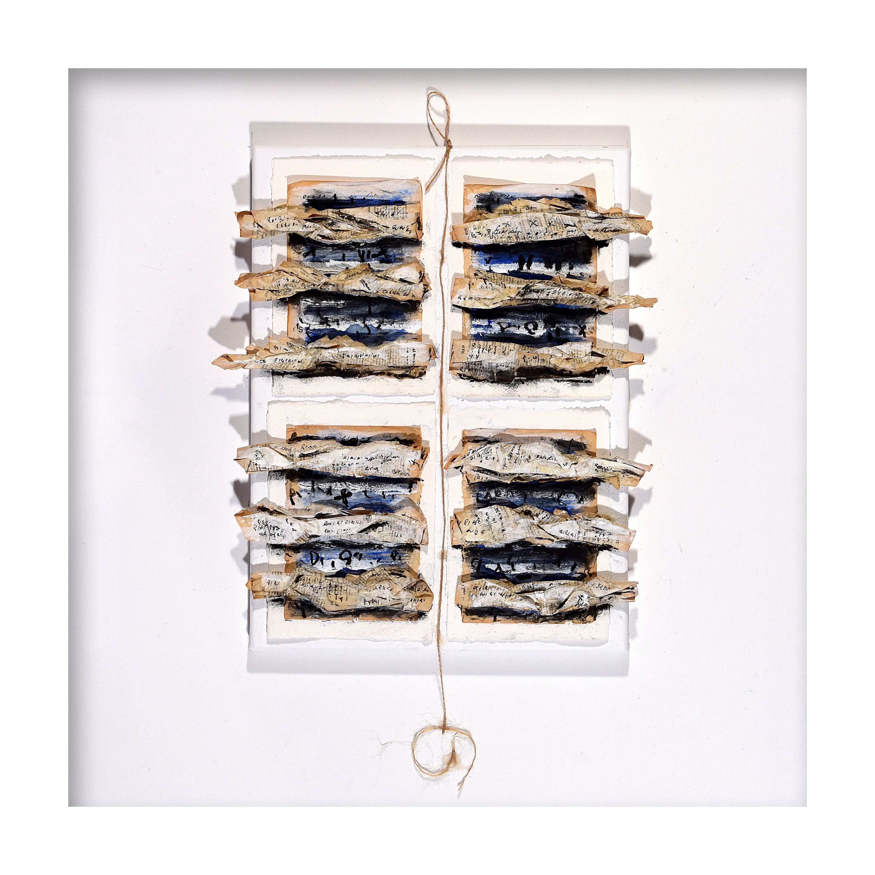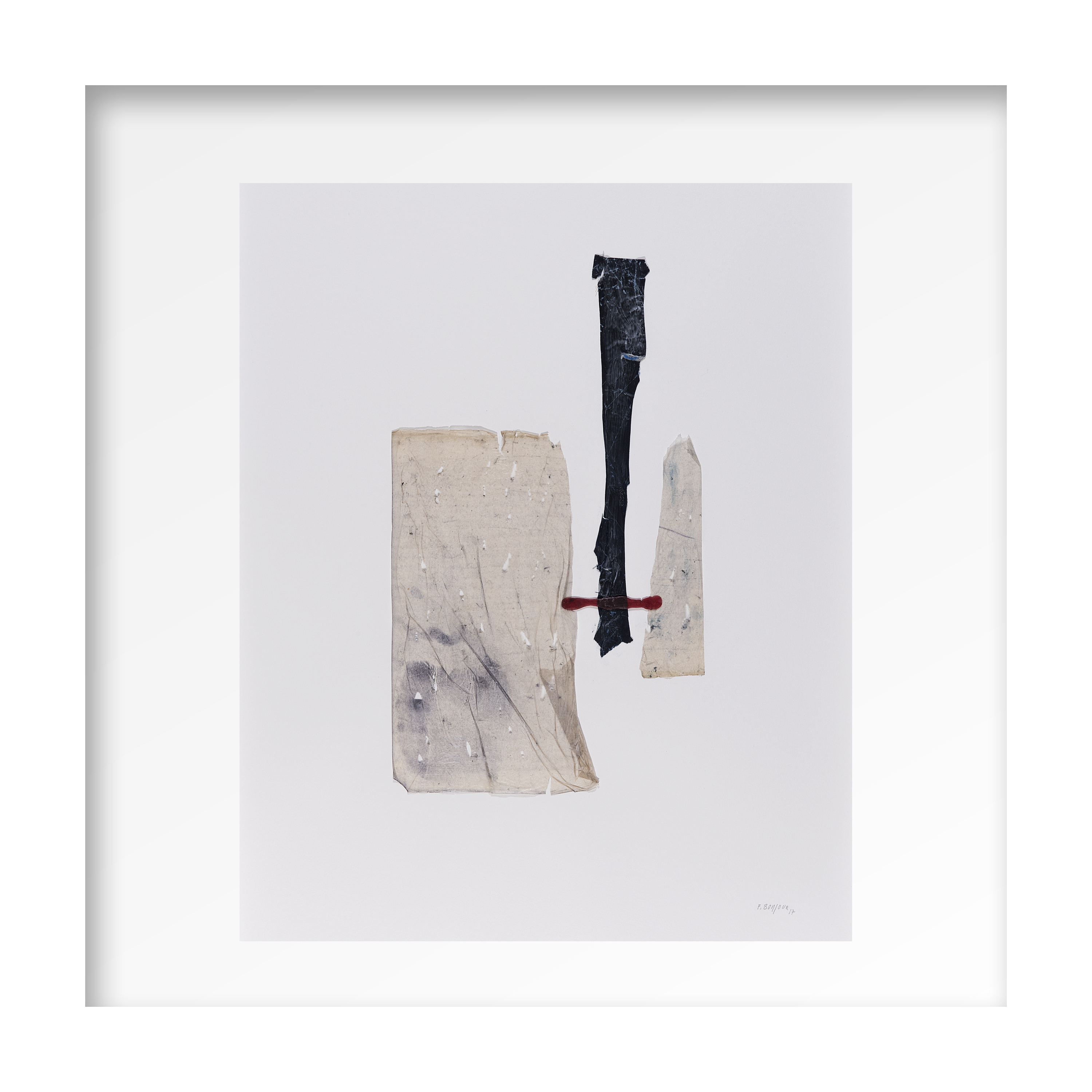 Bonjour adopts an expressive language of great material richness, juxtaposing heterogeneous elements with surprising harmony. His paintings often transcend the boundaries of the canvas, taking on an almost three-dimensional dimension thanks to the inclusion of unconventional objects and materials. On backgrounds prepared with mixed techniques, the artist applies sheets of paper, scraps of fabric, pages of books worn out by time, newspaper clippings, interweaving them with threads of string, ropes, wood fragments, red wax, broken glass and pigments. These poor materials - the 'skin of the city' as he ideally defines it - carry with them the echo of human presences, evoking lives and stories both past and future. Writing plays a central role in his compositions: elegant words and calligraphies appear, sometimes clearly legible, more often reduced to mysterious and indecipherable signs. This fusion of text and image recalls the legacy of Visual Poetry, but Bonjour reworks it in an entirely personal way. The written page is transformed into a visual element: it can be burnt at the edges, torn or covered with invented graphisms, becoming itself a surface to be contemplated. The combination of these verbal and iconic signs builds a dense and meaningful texture. Nothing is left to chance: the artist composes the different fragments with meticulous care, balancing solids and voids, light and dark, rigidity and fluidity. The result is works of refined elegance, in which the layering of materials creates physical and conceptual depth. Every detail - from the small piece of wax to a thin thread running through the paper - contributes to the overall meaning, inviting the observer into a silent conversation with the work. The result is a unique visual language, sober but incisive, capable of speaking on different levels: cultured and at the same time immediate, intimate and universal.