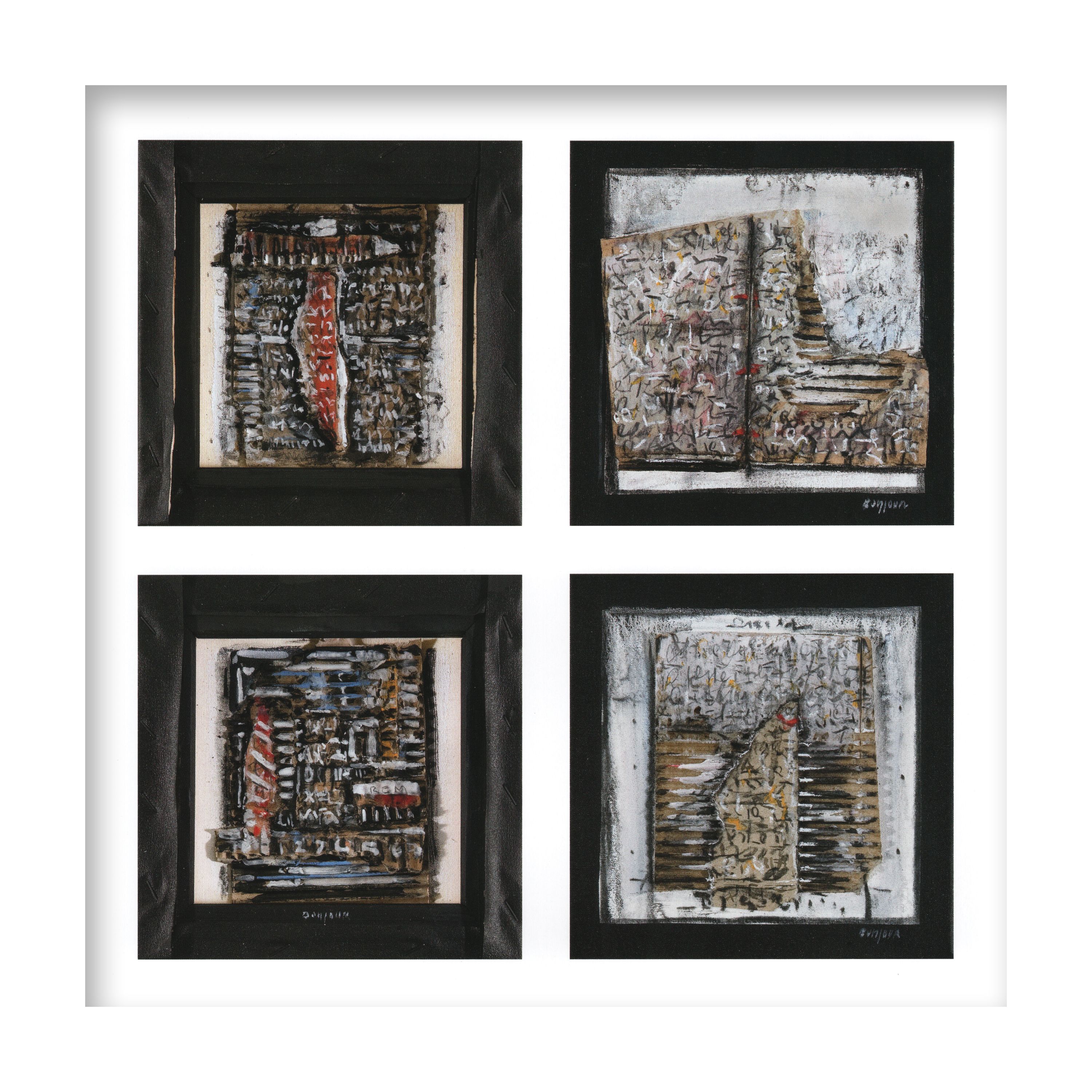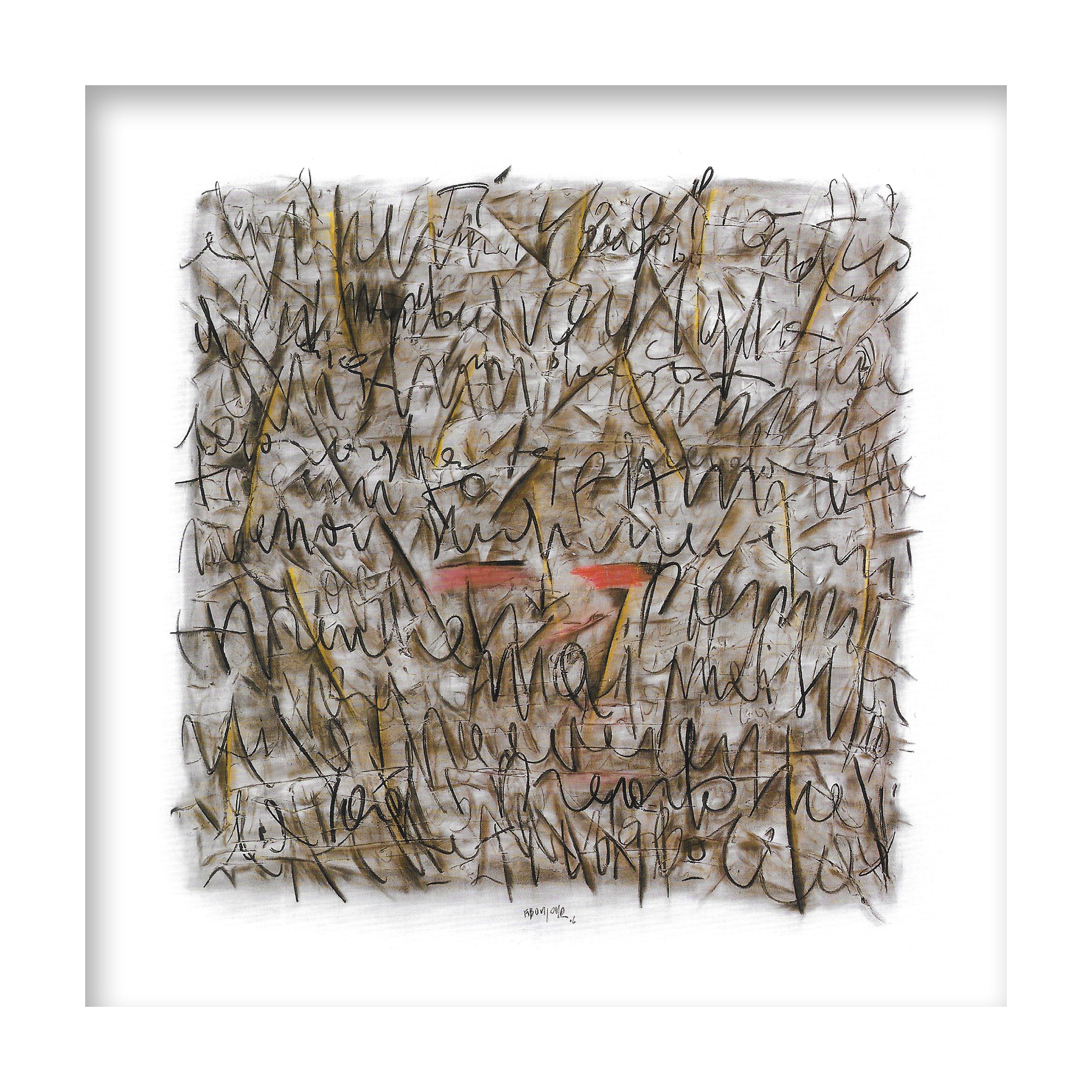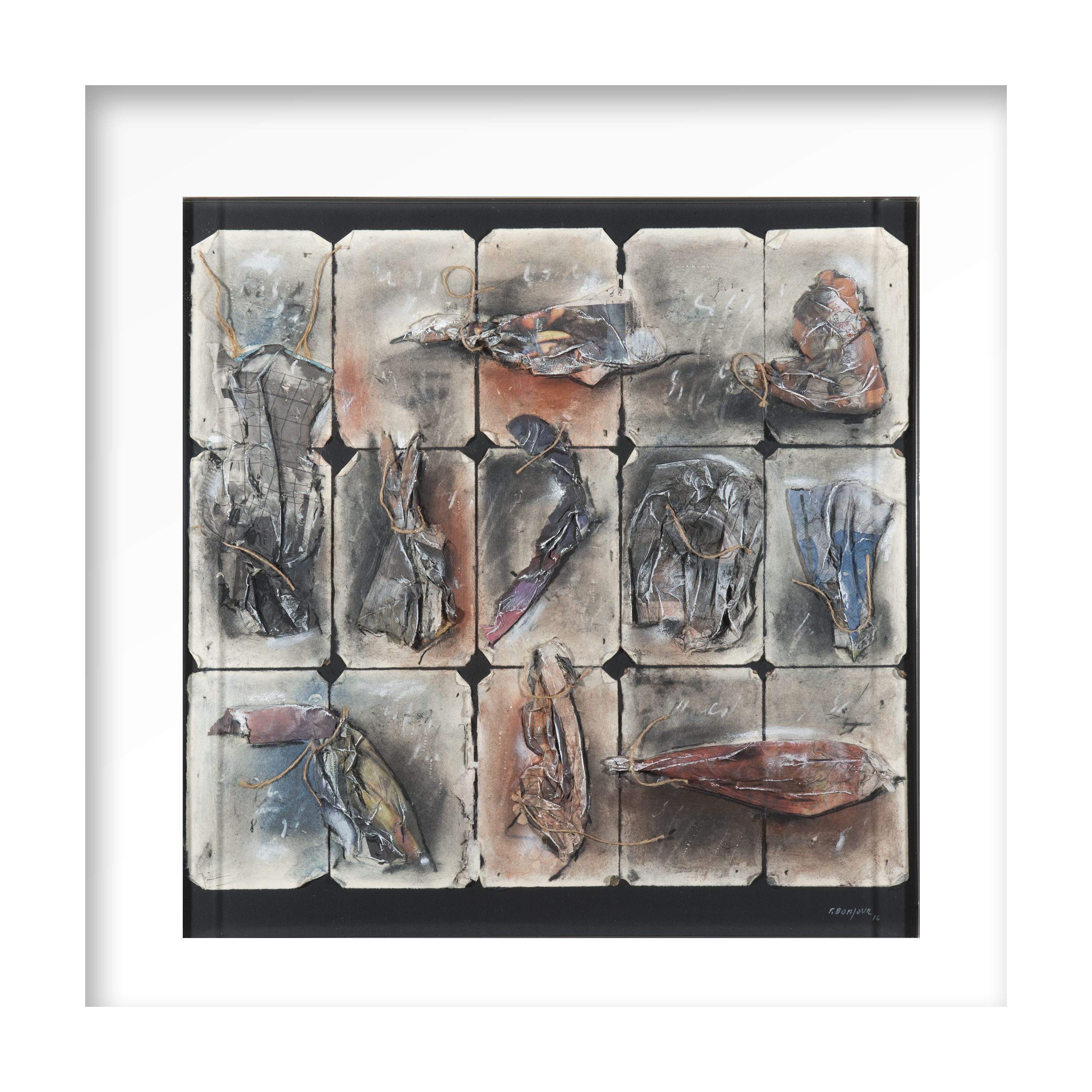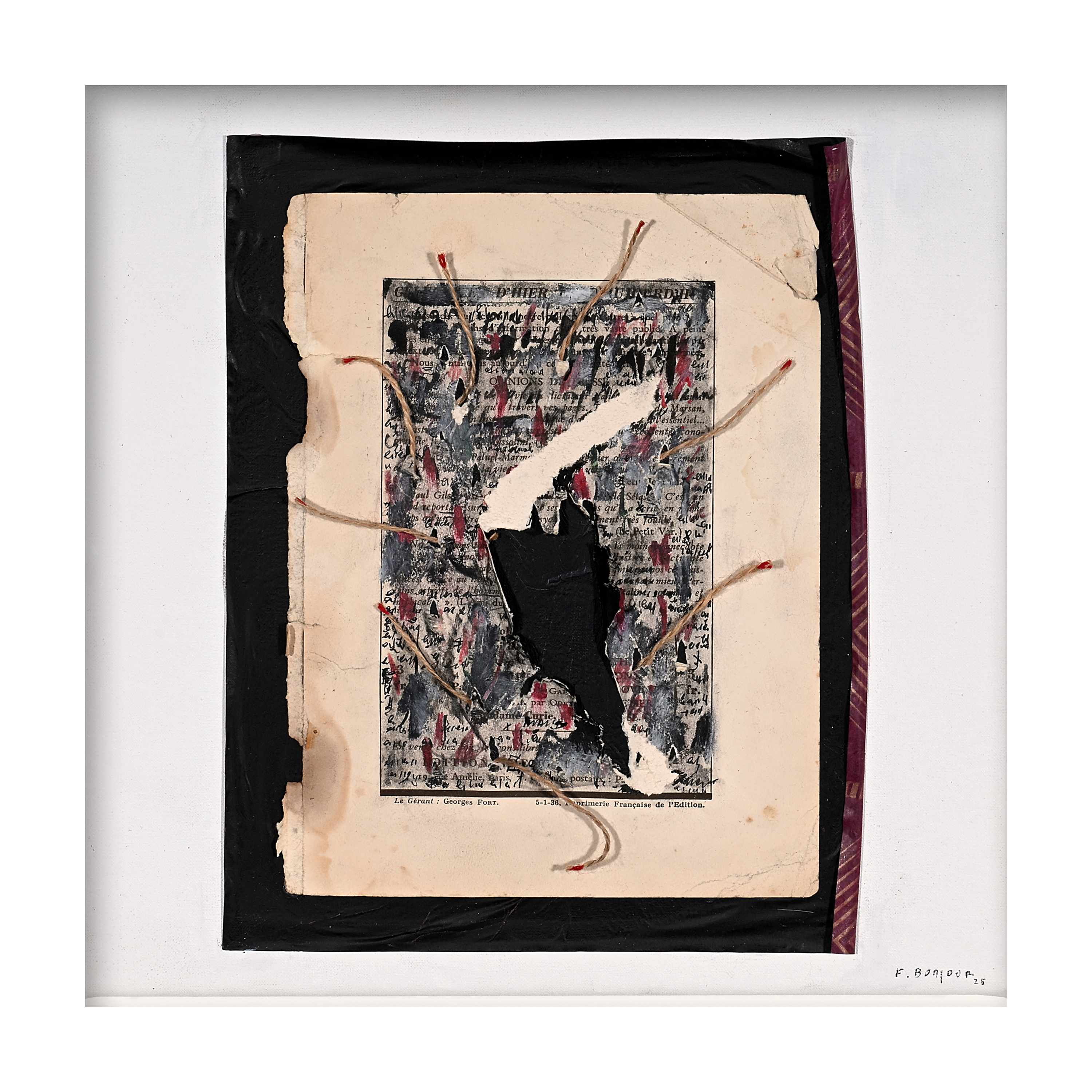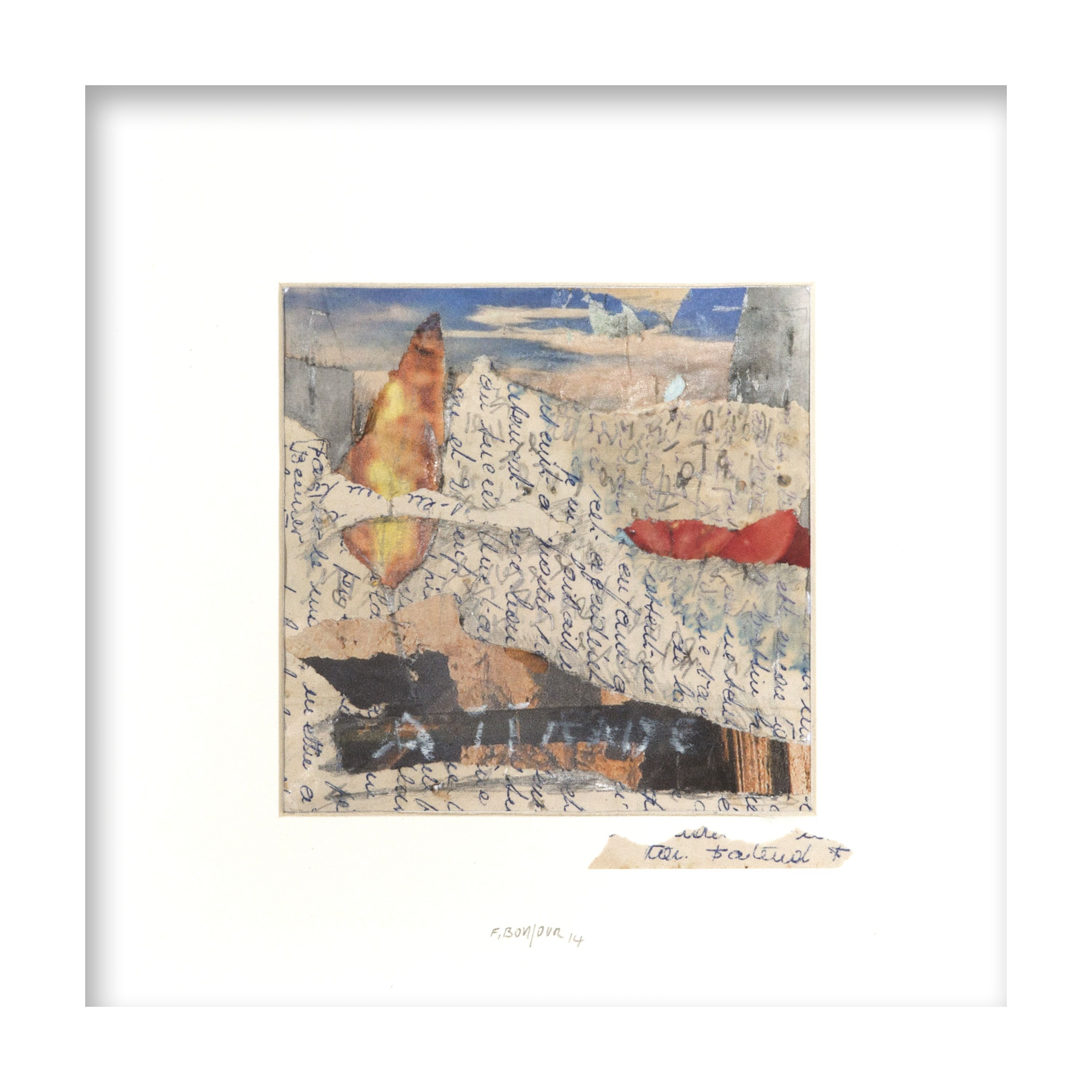 Bonjour adopts an expressive language of great material richness, juxtaposing heterogeneous elements with surprising harmony. His paintings often transcend the boundaries of the canvas, taking on an almost three-dimensional dimension thanks to the inclusion of unconventional objects and materials. On backgrounds prepared with mixed techniques, the artist applies sheets of paper, scraps of fabric, pages of books worn out by time, newspaper clippings, interweaving them with threads of string, ropes, wood fragments, red wax, broken glass and pigments. These poor materials - the 'skin of the city' as he ideally defines it - carry with them the echo of human presences, evoking lives and stories both past and future. Writing plays a central role in his compositions: elegant words and calligraphies appear, sometimes clearly legible, more often reduced to mysterious and indecipherable signs. This fusion of text and image recalls the legacy of Visual Poetry, but Bonjour reworks it in an entirely personal way. The written page is transformed into a visual element: it can be burnt at the edges, torn or covered with invented graphisms, becoming itself a surface to be contemplated. The combination of these verbal and iconic signs builds a dense and meaningful texture. Nothing is left to chance: the artist composes the different fragments with meticulous care, balancing solids and voids, light and dark, rigidity and fluidity. The result is works of refined elegance, in which the layering of materials creates physical and conceptual depth. Every detail - from the small piece of wax to a thin thread running through the paper - contributes to the overall meaning, inviting the observer into a silent conversation with the work. The result is a unique visual language, sober but incisive, capable of speaking on different levels: cultured and at the same time immediate, intimate and universal.