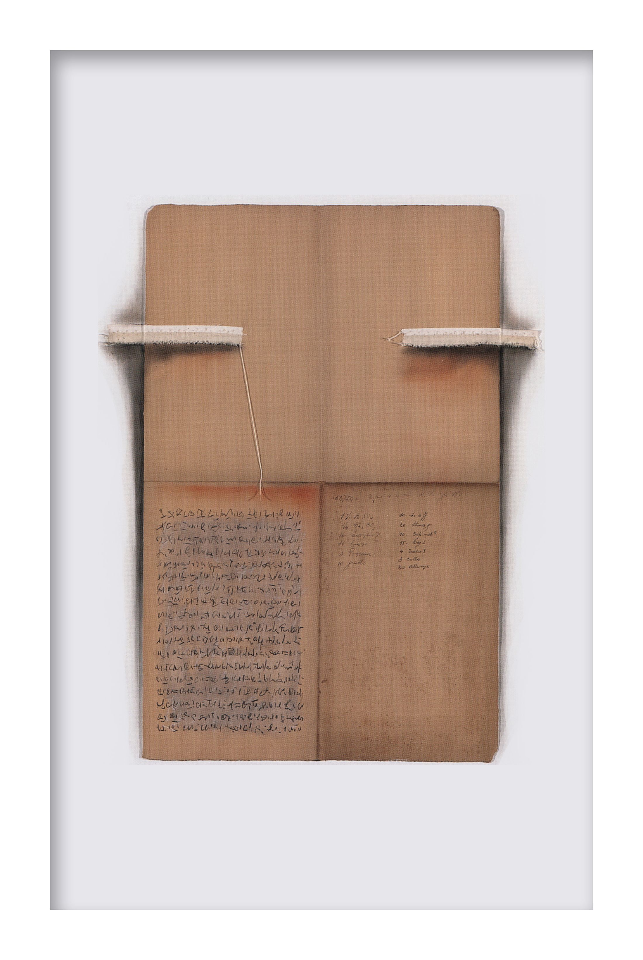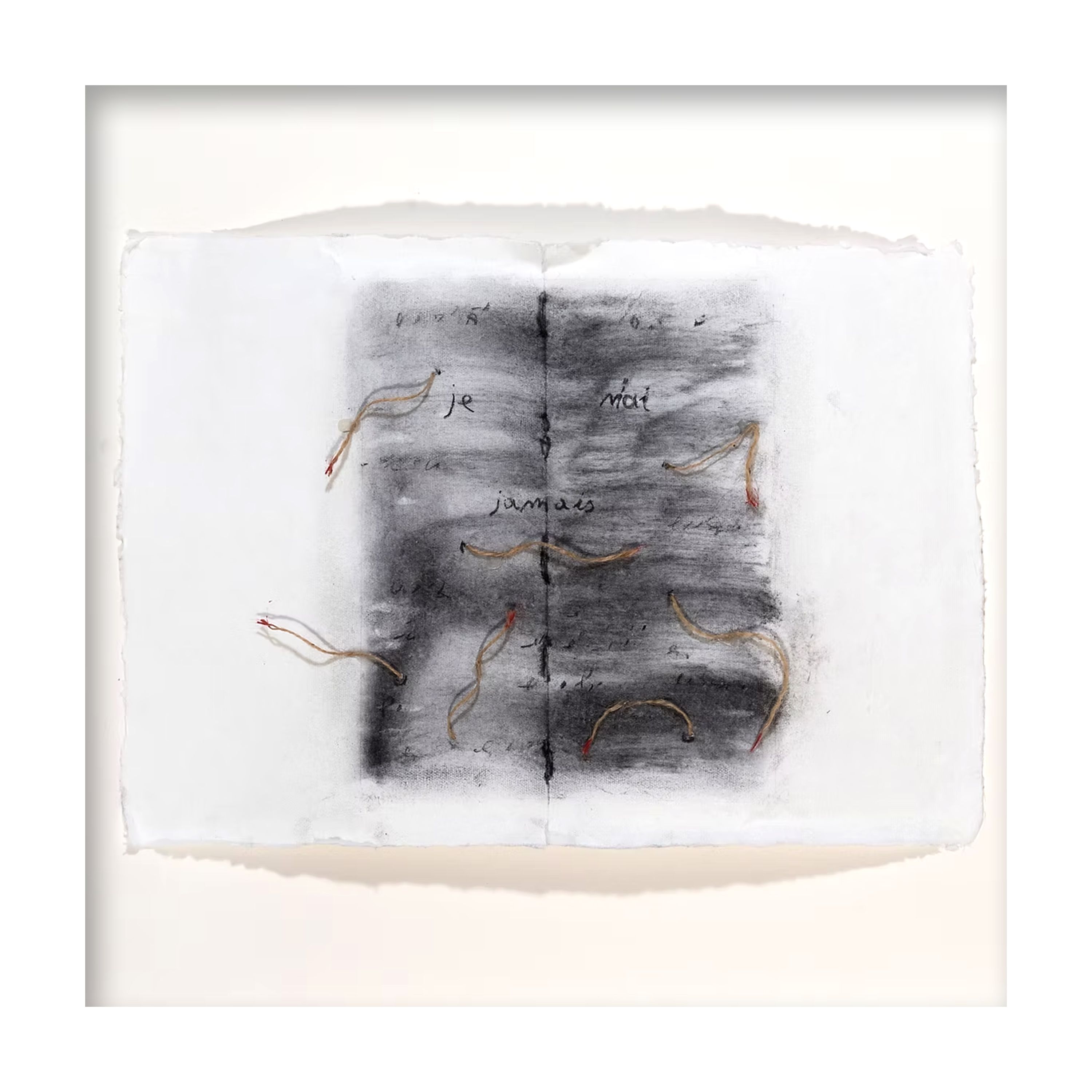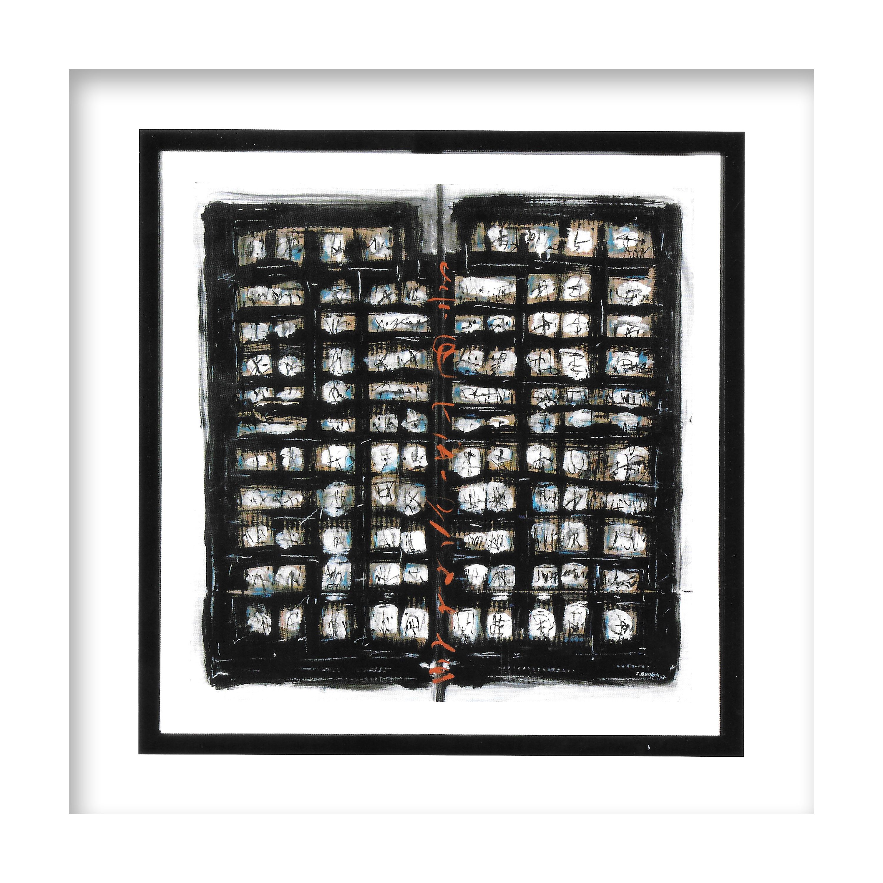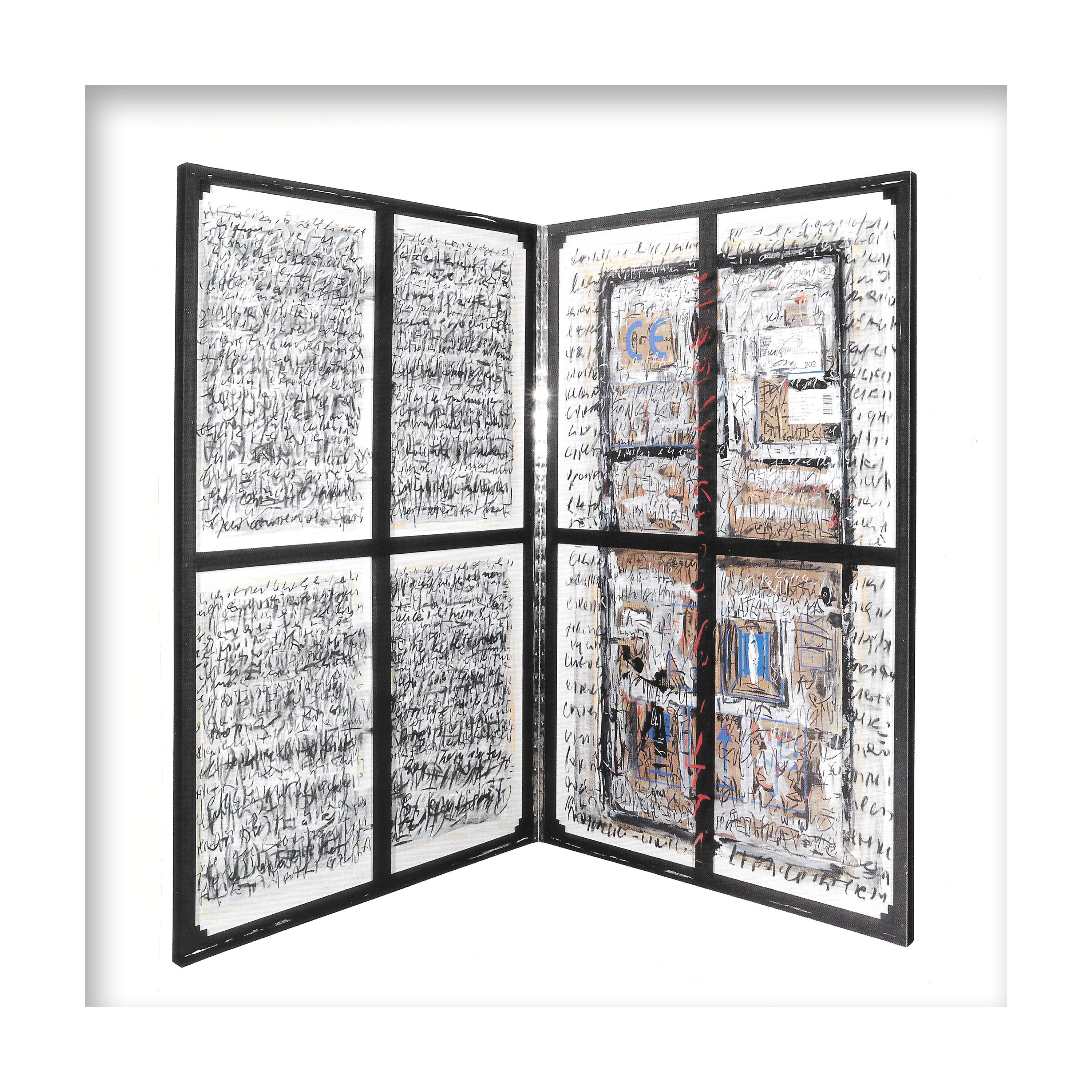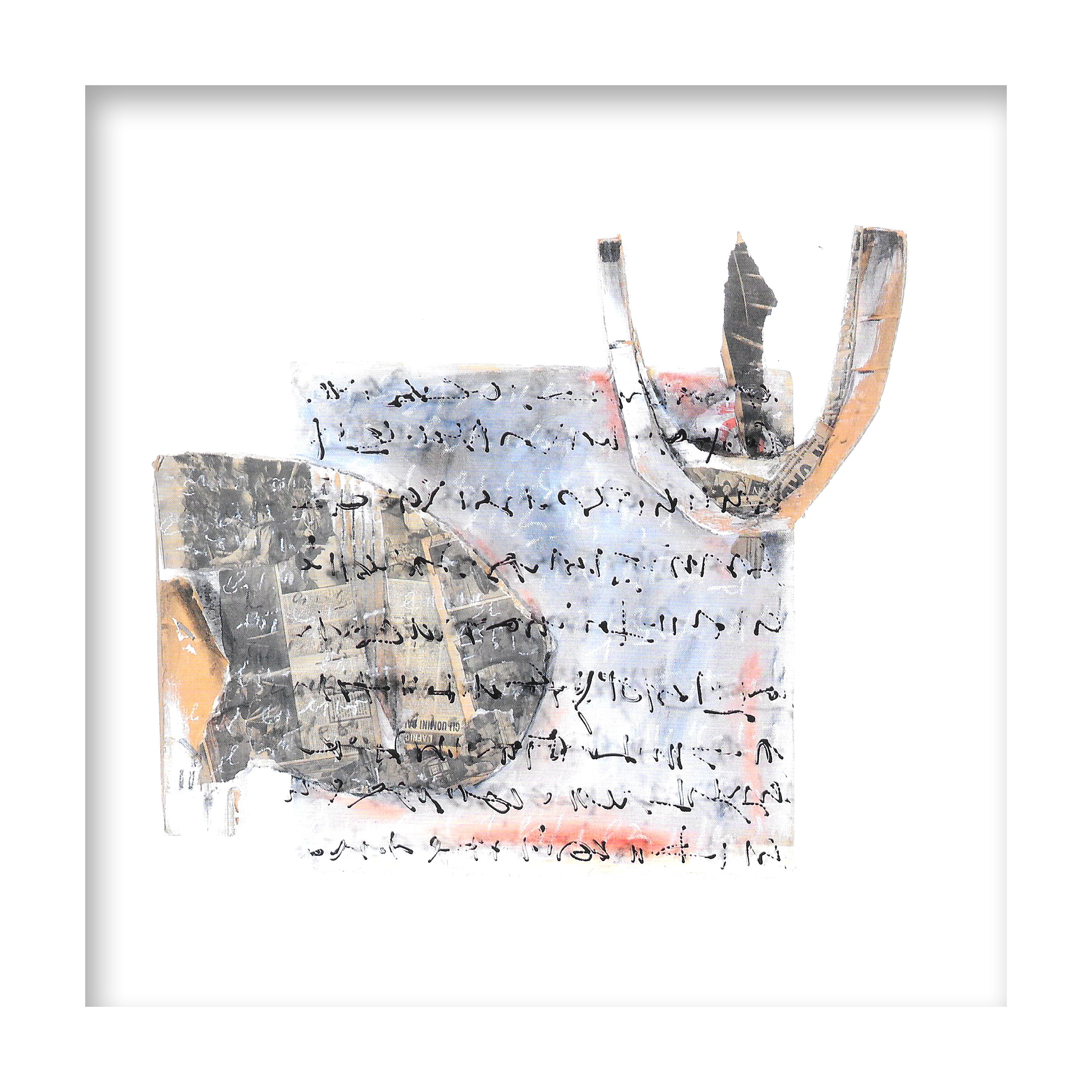 Bonjour adopts an expressive language of great material richness, juxtaposing heterogeneous elements with surprising harmony. His paintings often transcend the boundaries of the canvas, taking on an almost three-dimensional dimension thanks to the inclusion of unconventional objects and materials. On backgrounds prepared with mixed techniques, the artist applies sheets of paper, scraps of fabric, pages of books worn out by time, newspaper clippings, interweaving them with threads of string, ropes, wood fragments, red wax, broken glass and pigments. These poor materials - the 'skin of the city' as he ideally defines it - carry with them the echo of human presences, evoking lives and stories both past and future. Writing plays a central role in his compositions: elegant words and calligraphies appear, sometimes clearly legible, more often reduced to mysterious and indecipherable signs. This fusion of text and image recalls the legacy of Visual Poetry, but Bonjour reworks it in an entirely personal way. The written page is transformed into a visual element: it can be burnt at the edges, torn or covered with invented graphisms, becoming itself a surface to be contemplated. The combination of these verbal and iconic signs builds a dense and meaningful texture. Nothing is left to chance: the artist composes the different fragments with meticulous care, balancing solids and voids, light and dark, rigidity and fluidity. The result is works of refined elegance, in which the layering of materials creates physical and conceptual depth. Every detail - from the small piece of wax to a thin thread running through the paper - contributes to the overall meaning, inviting the observer into a silent conversation with the work. The result is a unique visual language, sober but incisive, capable of speaking on different levels: cultured and at the same time immediate, intimate and universal.