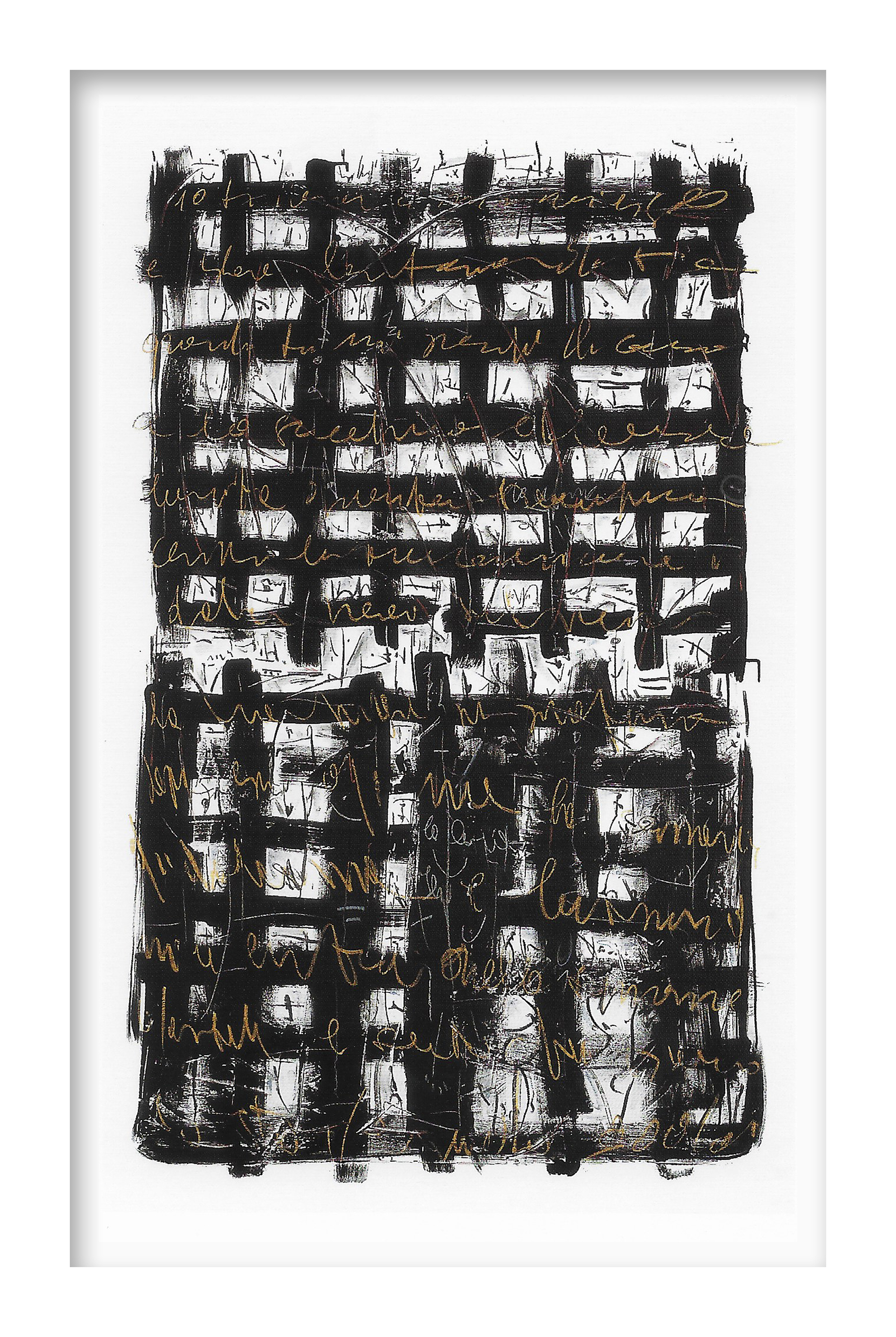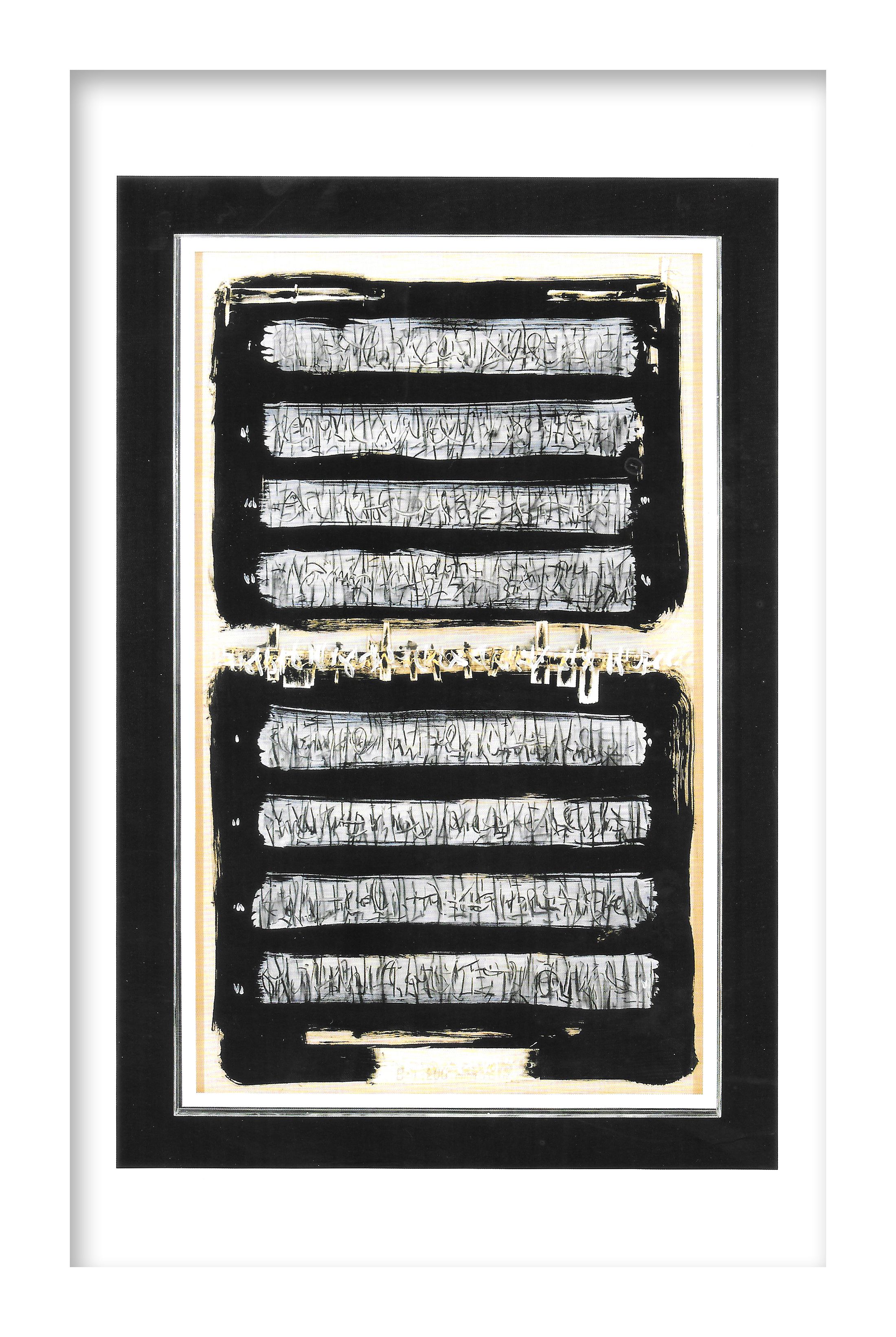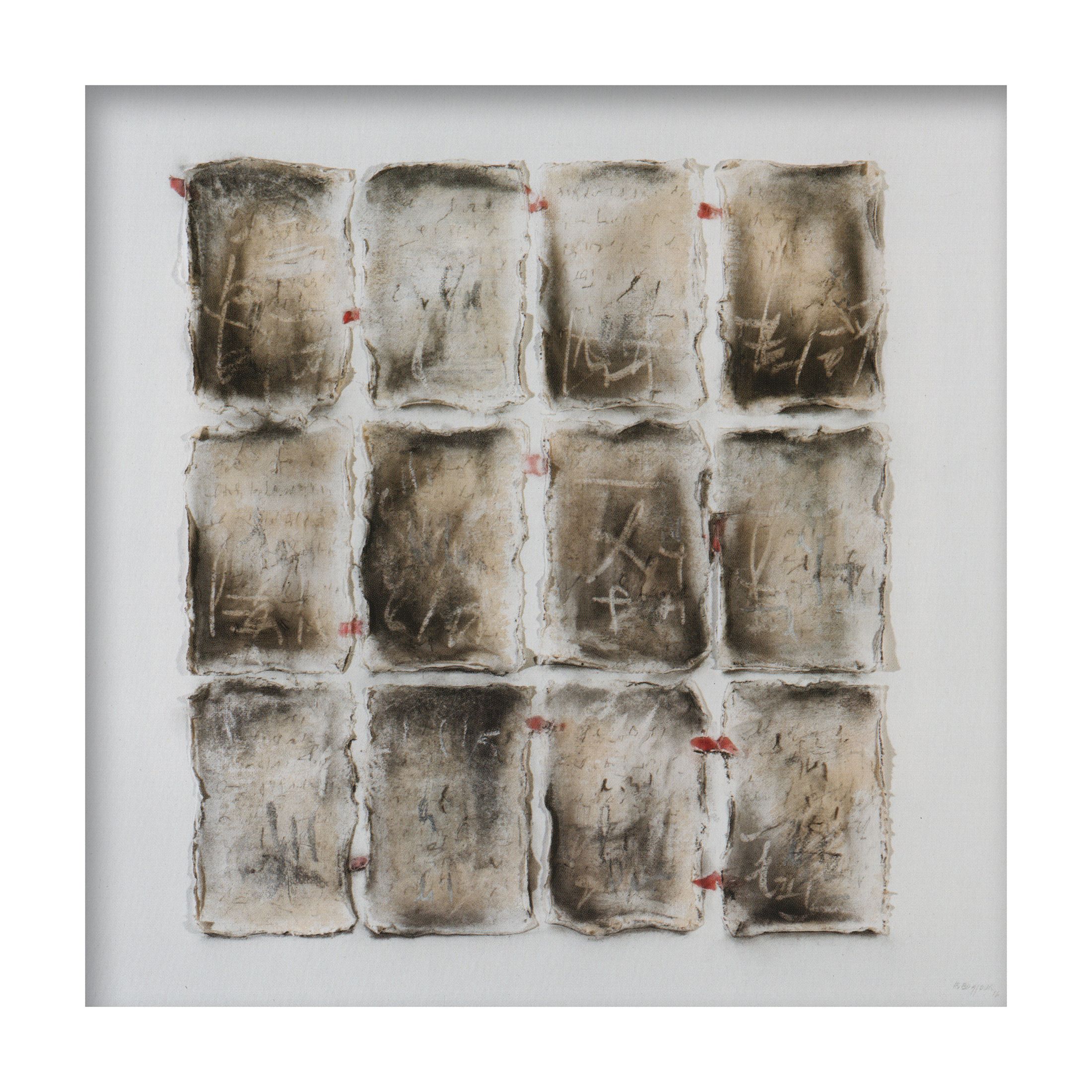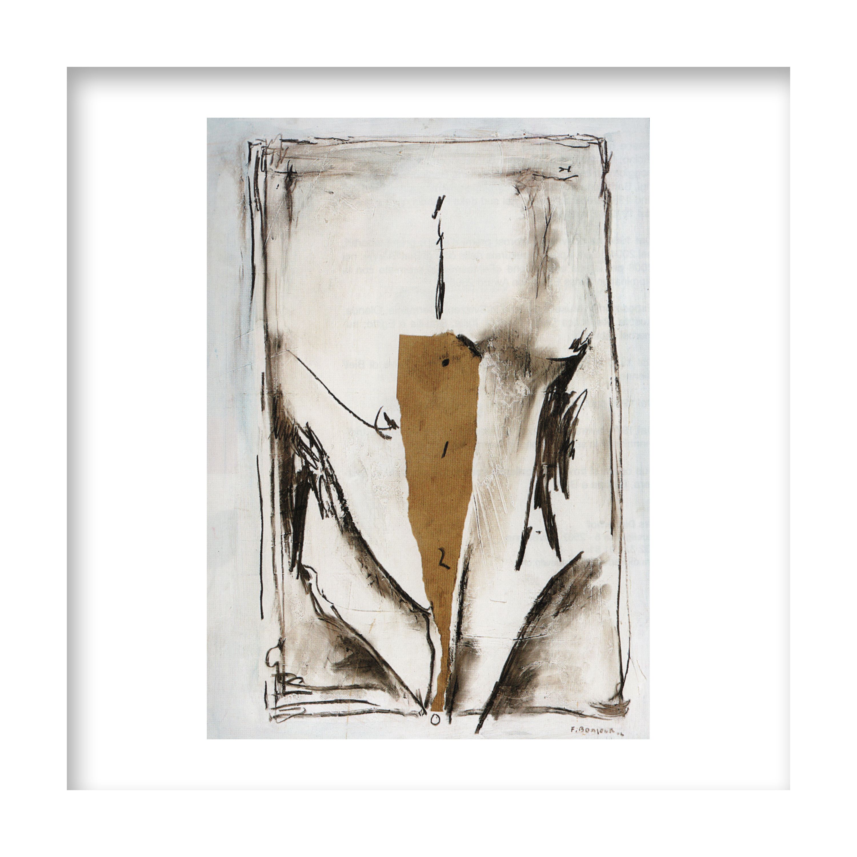 Bonjour adopts an expressive language of great material richness, juxtaposing heterogeneous elements with surprising harmony. His paintings often transcend the boundaries of the canvas, taking on an almost three-dimensional dimension thanks to the inclusion of unconventional objects and materials. On backgrounds prepared with mixed techniques, the artist applies sheets of paper, scraps of fabric, pages of books worn out by time, newspaper clippings, interweaving them with threads of string, ropes, wood fragments, red wax, broken glass and pigments. These poor materials - the 'skin of the city' as he ideally defines it - carry with them the echo of human presences, evoking lives and stories both past and future. Writing plays a central role in his compositions: elegant words and calligraphies appear, sometimes clearly legible, more often reduced to mysterious and indecipherable signs. This fusion of text and image recalls the legacy of Visual Poetry, but Bonjour reworks it in an entirely personal way. The written page is transformed into a visual element: it can be burnt at the edges, torn or covered with invented graphisms, becoming itself a surface to be contemplated. The combination of these verbal and iconic signs builds a dense and meaningful texture. Nothing is left to chance: the artist composes the different fragments with meticulous care, balancing solids and voids, light and dark, rigidity and fluidity. The result is works of refined elegance, in which the layering of materials creates physical and conceptual depth. Every detail - from the small piece of wax to a thin thread running through the paper - contributes to the overall meaning, inviting the observer into a silent conversation with the work. The result is a unique visual language, sober but incisive, capable of speaking on different levels: cultured and at the same time immediate, intimate and universal.
