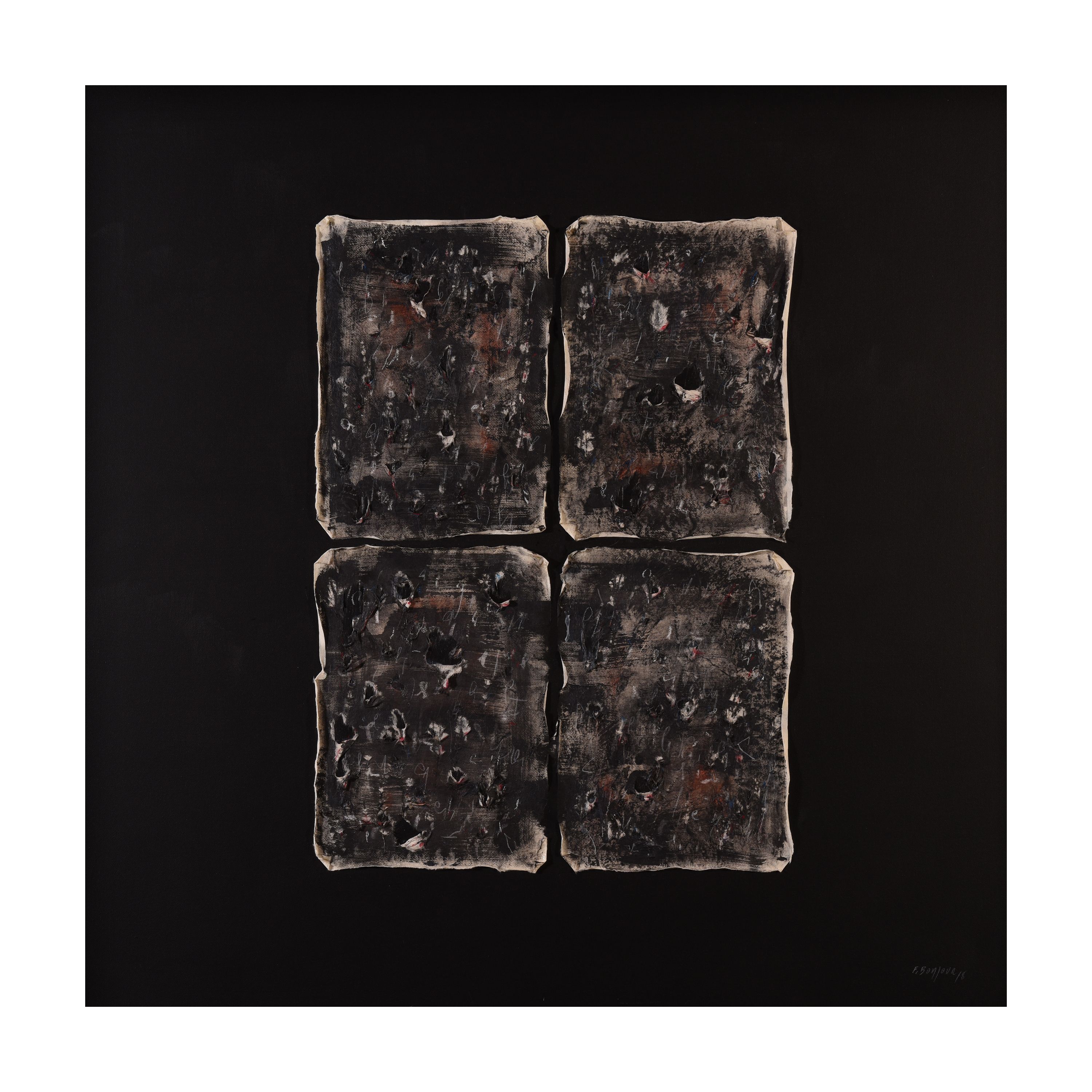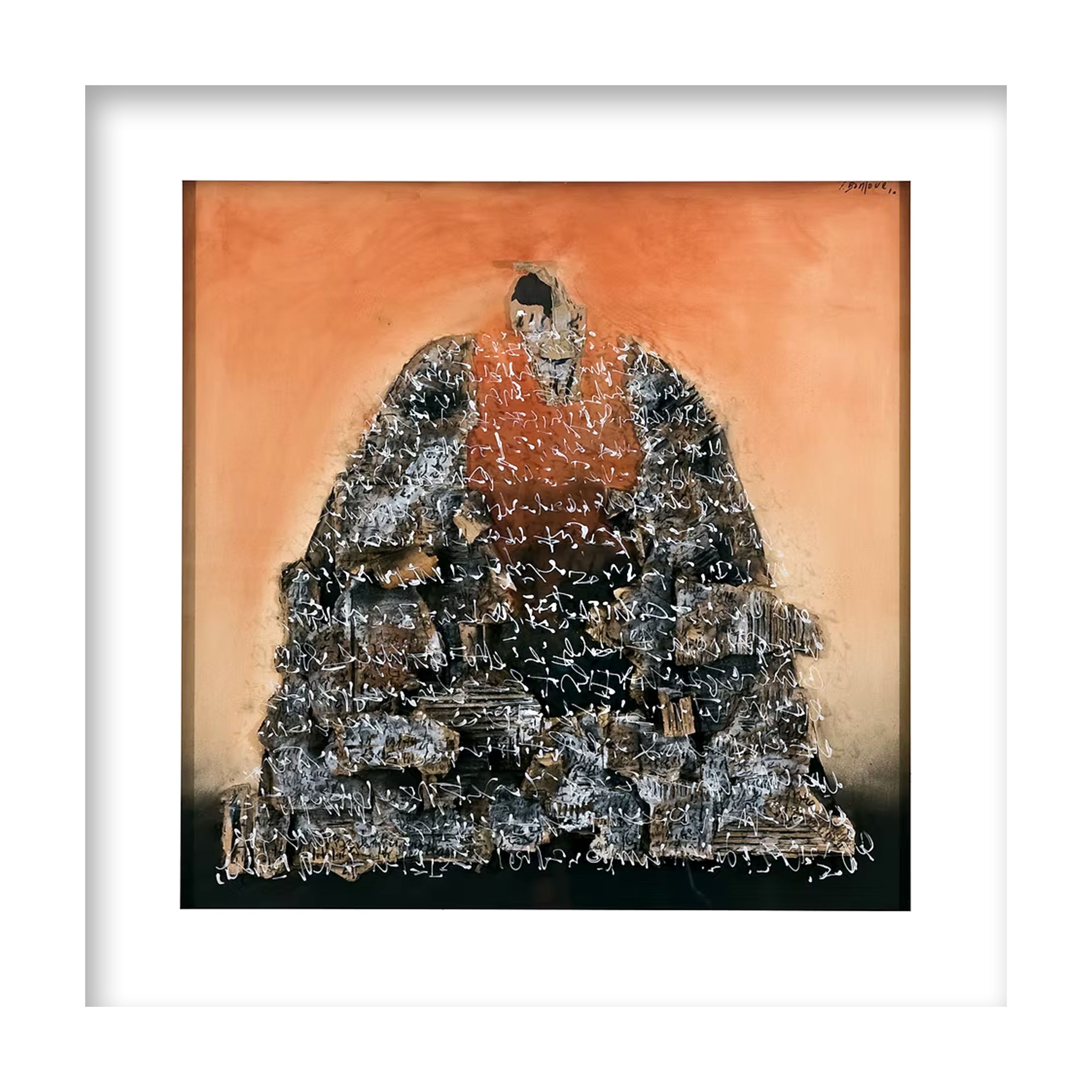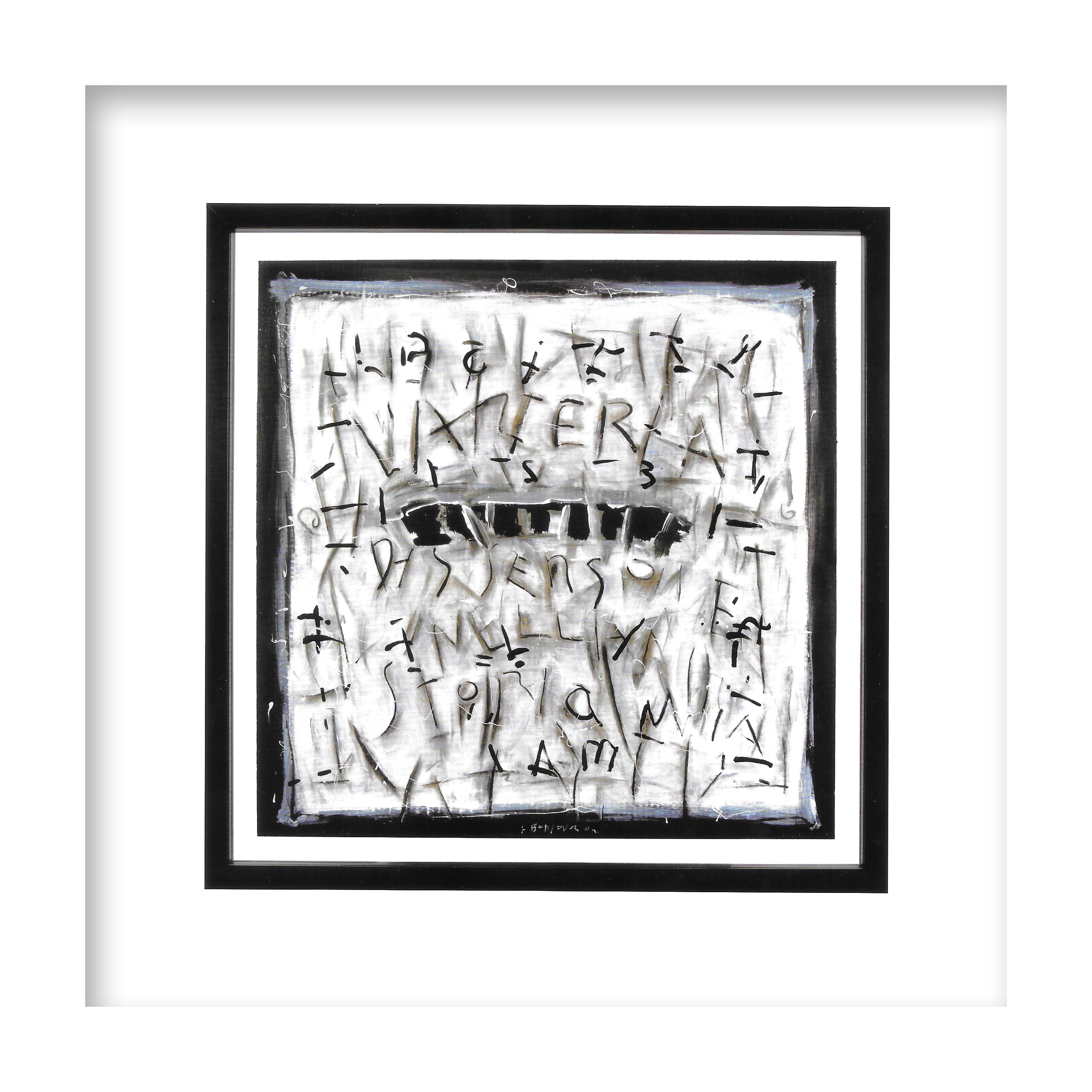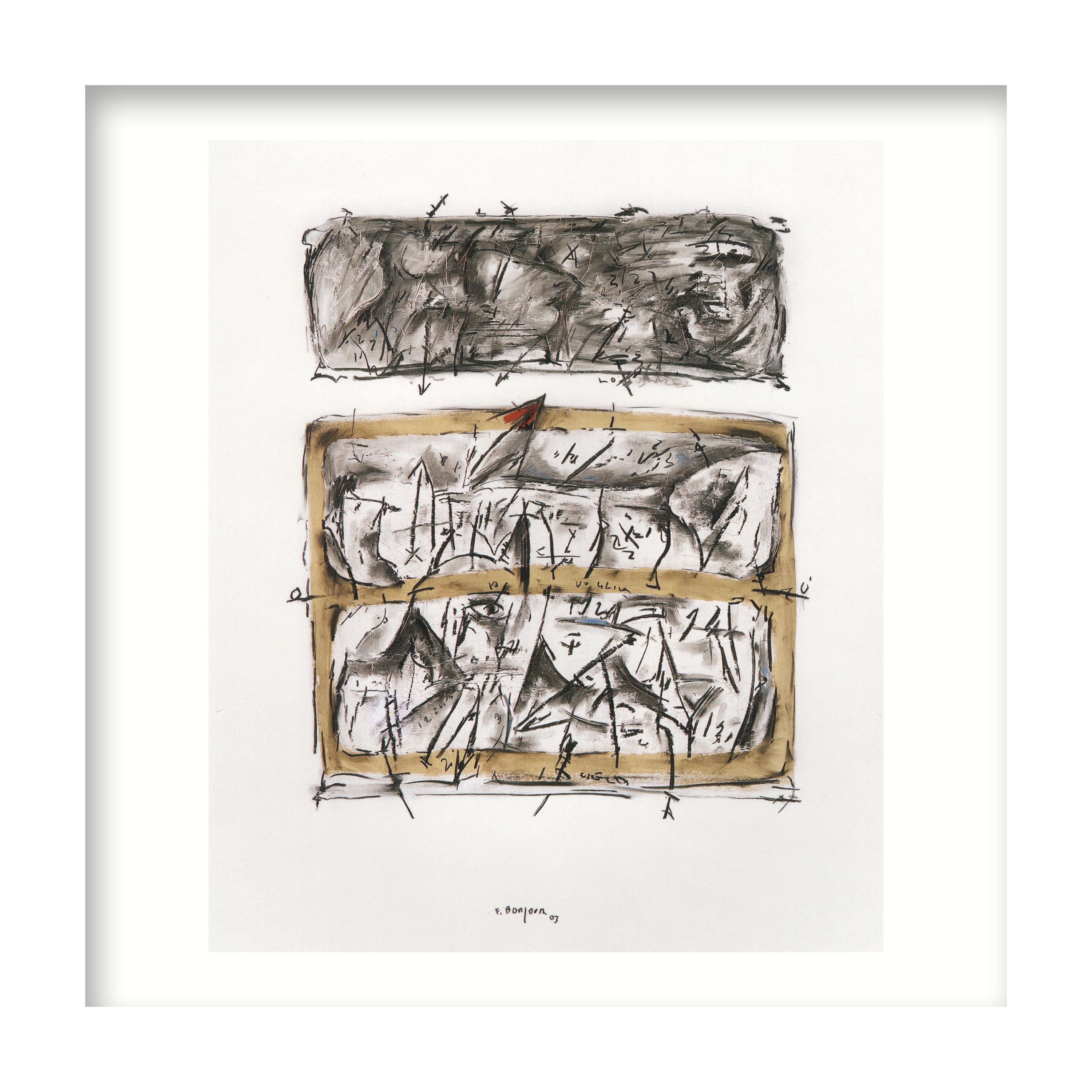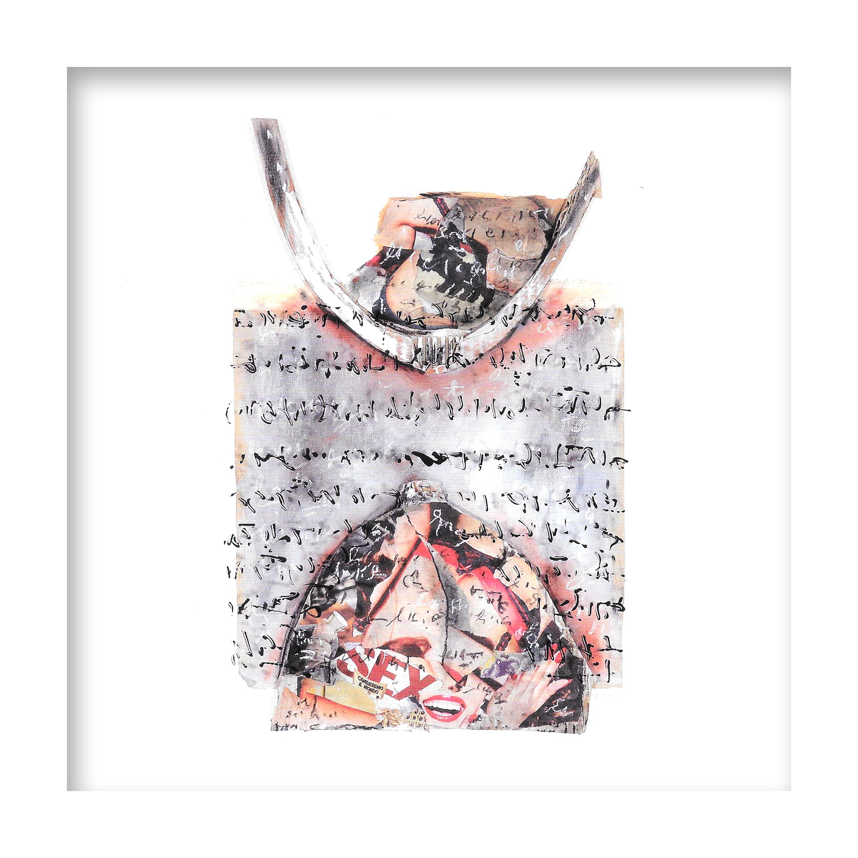 Bonjour adopts an expressive language of great material richness, juxtaposing heterogeneous elements with surprising harmony. His paintings often transcend the boundaries of the canvas, taking on an almost three-dimensional dimension thanks to the inclusion of unconventional objects and materials. On backgrounds prepared with mixed techniques, the artist applies sheets of paper, scraps of fabric, pages of books worn out by time, newspaper clippings, interweaving them with threads of string, ropes, wood fragments, red wax, broken glass and pigments. These poor materials - the 'skin of the city' as he ideally defines it - carry with them the echo of human presences, evoking lives and stories both past and future. Writing plays a central role in his compositions: elegant words and calligraphies appear, sometimes clearly legible, more often reduced to mysterious and indecipherable signs. This fusion of text and image recalls the legacy of Visual Poetry, but Bonjour reworks it in an entirely personal way. The written page is transformed into a visual element: it can be burnt at the edges, torn or covered with invented graphisms, becoming itself a surface to be contemplated. The combination of these verbal and iconic signs builds a dense and meaningful texture. Nothing is left to chance: the artist composes the different fragments with meticulous care, balancing solids and voids, light and dark, rigidity and fluidity. The result is works of refined elegance, in which the layering of materials creates physical and conceptual depth. Every detail - from the small piece of wax to a thin thread running through the paper - contributes to the overall meaning, inviting the observer into a silent conversation with the work. The result is a unique visual language, sober but incisive, capable of speaking on different levels: cultured and at the same time immediate, intimate and universal.