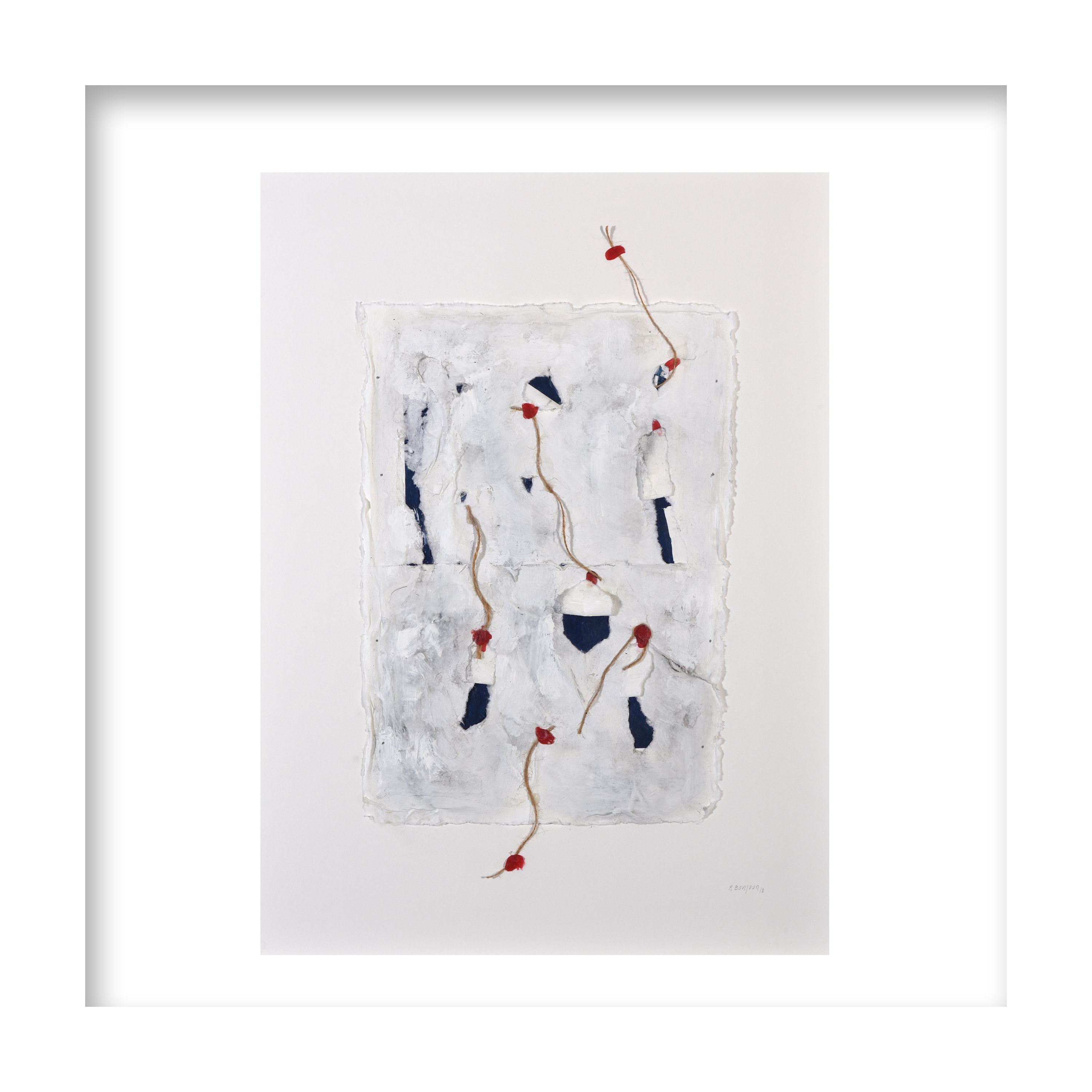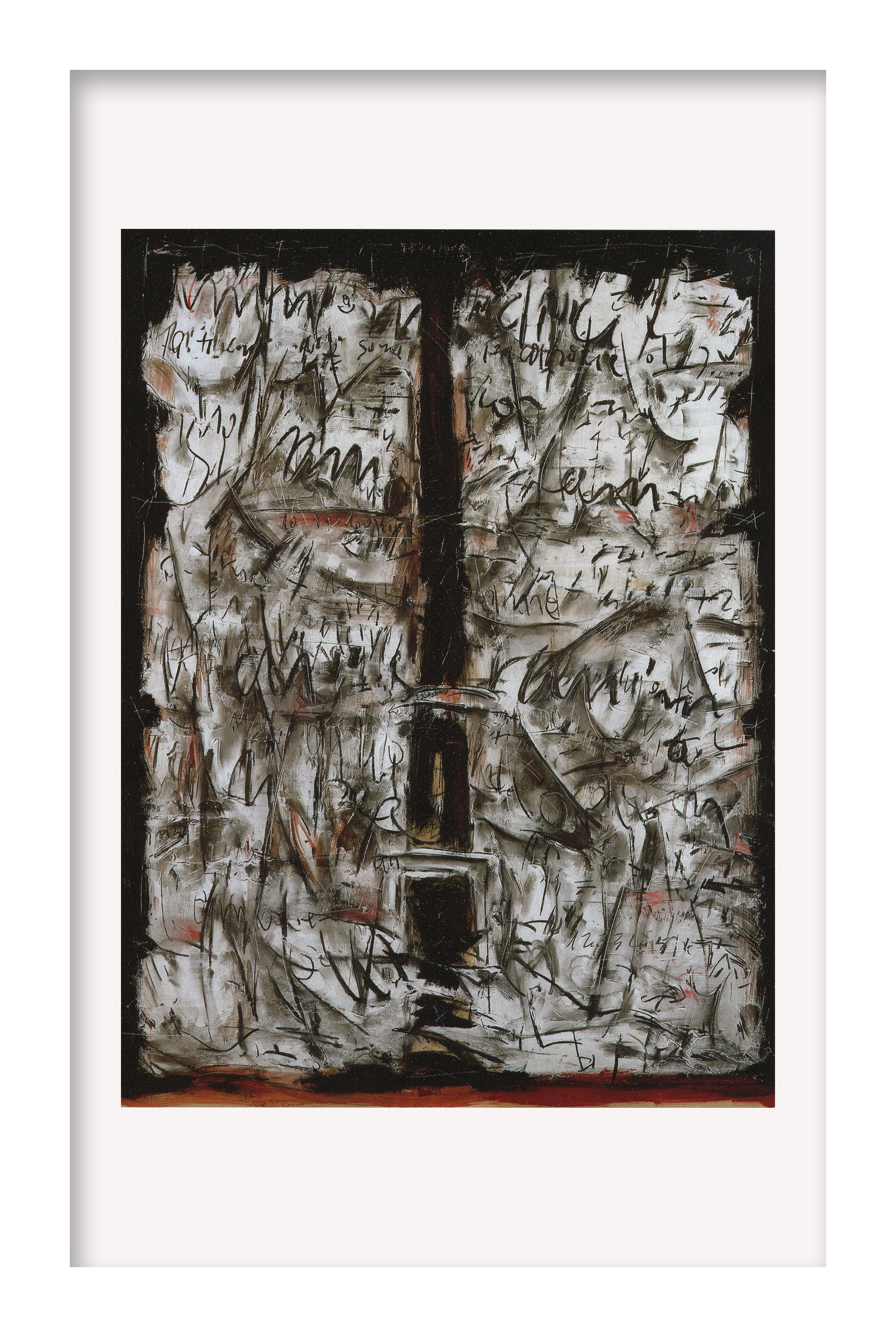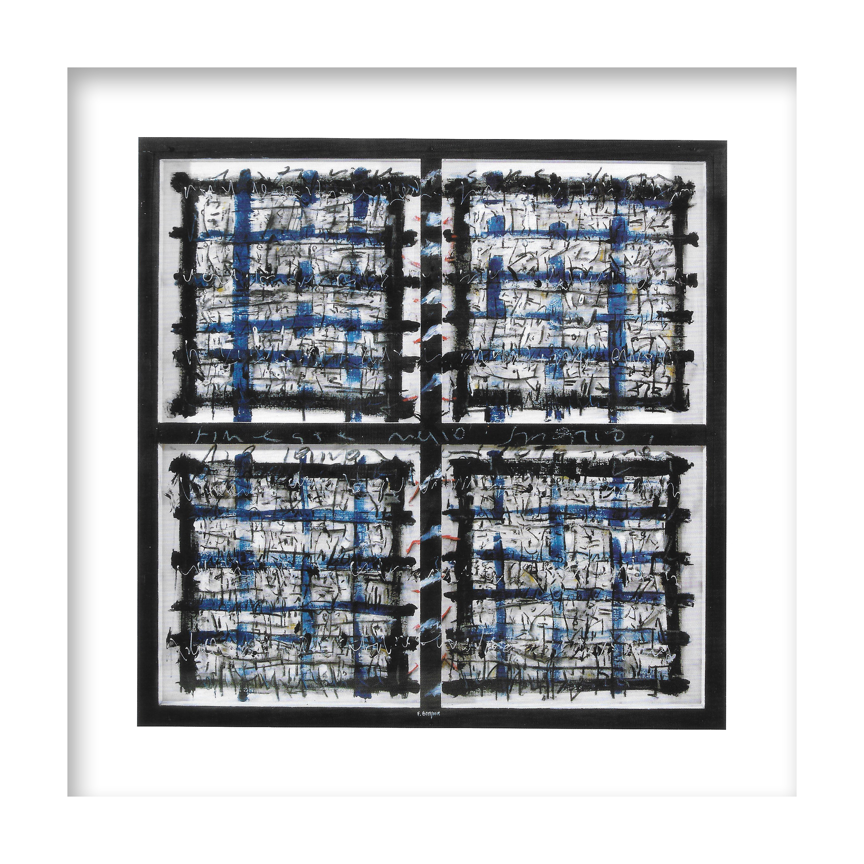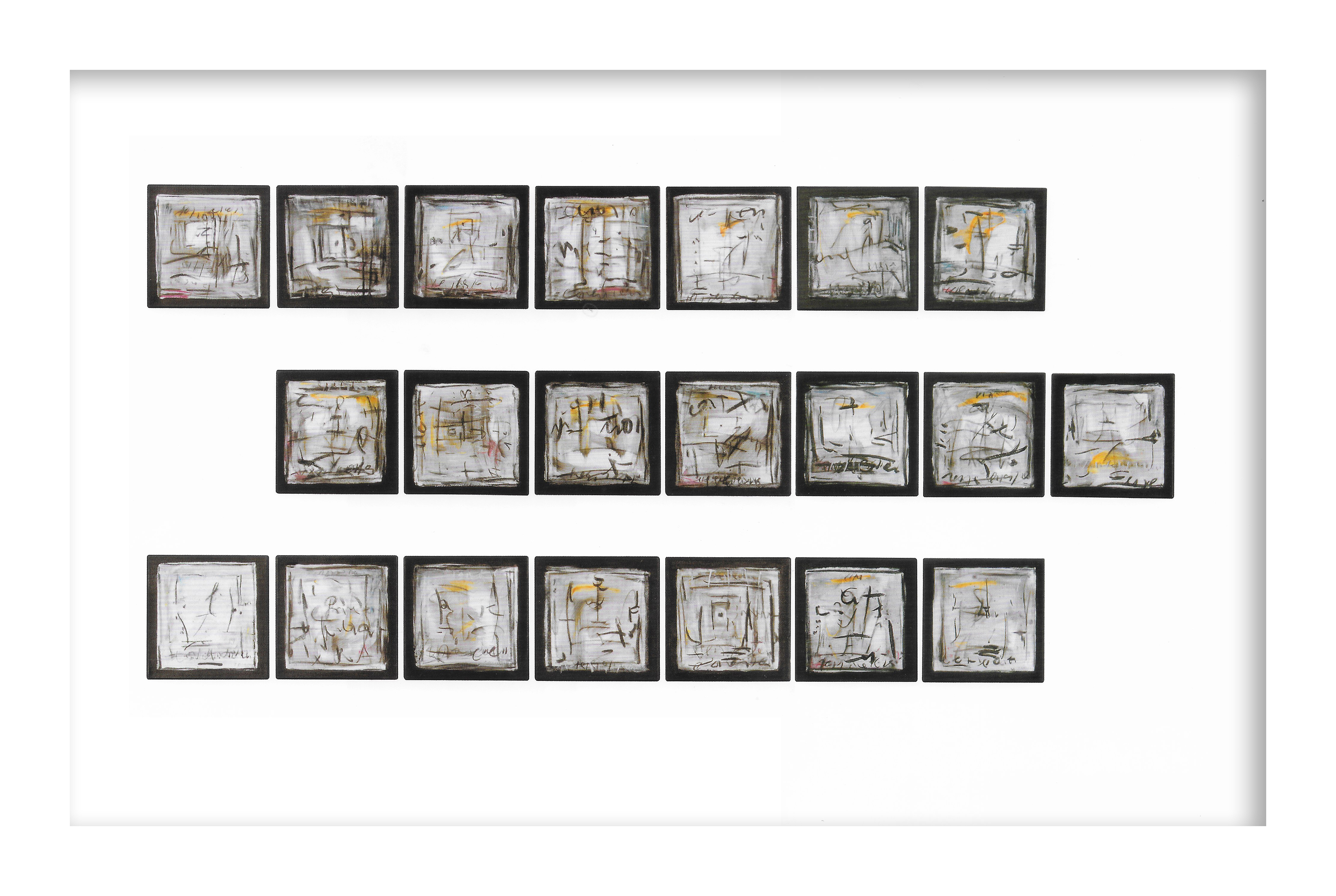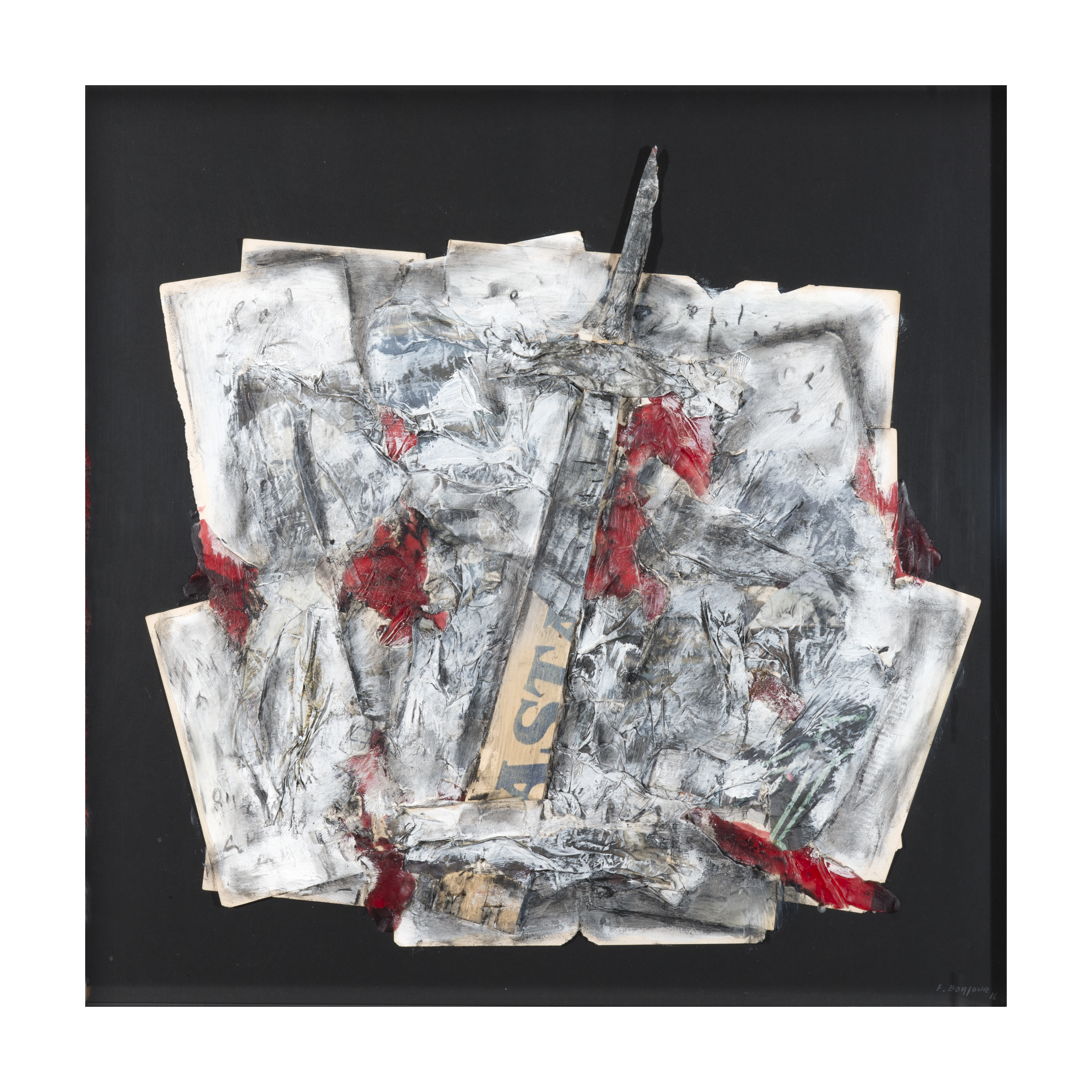 Bonjour adopts an expressive language of great material richness, juxtaposing heterogeneous elements with surprising harmony. His paintings often transcend the boundaries of the canvas, taking on an almost three-dimensional dimension thanks to the inclusion of unconventional objects and materials. On backgrounds prepared with mixed techniques, the artist applies sheets of paper, scraps of fabric, pages of books worn out by time, newspaper clippings, interweaving them with threads of string, ropes, wood fragments, red wax, broken glass and pigments. These poor materials - the 'skin of the city' as he ideally defines it - carry with them the echo of human presences, evoking lives and stories both past and future. Writing plays a central role in his compositions: elegant words and calligraphies appear, sometimes clearly legible, more often reduced to mysterious and indecipherable signs. This fusion of text and image recalls the legacy of Visual Poetry, but Bonjour reworks it in an entirely personal way. The written page is transformed into a visual element: it can be burnt at the edges, torn or covered with invented graphisms, becoming itself a surface to be contemplated. The combination of these verbal and iconic signs builds a dense and meaningful texture. Nothing is left to chance: the artist composes the different fragments with meticulous care, balancing solids and voids, light and dark, rigidity and fluidity. The result is works of refined elegance, in which the layering of materials creates physical and conceptual depth. Every detail - from the small piece of wax to a thin thread running through the paper - contributes to the overall meaning, inviting the observer into a silent conversation with the work. The result is a unique visual language, sober but incisive, capable of speaking on different levels: cultured and at the same time immediate, intimate and universal.