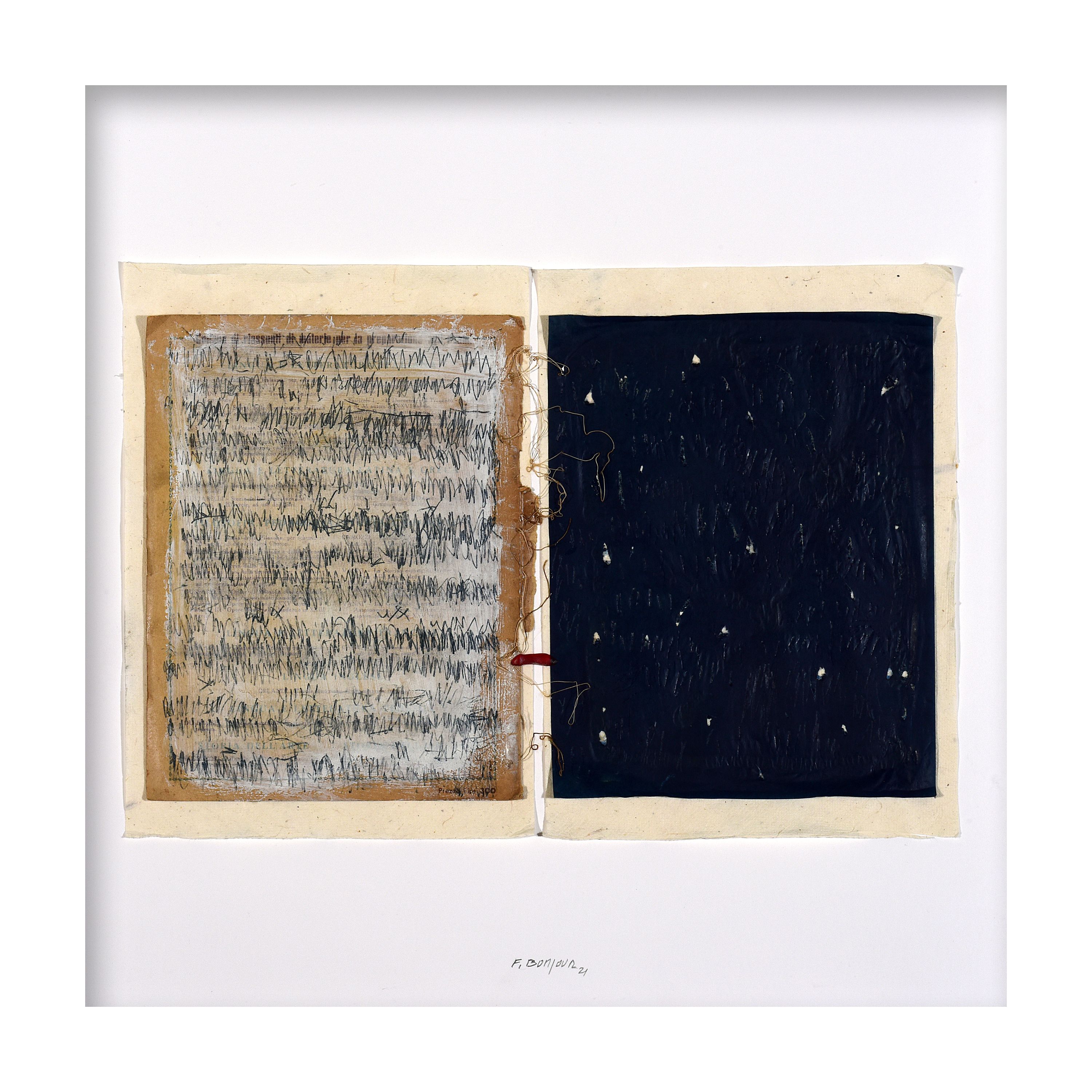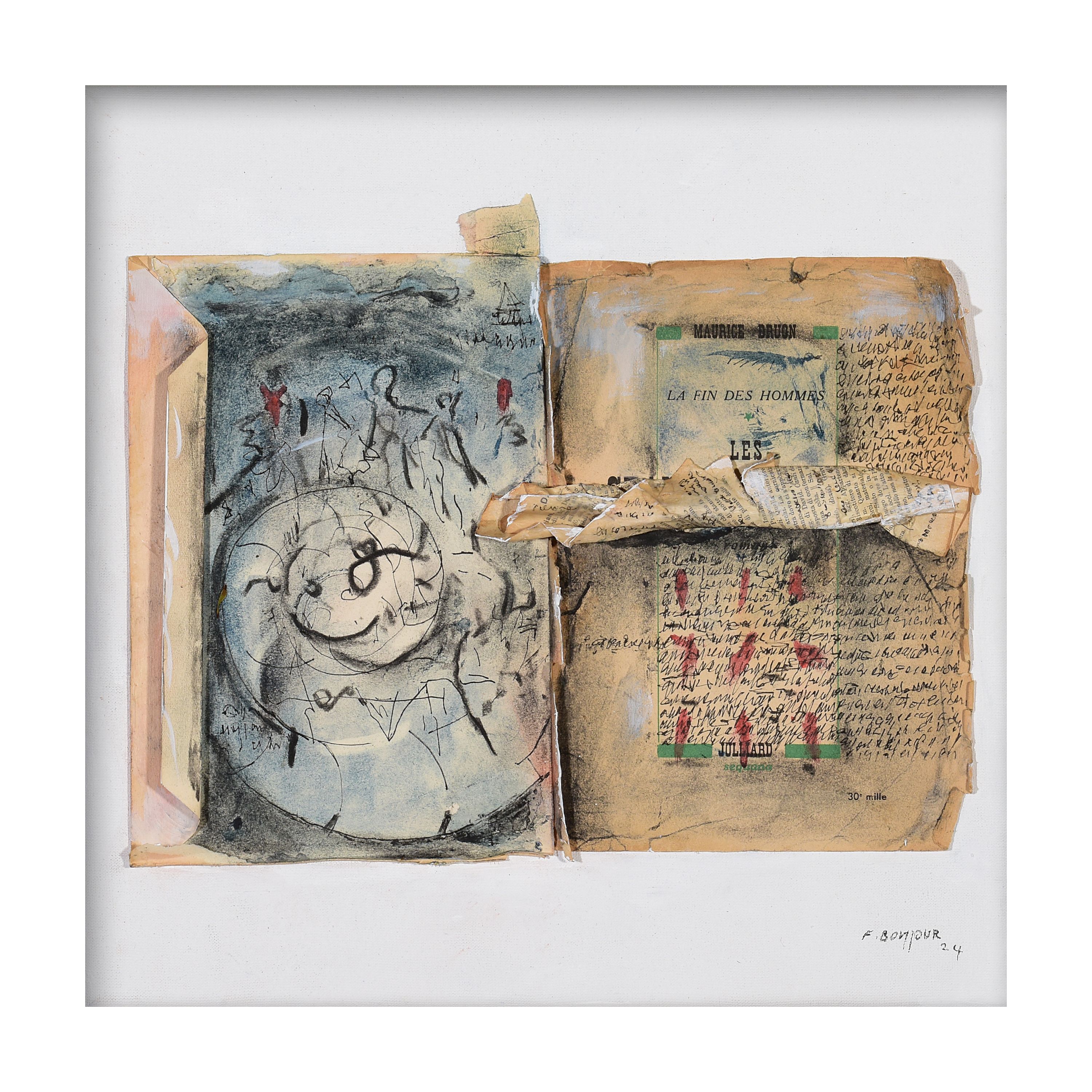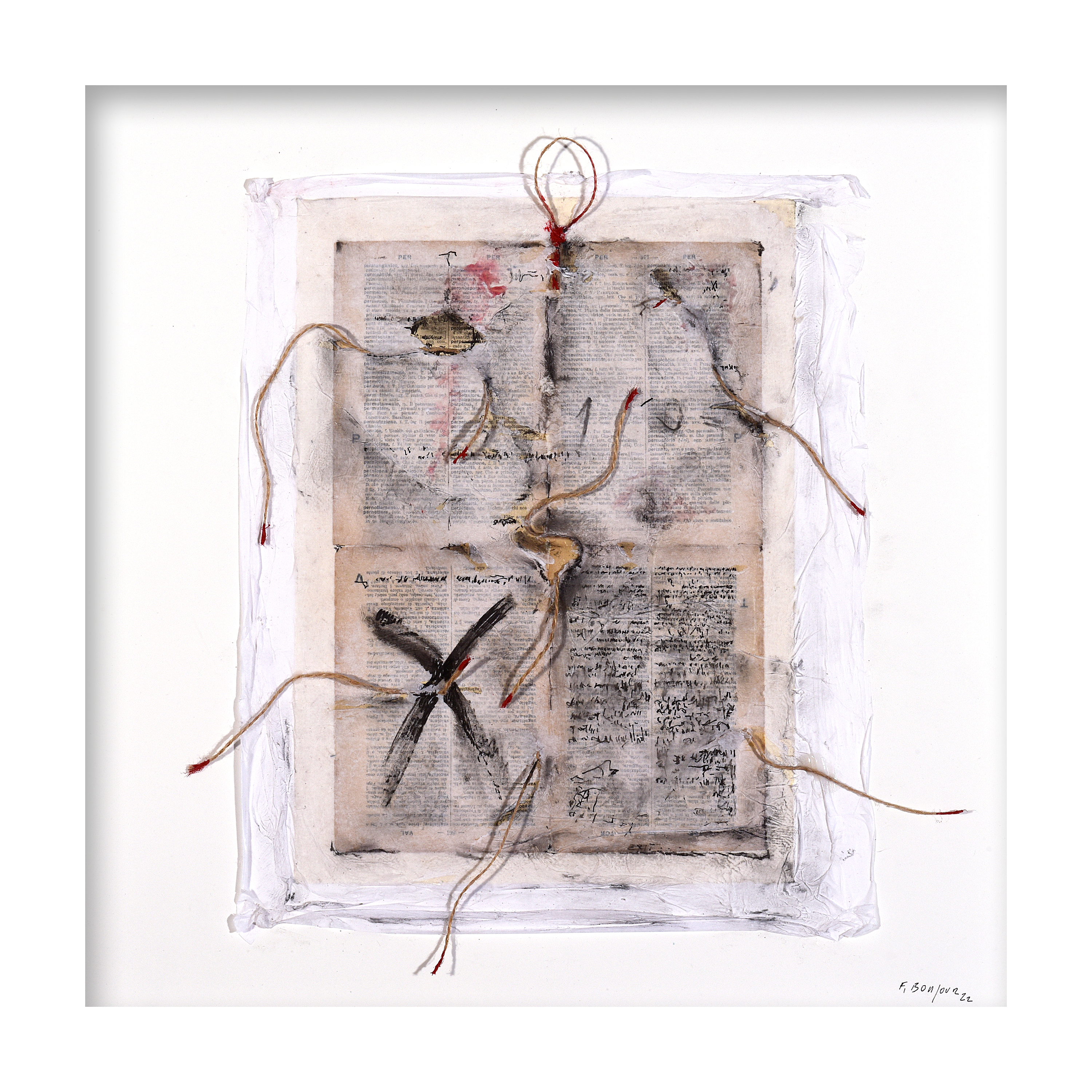 François Bonjour's creations stem from the idea that every fragment of reality can tell a story. His poetics are deeply linked to memory and time: ancient books, yellowed pages, letters and words emerge in his works as traces of past lives, to be saved from oblivion in an era dominated by digital technology. Each painting thus becomes a small story of existence, a “place” suspended between truth and vision where human imprints – the beauties and ruins of the world – take on new meanings. Bonjour draws on the literary universe to transfer its essence into her visual language: the book is seen as an everyday relic, a guardian of wisdom, the written page as a code to be deciphered, the word as an indelible trace of emotions. In her works, these elements are not mere quotations but narrative voices, tools of an intimate story that engages the viewer. The observer is invited to explore the work as a territory of memory, gradually discovering hidden levels of interpretation. This ability to tell stories, to transform materials into stories, has been a constant feature of Bonjour's artistic career since its beginnings in the 1970s. Despite his stylistic evolution, the artist has always remained faithful to his basic idea: to breathe new life into memories and traces of the past, composing them into a present full of poetry.