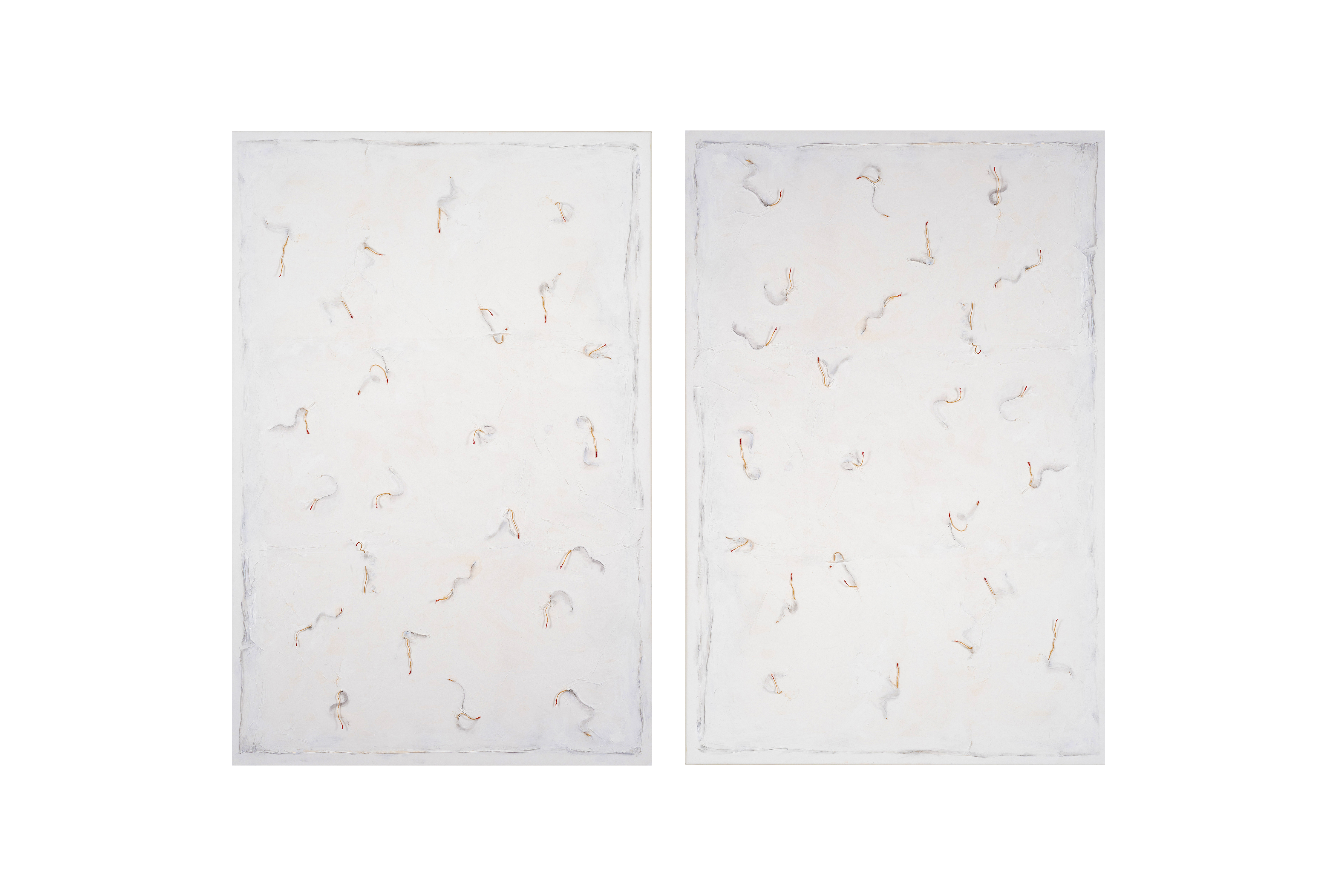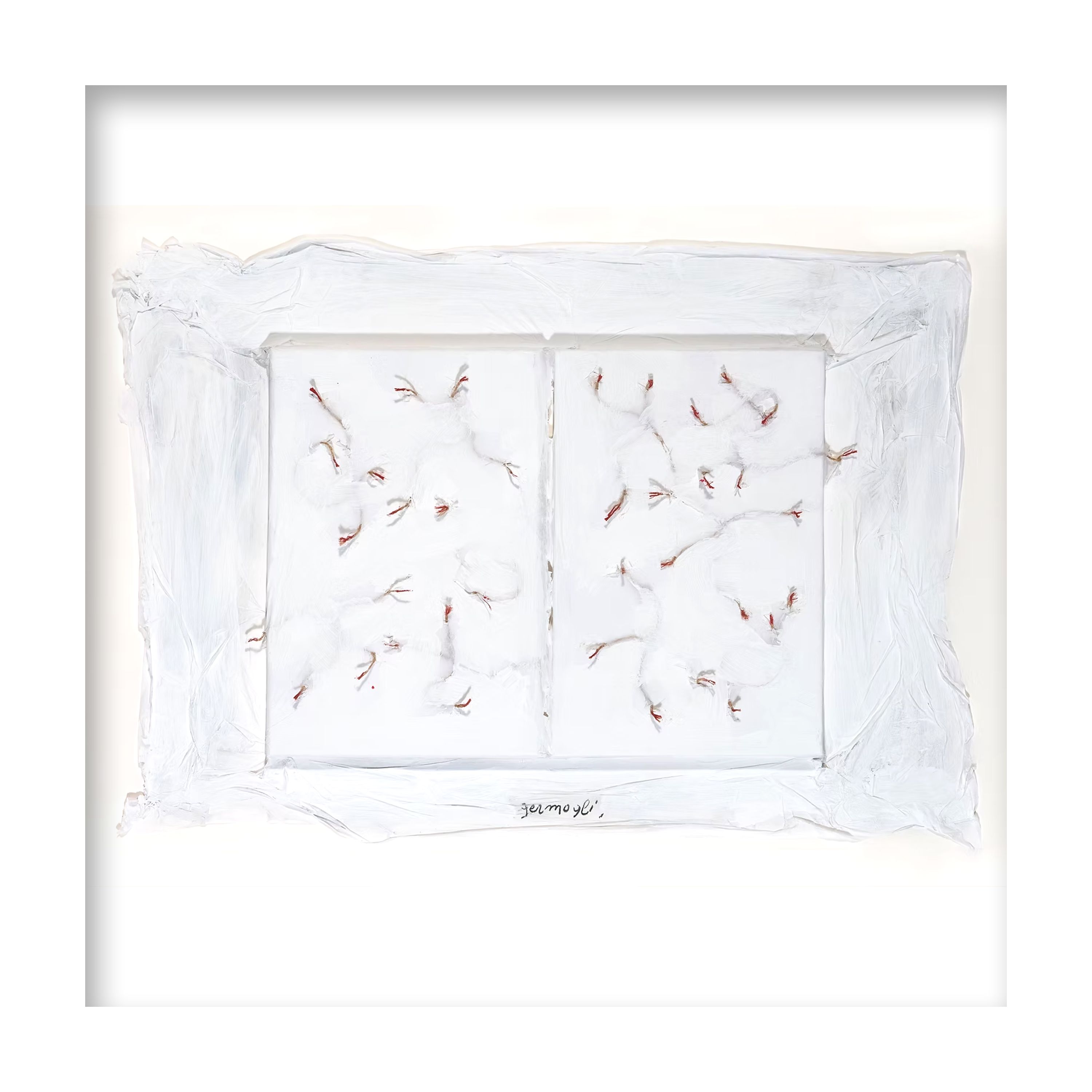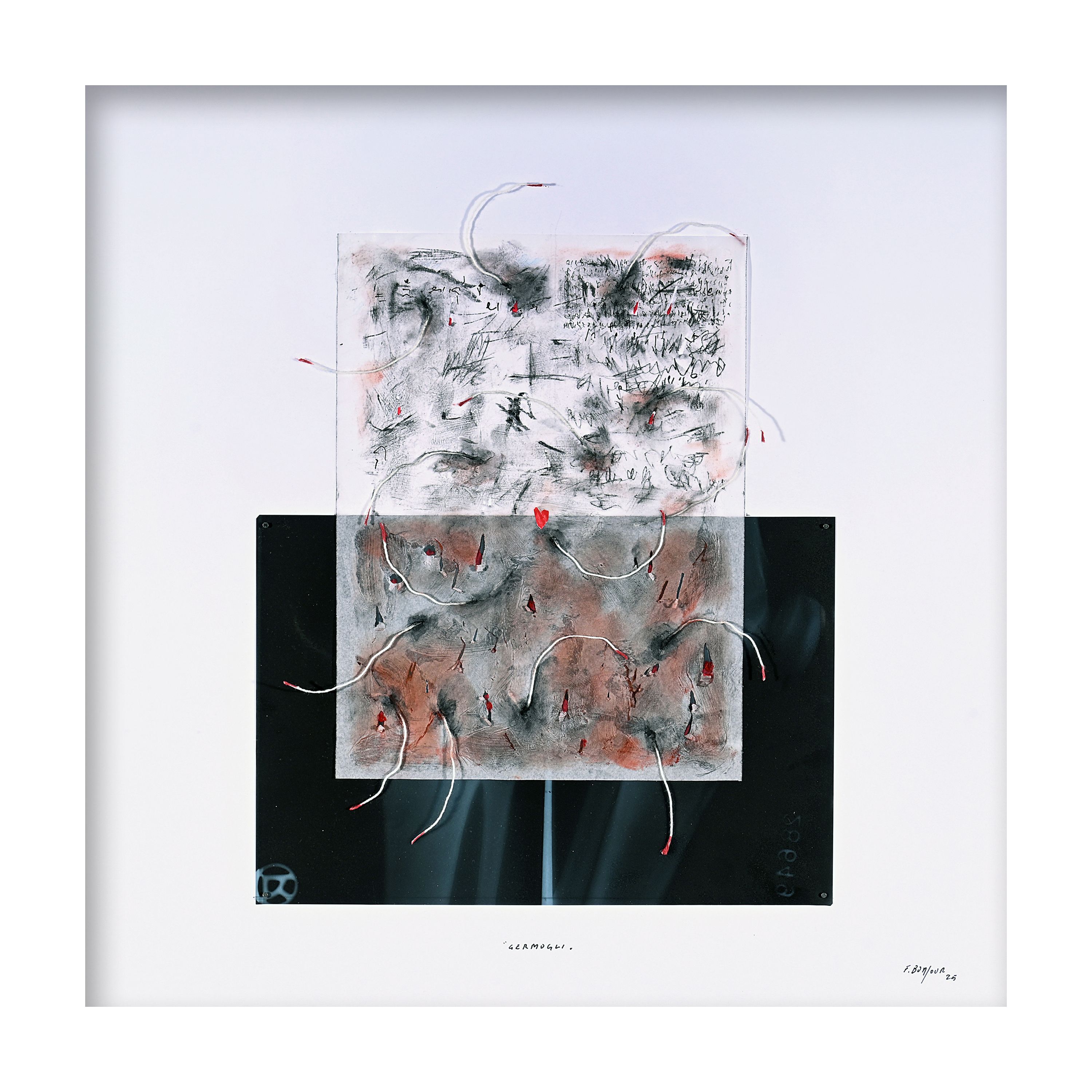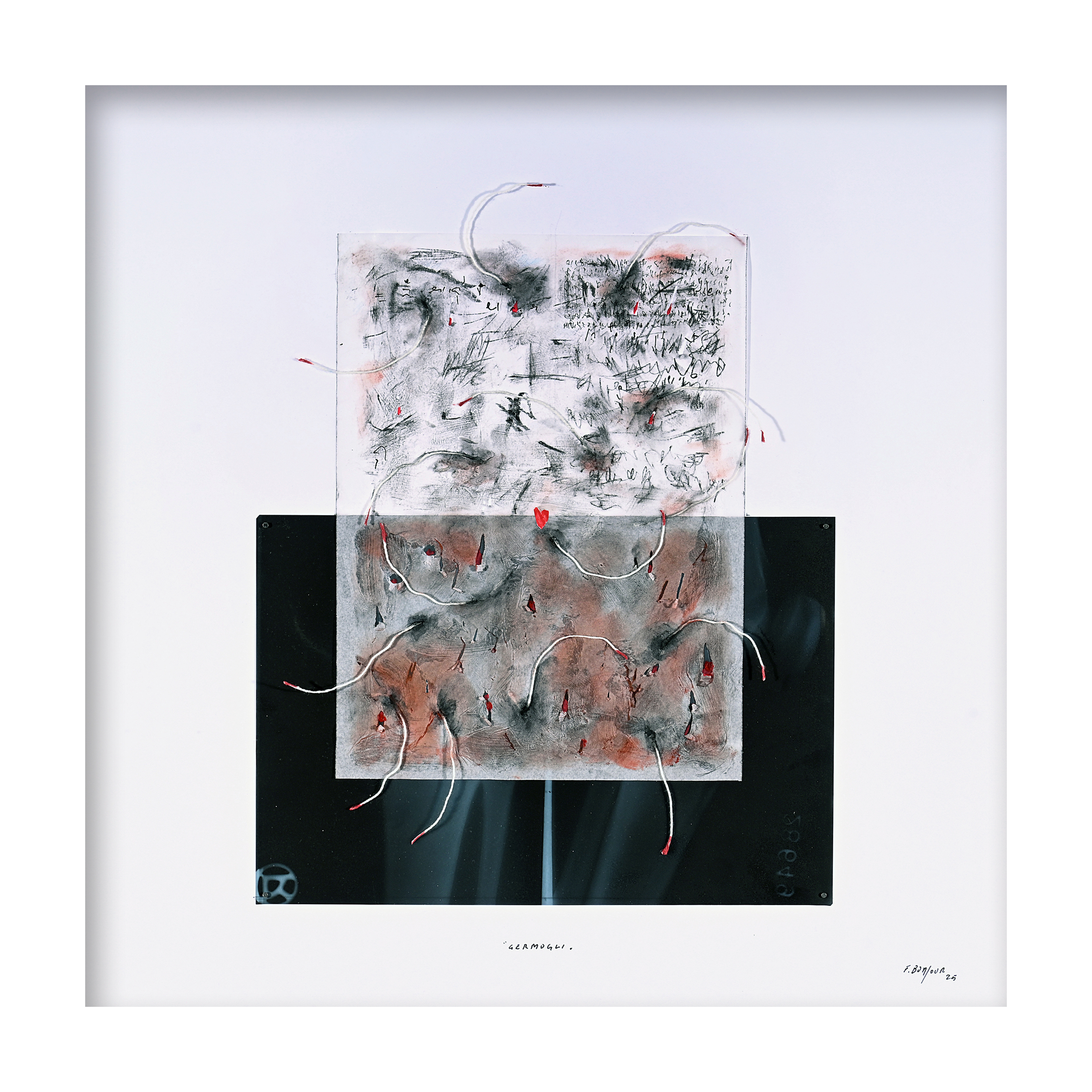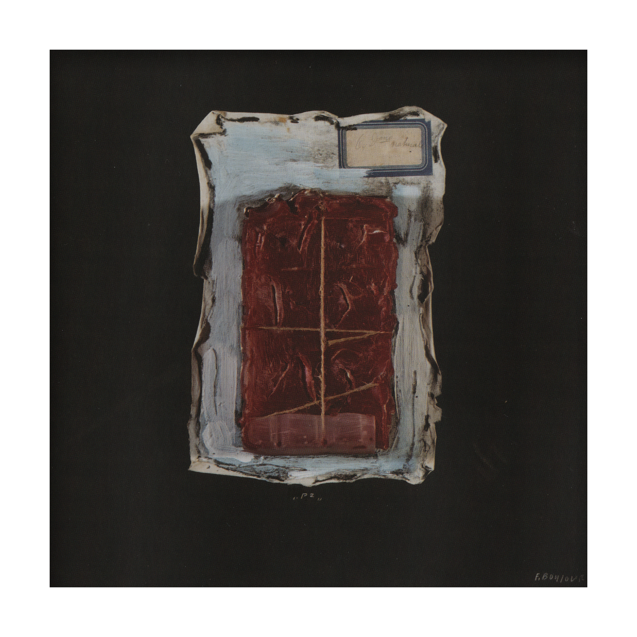 While maintaining an underlying coherence, François Bonjour's art has evolved over the decades through different cycles and experimentation. From his beginnings to the present day, the artist has been able to embrace new stimuli without ever betraying his own poetics. In some past phases, her compositions have presented more lively and pastel tones, with colour combinations almost like material patchwork. There have been periods in which Bonjour has worked on the recycling of books in object form: discarded volumes have been transformed into works of art, with pages stitched together, sealed in wax or filled with personal and enigmatic writing, as if the artist wanted to converse directly with those texts and bring them to new life. Around the end of the 2010s, new symbolic elements emerged in his canvases, such as thin red threads snaking beneath the white surface and surfacing here and there like sprouts of untold stories. At the same time, Bonjour has deepened his use of specific materials in cycles of serial works: a few years ago he explored carbon paper to obtain deep black fields scratched with light, while more recently he has turned his attention to a material as technological and at the same time intimate as X-ray film. Over the past two years, the artist has in fact often incorporated X-rays into his compositions, fascinated by the dual nature of these images: scientific tracings of the human body, but also subtle symbologies of what lies "beneath the surface" of things. This new experimentation with X-rays further enriches Bonjour's visual lexicon, adding transparencies and bluish tones to his usual earthy and neutral tones, and creating an evocative contrast between past and present, organic and technological. Even beyond easel painting, the artist tries his hand at installations and sculptures, keeping his themes intact: books imprisoned in metal cages, boards that become reliquary shrines of memories, or large-scale compositions that transform the exhibition space into a labyrinth of signs and objects. In each new creative phase, François Bonjour demonstrates a dynamic fidelity: he changes media, experiments with different formal solutions, but remains faithful to his vision. The common thread - the idea that art can unveil the essence hidden in humble, everyday things - unites all his works, making his path recognisable and at the same time always alive and surprising.